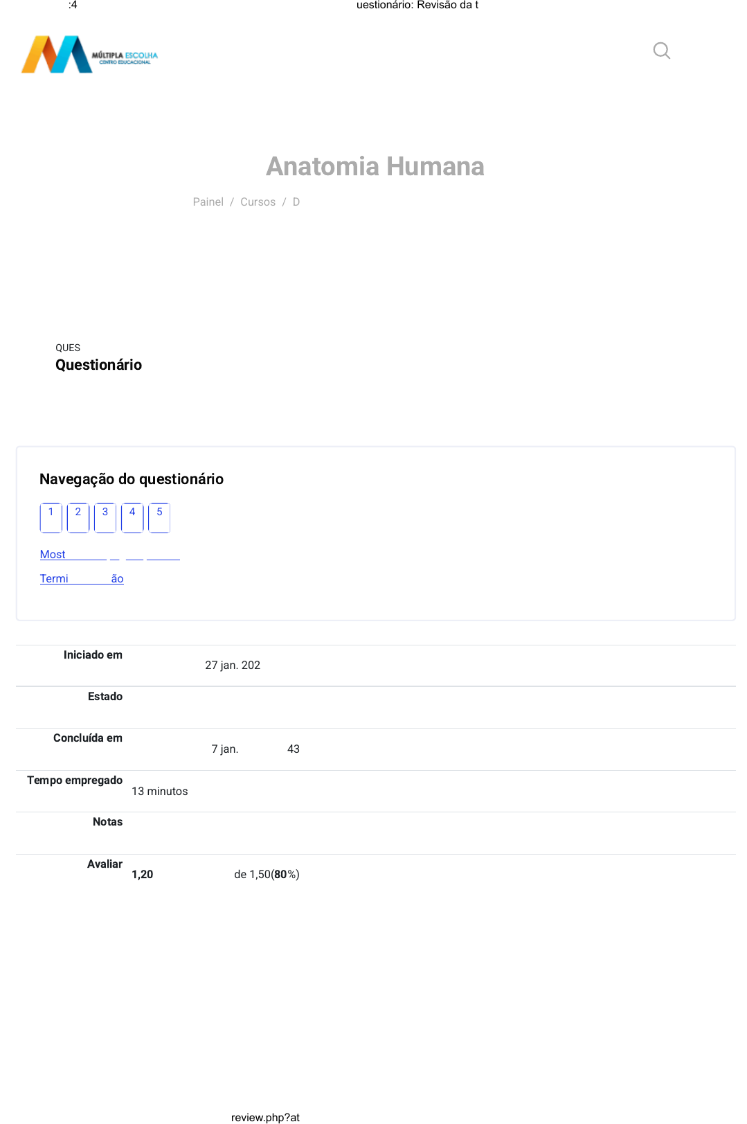 Anatomia Humana Painel / Cursos / Disciplinas / Anatomia… / Unidade 2 / Question… Iniciado em segunda-feira, 27 jan. 2025, 15:29 Estado Finalizada Concluída em segunda-feira, 27 jan. 2025, 15:43 Tempo empregado 13 minutos 47 segundos Notas 4,00/5,00 Avaliar 1,20 de um máximo de 1,50(80%) Navegação do questionário Mostrar uma página por vez Terminar revisão 1 2 3 4 5 QUESTIONÁRIO Questionário 27/01/2025, 15:44 Questionário: Revisão da tentativa | . https://ava.multiplaescolhaedu.com.br/mod/quiz/review.php?attempt=190366&cmid=1230 1/4 https://ava.multiplaescolhaedu.com.br/my/ https://ava.multiplaescolhaedu.com.br/course/index.php https://ava.multiplaescolhaedu.com.br/course/index.php?categoryid=1 https://ava.multiplaescolhaedu.com.br/course/view.php?id=143 https://ava.multiplaescolhaedu.com.br/course/view.php?id=143#section-2 https://ava.multiplaescolhaedu.com.br/mod/quiz/view.php?id=1230 https://ava.multiplaescolhaedu.com.br/mod/quiz/review.php?attempt=190366&cmid=1230&showall=0 https://ava.multiplaescolhaedu.com.br/mod/quiz/view.php?id=1230 https://ava.multiplaescolhaedu.com.br/ QUESTÃO Incorreto Atingiu 0,00 de 1,00 QUESTÃO Correto Atingiu 1,00 de 1,00 1 A cavidade glenóide é rasa, por isso algumas estruturas promovem a estabilização da cabeça do úmero dentro da cavidade glenóide. Assinale a alternativa que apresenta as estruturas. a. O ligamento costo-esternal e o músculo tríceps. b. O úmero e o rádio. c. A tíbia e a fíbula. d. Apenas os ligamentos, pois o músculo do manguito rotador não está tem ação na articulação gleno-umeral. e. Os ligamentos e os músculos do manguito rotador. A resposta correta é: Os ligamentos e os músculos do manguito rotador. 2 O músculo _______________ possui duas cabeças, a cabeça esternal, que se origina no manúbrio do esterno, e a cabeça clavicular, que se origina na face superior do terço medial da clavícula. Qual das opções abaixo preenche corretamente a lacuna? a. Piramidal. b. Platisma. c. Esternocleidomastoideo. A resposta está correta, pois o músculo esternocleidomastoideo possui duas cabeças: a cabeça esternal, que se origina no manúbrio do esterno, e a cabeça clavicular, que se origina na face superior do terço medial da clavícula. d. Bíceps. e. Tríceps. A resposta correta é: Esternocleidomastoideo. 27/01/2025, 15:44 Questionário: Revisão da tentativa | . https://ava.multiplaescolhaedu.com.br/mod/quiz/review.php?attempt=190366&cmid=1230 2/4 QUESTÃO Correto Atingiu 1,00 de 1,00 QUESTÃO Correto Atingiu 1,00 de 1,00 3 Os músculos __________ e _____________ realizam a extensão do cotovelo. Eles estão localizados no compartimento ____________ do braço. Assinale a alternativa que preenche corretamente essas lacunas. a. Tríceps e ancôneo; posterior. A resposta está correta, pois os músculos tríceps e ancôneo realizam a extensão do cotovelo e eles estão localizados no compartimento posterior. b. Tríceps e bíceps; posterior. c. Tríceps e deltoide; posterior. d. Tríceps e ancôneo; anterior. e. Tríceps e ancôneo; lateral. A resposta correta é: Tríceps e ancôneo; posterior. 4 Na cavidade torácica existem diversos músculos envolvidos com a respiração. Assinale a opção abaixo que contém o nome do principal músculo da respiração, responsável por expandir a cavidade torácica durante a inspiração. a. Esternocleidomastoideo. b. Subescapular. c. Diafragma. A resposta está correta, pois o diafragma é o músculo responsável pela expansão da caixa torácica durante a inspiração. d. Intercostal interno. e. Genioglosso. A resposta correta é: Diafragma. 27/01/2025, 15:44 Questionário: Revisão da tentativa | . https://ava.multiplaescolhaedu.com.br/mod/quiz/review.php?attempt=190366&cmid=1230 3/4 QUESTÃO Correto Atingiu 1,00 de 1,00 5 A articulação intermetatarsal ocorre entre as bases dos metatarsos e é estabilizada pelos ligamentos dorsais, plantares e interósseos. Assinale a opção a seguir que contém o nome do tipo da articulação intermetatarsal. a. Esferoide. b. Plana. A resposta está correta, pois a articulação intertermetatarsal é do tipo plana. c. Gínglimo. d. Esfera e soquete. e. Selar. A resposta correta é: Plana. ◄ Trilha de Aprendizagem Seguir para... Trilha de Aprendizagem ► 27/01/2025, 15:44 Questionário: Revisão da tentativa | . https://ava.multiplaescolhaedu.com.br/mod/quiz/review.php?attempt=190366&cmid=1230 4/4 https://ava.multiplaescolhaedu.com.br/mod/scorm/view.php?id=1229&forceview=1 https://ava.multiplaescolhaedu.com.br/mod/scorm/view.php?id=1231&forceview=1