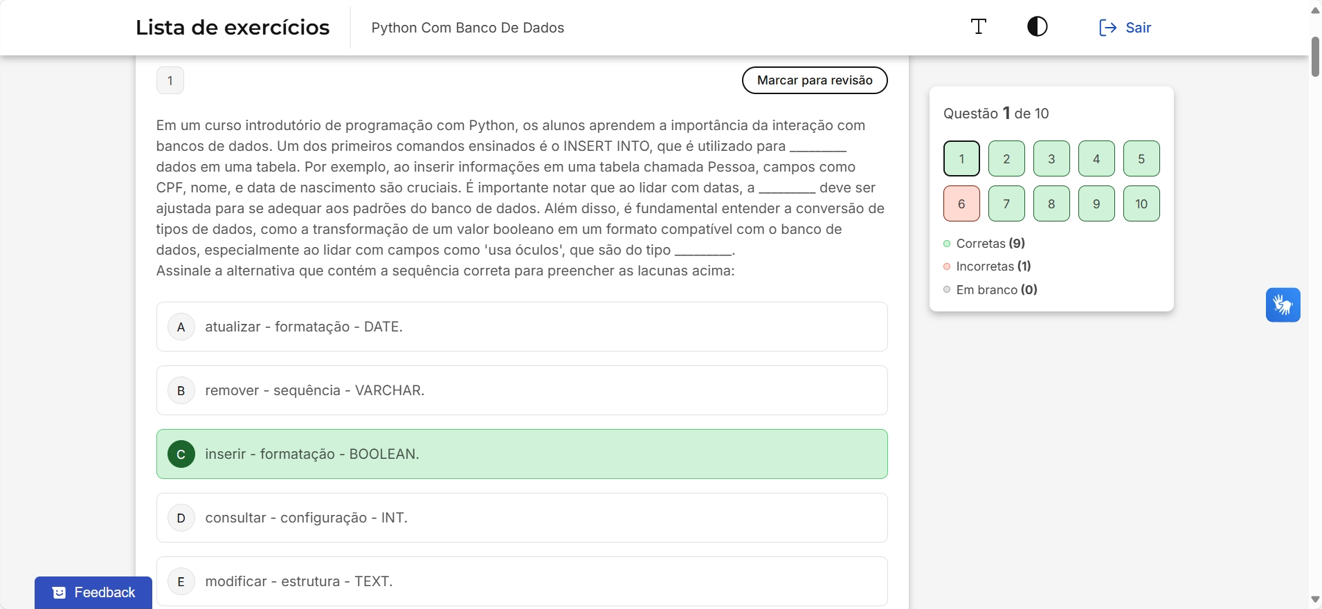 Lista de exercícios Python Com Banco De Dados T Sair 1 Marcar para revisão Questão 1 de 10 Em um curso introdutório de programação com Python, os alunos aprendem a importância da interação com bancos de dados. Um dos primeiros comandos ensinados é o INSERT INTO, que é utilizado para 1 2 3 4 5 dados em uma tabela. Por exemplo, ao inserir informações em uma tabela chamada Pessoa, campos como CPF, nome, e data de nascimento são cruciais. É importante notar que ao lidar com datas, a deve ser ajustada para se adequar aos padrões do banco de dados. Além disso, é fundamental entender a conversão de 6 7 8 9 10 tipos de dados, como a transformação de um valor booleano em um formato compatível com o banco de Corretas (9) dados, especialmente ao lidar com campos como 'usa óculos', que são do tipo Assinale a alternativa que contém a sequência correta para preencher as lacunas acima: Incorretas (1) Em branco (0) A atualizar - formatação - DATE. B remover - sequência - VARCHAR. C inserir - formatação - BOOLEAN. D consultar - configuração - INT. E modificar - estrutura - TEXT. Feedback