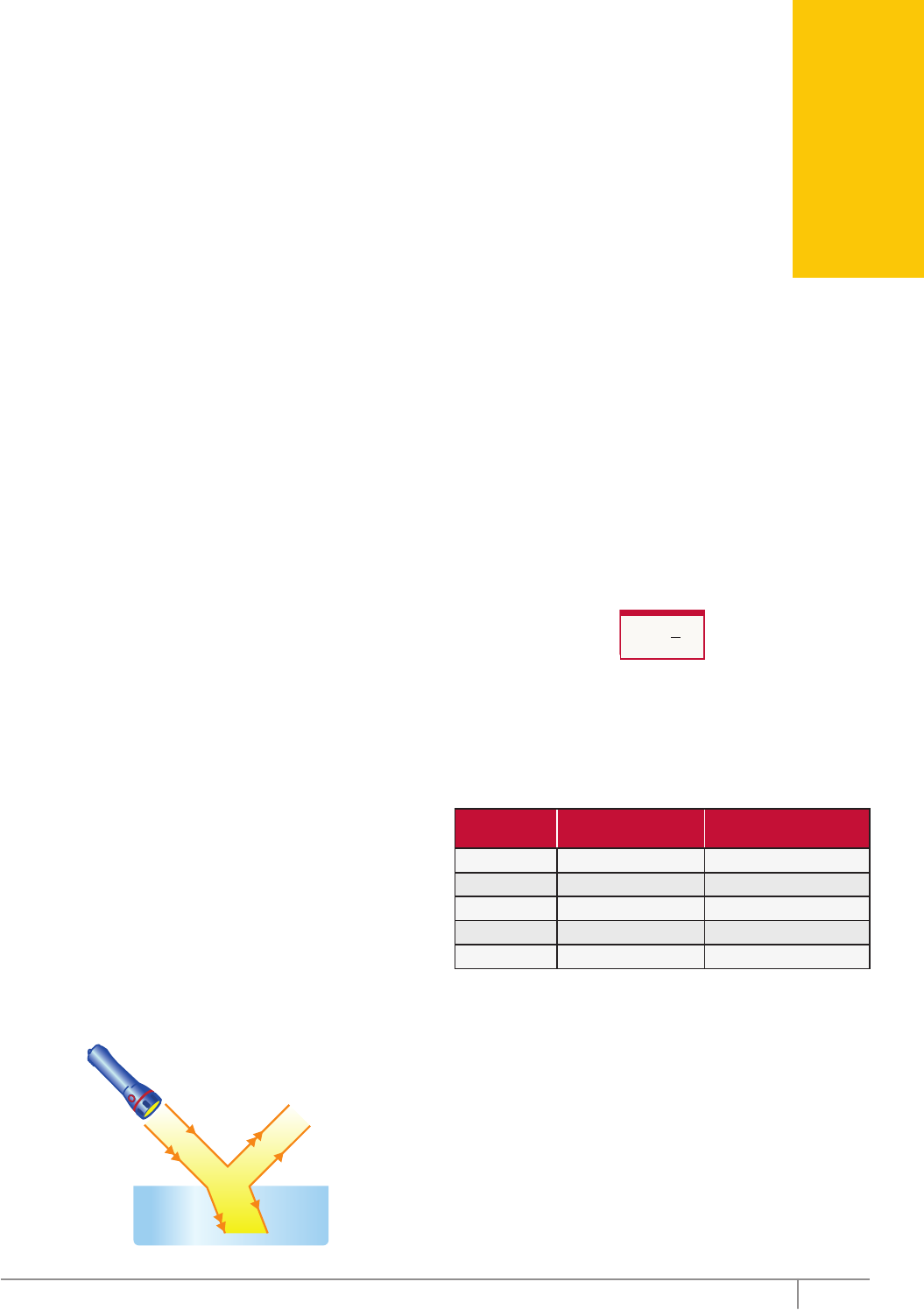 57Editora Bernoulli MÓDULO A velocidade com que a luz de uma dada cor se propaga em um meio transparente é, na maioria das vezes, específica de cada meio. A refração é o fenômeno pelo qual a luz, ao passar de um meio de propagação para outro, diferente do primeiro, altera, necessariamente, o módulo de sua velocidade de propagação. Podemos enxergar um objeto através de uma substância transparente, como uma lente, uma placa de vidro ou uma porção de água, em decorrência da refração. Esse fenômeno é responsável pelo funcionamento das lentes, de alguns aparelhos de observação e de projeção e, também, pelo funcionamento dos instrumentos que usam a fibra óptica, para citar apenas alguns exemplos. O fenômeno de refração pode, também, explicar a formação e as cores de um arco-íris. Já vimos que cada radiação luminosa (cor de luz) é caracterizada por uma frequência (f), e sabemos que um objeto vermelho, por exemplo, mantém a sua cor dentro de qualquer substância transparente. Assim, podemos inferir que a frequência da luz não é alterada quando esta sofre refração. Uma grandeza importante de cada onda luminosa é o comprimento de onda (λ). Para o estudo deste módulo, devemos saber, inicialmente, que o comprimento de onda (λ) da luz, dentro de uma dada substância, é inversamente proporcional à sua frequência (f). Vamos considerar, por ora, que a luz é constituída de uma só radiação (única cor), ou seja, ela é monocromática. Alguns fenômenos só ocorrem com a presença de luz policromática (formada por radiações de várias cores) e, quando for o caso, isso será especificado. A figura a seguir mostra a luz amarela de uma lanterna que incide em uma placa de vidro. Veja que parte da luz sofre reflexão (continua se propagando no ar) após atingir a superfície do vidro. Os feixes incidente e refletido apresentam a mesma velocidade de propagação (vAr). Ar Vidro vAr vAr vVidro Observe, ainda, que uma parcela da luz passa do ar para o vidro, ou seja, sofre refração. Dentro do vidro, a velocidade de propagação da luz (vVidro) é diferente da sua velocidade de propagação no ar. A velocidade da luz no vácuo (c) é constante, e possui o maior valor em relação a qualquer outro meio de propagação, sendo igual a, aproximadamente, c = 3,0 x 108 m/s. Dessa forma, quando a luz adentrar em uma substância qualquer, vinda do vácuo, a sua velocidade será reduzida. A grandeza que caracteriza a influência de um dado meio na velocidade de propagação da luz, de certa frequência, é o índice de refração absoluto (n) da substância. Esse índice é definido como a razão entre as velocidades da luz no vácuo (c) e na substância (v), ou seja: n = c v Conforme a definição, o índice de refração absoluto do vácuo é n = 1. A tabela a seguir mostra os valores aproximados da velocidade da luz e dos índices de refração absolutos de alguns meios (para a luz amarela do sódio). Os valores podem variar com as impurezas e com as misturas contidas no material e, para os fluidos, também com a temperatura. Meio Velocidade da luz (v) Índice de refração absoluto (n) Ar ≅ 3,0 x 108 m/s ≅ 1,0 Água 2,250 x 108 m/s 1,333 Vidro ≅ 1,980 x 108 m/s 1,515 Diamante 1,241 x 108 m/s 2,417 Rutilo 1,073 x 108 m/s 2,795 Três conclusões importantes devem ser tiradas da definição e tabela anteriores. 1. A velocidade da luz em qualquer meio (v) é inversamente proporcional ao índice de refração (n) desse meio, uma vez que a velocidade da luz no vácuo é constante. 2. O ar pode ser considerado como apresentando o menor índice de refração entre todas as substâncias. O seu valor (nAr ≅ 1,0) é importante e deve ser conhecido. 3. O índice de refração (n) é um número adimensional (sem unidade de medição acompanhando seu valor numérico), uma vez que é a razão entre duas velocidades. FÍSICA FRENTE Refração da luz 04 C 58 Coleção Estudo Frente C Módulo 04 O índice de refração absoluto (n) de um meio indica o quanto a velocidade de propagação da luz é reduzida, em relação a seu valor no vácuo, quando a luz se propaga nesse meio. Considere uma substância de índice de refração n = 3. Isso quer dizer que a velocidade da luz nessa substância é três vezes menor que no vácuo. Ou seja, a velocidade será v = 1,0 x 108 m/s. É comum usar o termo “meio muito refringente” para expressar que o índice de refração de um meio apresenta um valor elevado. Para se referir a um meio cujo índice de refração seja pequeno, é usado o termo “meio pouco refringente”. Assim, o rutilo é o meio mais refringente entre aqueles listados na tabela anterior. As leis da refração Quando um feixe de luz incide em uma substância, ele sofre, na maioria das vezes, refração, reflexão e absorção. Neste módulo, vamos considerar apenas a refração da luz, quando esta incide sobre a superfície de separação de dois meios. Se a reflexão ou a absorção forem importantes para a situação em questão, isso será especificado. A figura a seguir mostra um raio de luz que passa do ar (meio 1) para o vidro (meio 2). Observe, nesse caso, que os raios incidente e refratado têm direções diferentes. v1 θ1 θ2 v2 RI RRN N Vidro (2) Ar (1) n1 n2 Na figura, temos, respectivamente: • Ar (1) e vidro (2) – meios 1 e 2; • RI e RR – raios incidente e refratado; • v1 e v2 – velocidade da luz nos meios 1 e 2; • θ1 e θ2 – ângulos de incidência e de refração (em relação à normal); • N – reta normal (perpendicular à superfície no ponto de incidência da luz). As leis que regem a refração são: 1ª: O raio incidente, o raio refratado e a reta normal são coplanares. 2ª: (Lei de Snell): Os ângulos formados pelos raios incidente e refratado com a reta normal (θ1 e θ2), os índices de refração (n1 e n2) e os módulos das velocidades de propagação (v1 e v2) nos meios 1 e 2, respectivamente, se relacionam pel