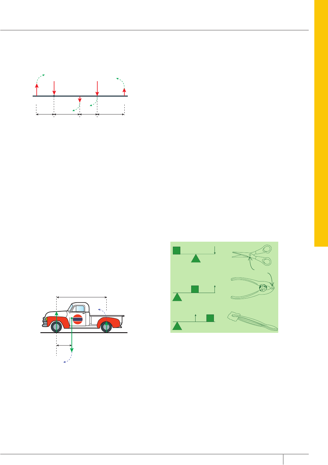 FÍ SI C A 33Editora Bernoulli dos pneus dianteiros podem ser representadas por uma única força FD. O mesmo ocorre nos pneus traseiros, cuja carga é a força FT. A figura seguinte ilustra a distribuição de forças na plataforma. 1,5 m1,5 m FD FT PP = 2,0 kN D 1,0 m1,0 m NA = 20 kN NB = 12 kN Tomando o ponto D como referência, os momentos das forças NA , PP e FT tendem a girar a plataforma no sentido horário, enquanto o momento da força normal NB tende a girar a plataforma no sentido anti-horário, conforme está indicado na figura. A força FD não exerce momento em relação ao ponto D porque a sua linha de ação passa por esse ponto. Ao igualarmos os momentos nos dois sentidos, obtemos: 20.1,0 + 2,0.1,5 + FT.2,5 = 12.4 Resolvendo essa equação, obtemos FT = 10 kN. Para calcular a força exercida pelos pneus dianteiros, podemos simplesmente igualar a soma das forças voltadas para baixo com a soma das forças voltadas para cima. Fazendo isso, obtemos: FD + 2,0 + 10 = 20 + 12 ⇒ FD = 20 kN A soma FD + FT é igual ao módulo do peso da caminhonete. A resultante das forças normais exercidas sobre os pneus dianteiros e traseiros possui módulo igual ao da força resultante de compressão exercida pelos pneus dianteiros e traseiros sobre a plataforma, 20 kN e 10 KN, respectivamente. A figura seguinte mostra a distribuição de forças no veículo. ND = 20 kN NT = 10 kN P = 30 kN 2,5 m x CG Em relação ao ponto de contato das rodas dianteiras com o solo, o peso da caminhonete tende a girá-la no sentido horário, enquanto a normal na parte traseira tende a girá-la no sentido anti-horário. A força normal dianteira não exerce momento porque ela passa pelo eixo de referência. A igualdade entre os momentos nos dois sentidos permite calcular x, a distância entre o CG da caminhonete e o eixo dianteiro: 30.x = 10.2,5 ⇒ x = 0,83 m = 83 cm Portanto, o centro da gravidade da caminhonete acha-se a 83 cm do eixo dianteiro e a 167 cm do eixo traseiro. ALAVANCAS Uma alavanca é um elemento rígido que pode girar em torno de um ponto de apoio. Ao exercermos uma força sobre uma alavanca, fazemos aparecer, em outra posição do sistema, uma força capaz de erguer, cortar, esmagar ou simplesmente sustentar algum objeto. Quando cortamos papel com uma tesoura ou pegamos um objeto com uma pinça, estamos usando alavancas. Quando movemos uma pedra com um pedaço de pau apoiado em algum ponto, estamos usando a alavanca mais simples e popular de todas, provavelmente a primeira máquina criada pelo homem. Quando caminhamos ou levantamos algum peso com as mãos, estamos usando alavancas naturais presentes em nosso próprio corpo. Além do ponto de apoio, toda alavanca possui um ponto de ação e um ponto de resistência. O ponto de ação ou potência é onde exercemos a força para acionar a alavanca. O ponto de resistência é onde se acha o corpo a ser cortado, esmagado, etc. O ponto de apoio está associado ao eixo de rotação da alavanca. De acordo com as posições desses pontos, uma alavanca pode ser classificada em três tipos: interfixa, inter-resistente e interpotente. A figura 5 mostra esquemas dessas três alavancas e ilustra exemplos práticos de cada uma. A) B) C) Resistência Resistência Resistência Apoio Apoio Apoio Apoio Apoio Ação Ação Ação Figura 5: A) Alavanca interfixa (tesoura), B) inter-resistente (quebra-nozes) e C) interpotente (pinça). A vantagem mecânica de uma alavanca é definida pela razão VM = R/F, sendo R e F os módulos das forças nos pontos de resistência e de ação da alavanca, respectivamente. Quando VM > 1, a alavanca multiplica o esforço nela aplicado, ou seja, R > F. Para uma alavanca com VM 1 e outra com VMP. D) TE P. Frente B Módulo 08 FÍ SI C A 35Editora Bernoulli 03. (UERJ–2006) Para demonstrar as condições de equilíbrio de um corpo extenso, foi montado o experimento a seguir, em que uma régua, graduada de A a M, permanece em equilíbrio horizontal, apoiada no pino de uma haste vertical. Régua Pino Haste A B C D E F G H I J K L M Um corpo de massa 60 g é colocado no ponto A, e um corpo de massa 40 g é colocado no ponto I. A B C D E F G H I J K L M 60g 40g ? Para que a régua permaneça em equilíbrio horizontal, a massa do corpo, em gramas, que deve ser colocado no ponto K é de A) 90. B) 70. C) 40. D) 20. 04. (UERJ) F I II Na figura anterior, o ponto F é o centro de gravidade da vassoura. A vassoura é serrada no ponto F e dividida em duas partes: I e II. A relação entre os pesos PI e PII, das partes I e II, respectivamente, é representada por A) PI = PII. C) PI = 2PII. B) PI > PII. D) PI . Admita que 55% do peso total do trator são exercidos sobre os pontos de contato dos pneus dianteiros com o solo (2) e o restante sobre os pontos de contato dos pneus traseiros com o solo (1). DETERMINE a abscissa x do centro de gravidade desse trator em relação ao ponto 1. Adote g = 10 m/s2 e dê a resposta com dois algarismos significativos. EXERCÍCIOS PROPOSTOS 01. (UERJ) Para abrir uma porta, você aplica sobre a maçaneta, colocada a uma distância D da dobradiça, conforme a figura a seguir, uma força de módulo F perpendicular à porta. d Para obter o mesmo efeito, o módulo da força que você deve aplicar em uma maçaneta colocada a uma distância d/2 da dobradiça dessa mesma porta é A) F/2. C) 2F. B) F. D) 4F. 02. (FUVEST-SP–2009) Em uma academia de musculação, uma barra B, com 2,0 m de comprimento e massa de 10 kg, está apoiada de forma simétrica em dois suportes, S1 e S2, separados por uma distância de 1,0 m, como indicado na figura. Para a realização de exercícios, vários discos, de diferentes massas M, podem ser colocados em encaixes, E, com seus centros a 0,10 m de cada extremidade da barra. O primeiro disco deve ser escolhido com cuidado para não desequilibrar a barra. M EE 0,10 m 0,5 m 0,5 m 0,5 m 0,5 m S2 S1 B g Entre os discos disponíveis, cujas massas estão indicadas a seguir, aquele de maior mas