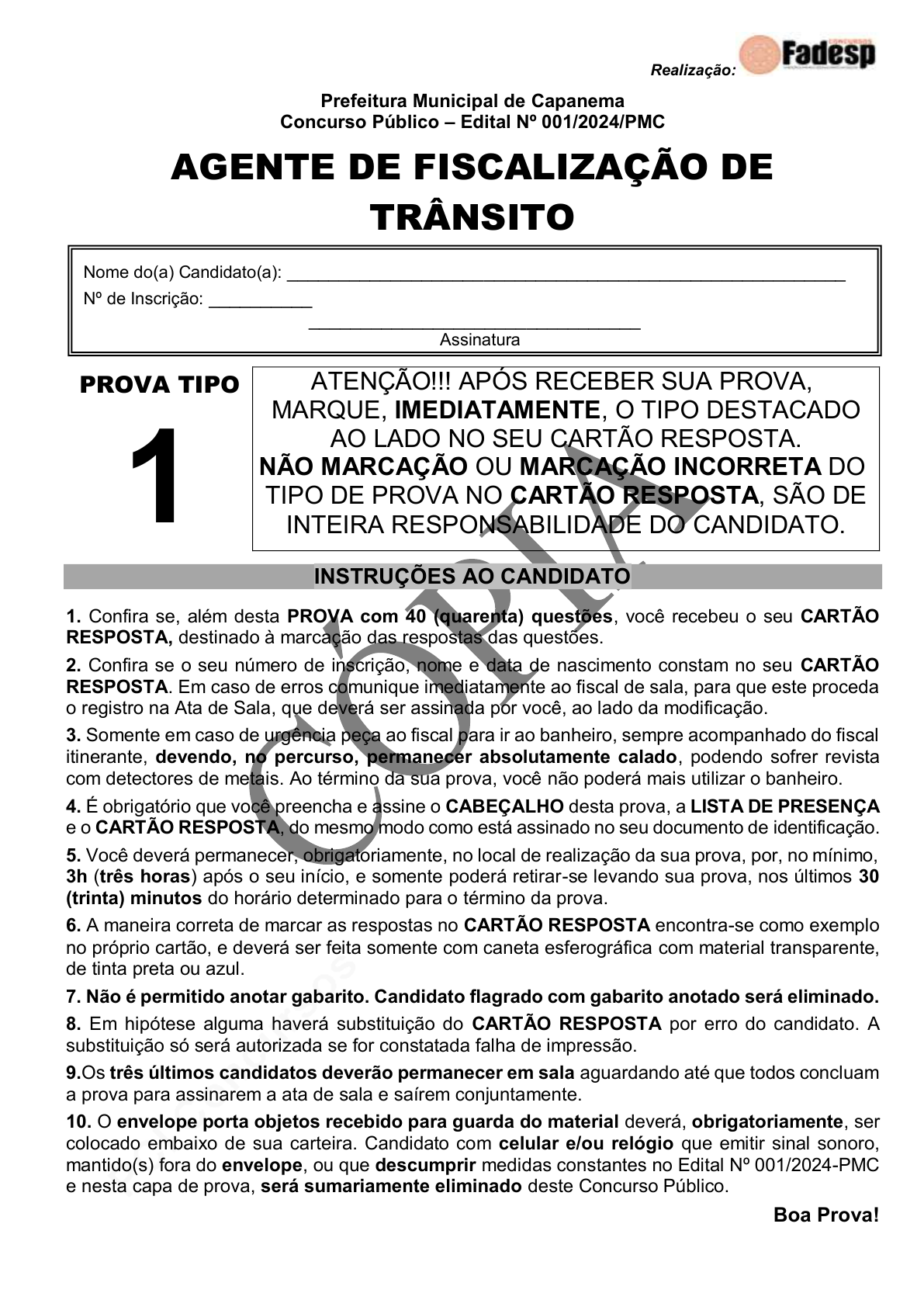 pcimarkpci MDAwMDowMDAwOjAwMDA6MDAwMDowMDAwOmZmZmY6OTU0ZTpiOTY4:VHVlLCAyOCBKYW4gMjAyNSAwMDoyNDoyNCAtMDMwMA== www.pciconcursos.com.br Realização: Prefeitura Municipal de Capanema Concurso Público – Edital Nº 001/2024/PMC AGENTE DE FISCALIZAÇÃO DE TRÂNSITO PROVA TIPO 1 ATENÇÃO!!! APÓS RECEBER SUA PROVA, MARQUE, IMEDIATAMENTE, O TIPO DESTACADO AO LADO NO SEU CARTÃO RESPOSTA. NÃO MARCAÇÃO OU MARCAÇÃO INCORRETA DO TIPO DE PROVA NO CARTÃO RESPOSTA, SÃO DE INTEIRA RESPONSABILIDADE DO CANDIDATO. INSTRUÇÕES AO CANDIDATO 1. Confira se, além desta PROVA com 40 (quarenta) questões, você recebeu o seu CARTÃO RESPOSTA, destinado à marcação das respostas das questões. 2. Confira se o seu número de inscrição, nome e data de nascimento constam no seu CARTÃO RESPOSTA. Em caso de erros comunique imediatamente ao fiscal de sala, para que este proceda o registro na Ata de Sala, que deverá ser assinada por você, ao lado da modificação. 3. Somente em caso de urgência peça ao fiscal para ir ao banheiro, sempre acompanhado do fiscal itinerante, devendo, no percurso, permanecer absolutamente calado, podendo sofrer revista com detectores de metais. Ao término da sua prova, você não poderá mais utilizar o banheiro. 4. É obrigatório que você preencha e assine o CABEÇALHO desta prova, a LISTA DE PRESENÇA e o CARTÃO RESPOSTA, do mesmo modo como está assinado no seu documento de identificação. 5. Você deverá permanecer, obrigatoriamente, no local de realização da sua prova, por, no mínimo, 3h (três horas) após o seu início, e somente poderá retirar-se levando sua prova, nos últimos 30 (trinta) minutos do horário determinado para o término da prova. 6. A maneira correta de marcar as respostas no CARTÃO RESPOSTA encontra-se como exemplo no próprio cartão, e deverá ser feita somente com caneta esferográfica com material transparente, de tinta preta ou azul. 7. Não é permitido anotar gabarito. Candidato flagrado com gabarito anotado será eliminado. 8. Em hipótese alguma haverá substituição do CARTÃO RESPOSTA por erro do candidato. A substituição só será autorizada se for constatada falha de impressão. 9.Os três últimos candidatos deverão permanecer em sala aguardando até que todos concluam a prova para assinarem a ata de sala e saírem conjuntamente. 10. O envelope porta objetos recebido para guarda do material deverá, obrigatoriamente, ser colocado embaixo de sua carteira. Candidato com celular e/ou relógio que emitir sinal sonoro, mantido(s) fora do envelope, ou que descumprir medidas constantes no Edital Nº 001/2024-PMC e nesta capa de prova, será sumariamente eliminado deste Concurso Público. Boa Prova! Nome do(a) Candidato(a): ______________________________________________________ Nº de Inscrição: __________ ________________________________ Assinatura pcimarkpci MDAwMDowMDAwOjAwMDA6MDAwMDowMDAwOmZmZmY6OTU0ZTpiOTY4:VHVlLCAyOCBKYW4gMjAyNSAwMDoyNDoyNCAtMDMwMA== www.pciconcursos.com.br pcimarkpci MDAwMDowMDAwOjAwMDA6MDAwMDowMDAwOmZmZmY6OTU0ZTpiOTY4:VHVlLCAyOCBKYW4gMjAyNSAwMDoyNDoyNCAtMDMwMA== www.pciconcursos.com.br 3 LÍNGUA PORTUGUESA Texto base para as questões de 01 a 05. Origem do Funk Juliana Bezerra - Professora de História O funk surge no sul dos Estados Unidos, nos anos 60, criado por músicos negros como Horace Silver, James Brown, George Clinton, entre outros. Escrito em compasso quaternário, a característica marcante do funk é o primeiro tempo acentuado, em relação aos outros três tempos. História do Funk Como toda criação artística, fica difícil apontar apenas um único inventor para o funk. No entanto, James Brown é um dos nomes mais importantes para o surgimento do funk. Este gênero musical surgiu da combinação de vários ritmos negros populares, como o blues, gospel, jazz e soul, que faziam sucesso nos Estados Unidos. A palavra “funk” ou “funky” era usada pelos músicos de jazz como uma forma de pedir aos colegas de banda que pusessem mais “força” ao ritmo. Alguns estudiosos apontam que poderia ser a fusão entre o vocábulo quibundo "lu-fuki" e o inglês “stinky”. […] BEZERRA, Juliana. Origem do Funk. Toda Matéria, [s.d.]. Disponível em: https://www.todamateria.com.br/origem-do- funk/. Acesso em: 24 jul. 2024. 01 De acordo com as informações apresentadas no texto, é correto afirmar que (A) comprovou-se, no âmbito acadêmico, que a palavra “funk” vem de um processo de justaposição da palavra “lu-fuki”, do quibundo, com a palavra “stinky”, do inglês. (B) o gênero musical funk é resultado da combinação de diversos ritmos. (C) o funk é originário da África, tendo surgido da combinação de vários ritmos negros populares. (D) o único inventor do estilo musical funk foi James Brown. 02 O propósito principal do trecho Alguns estudiosos apontam que poderia ser a fusão entre o vocábulo quibundo "lu-fuki" e o inglês “stinky” é (A) defender a tese de que o funk é um gênero musical misto, isto é, composto por vários outros gêneros musicais. (B) descrever as principais características do gênero musical funk. (C) convencer o interlocutor sobre a necessidade de se investigar a origem das palavras, para uma compreensão mais acurada acerca de seu significado. (D) explicar uma das possíveis origens do vocábulo funk. 03 No trecho O funk surge no sul dos Estados Unidos, nos anos 60, o vocábulo sublinhado corresponde a um (A) advérbio de lugar, indicando que o funk surgiu no sul dos Estados Unidos. (B) verbo conjugado no passado do modo subjuntivo, mas se referindo a um evento no tempo presente. (C) advérbio de tempo, designando o momento de surgimento do gênero musical funk. (D) verbo conjugado no presente do modo indicativo, mas se referindo a um evento no tempo passado. 04 A palavra “história” recebe acento gráfico pelo mesmo motivo que o vocábulo (A) vários. (B) músicos. (C) três. (D) artística. pcimarkpci MDAwMDowMDAwOjAwMDA6MDAw