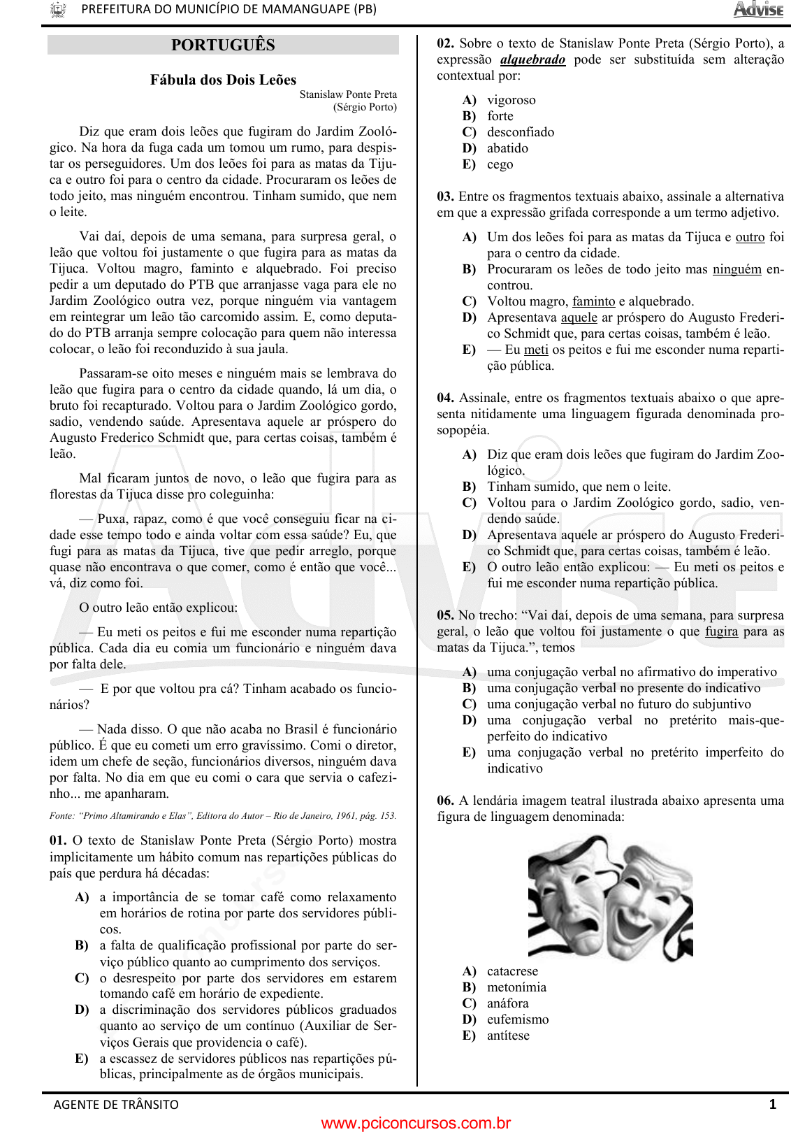 pcimarkpci MDAwMDowMDAwOjAwMDA6MDAwMDowMDAwOmZmZmY6OTU0ZTpiYjcy:VHVlLCAyOCBKYW4gMjAyNSAwNDo1MTozMiAtMDMwMA== www.pciconcursos.com.br PREFEITURA DO MUNICÍPIO DE MAMANGUAPE (PB) AGENTE DE TRÂNSITO 1 PORTUGUÊS Fábula dos Dois Leões Stanislaw Ponte Preta (Sérgio Porto) Diz que eram dois leões que fugiram do Jardim Zooló- gico. Na hora da fuga cada um tomou um rumo, para despis- tar os perseguidores. Um dos leões foi para as matas da Tiju- ca e outro foi para o centro da cidade. Procuraram os leões de todo jeito, mas ninguém encontrou. Tinham sumido, que nem o leite. Vai daí, depois de uma semana, para surpresa geral, o leão que voltou foi justamente o que fugira para as matas da Tijuca. Voltou magro, faminto e alquebrado. Foi preciso pedir a um deputado do PTB que arranjasse vaga para ele no Jardim Zoológico outra vez, porque ninguém via vantagem em reintegrar um leão tão carcomido assim. E, como deputa- do do PTB arranja sempre colocação para quem não interessa colocar, o leão foi reconduzido à sua jaula. Passaram-se oito meses e ninguém mais se lembrava do leão que fugira para o centro da cidade quando, lá um dia, o bruto foi recapturado. Voltou para o Jardim Zoológico gordo, sadio, vendendo saúde. Apresentava aquele ar próspero do Augusto Frederico Schmidt que, para certas coisas, também é leão. Mal ficaram juntos de novo, o leão que fugira para as florestas da Tijuca disse pro coleguinha: — Puxa, rapaz, como é que você conseguiu ficar na ci- dade esse tempo todo e ainda voltar com essa saúde? Eu, que fugi para as matas da Tijuca, tive que pedir arreglo, porque quase não encontrava o que comer, como é então que você... vá, diz como foi. O outro leão então explicou: — Eu meti os peitos e fui me esconder numa repartição pública. Cada dia eu comia um funcionário e ninguém dava por falta dele. — E por que voltou pra cá? Tinham acabado os funcio- nários? — Nada disso. O que não acaba no Brasil é funcionário público. É que eu cometi um erro gravíssimo. Comi o diretor, idem um chefe de seção, funcionários diversos, ninguém dava por falta. No dia em que eu comi o cara que servia o cafezi- nho... me apanharam. Fonte: “Primo Altamirando e Elas”, Editora do Autor – Rio de Janeiro, 1961, pág. 153. 01. O texto de Stanislaw Ponte Preta (Sérgio Porto) mostra implicitamente um hábito comum nas repartições públicas do país que perdura há décadas: A) a importância de se tomar café como relaxamento em horários de rotina por parte dos servidores públi- cos. B) a falta de qualificação profissional por parte do ser- viço público quanto ao cumprimento dos serviços. C) o desrespeito por parte dos servidores em estarem tomando café em horário de expediente. D) a discriminação dos servidores públicos graduados quanto ao serviço de um contínuo (Auxiliar de Ser- viços Gerais que providencia o café). E) a escassez de servidores públicos nas repartições pú- blicas, principalmente as de órgãos municipais. 02. Sobre o texto de Stanislaw Ponte Preta (Sérgio Porto), a expressão alquebrado pode ser substituída sem alteração contextual por: A) vigoroso B) forte C) desconfiado D) abatido E) cego 03. Entre os fragmentos textuais abaixo, assinale a alternativa em que a expressão grifada corresponde a um termo adjetivo. A) Um dos leões foi para as matas da Tijuca e outro foi para o centro da cidade. B) Procuraram os leões de todo jeito mas ninguém en- controu. C) Voltou magro, faminto e alquebrado. D) Apresentava aquele ar próspero do Augusto Frederi- co Schmidt que, para certas coisas, também é leão. E) — Eu meti os peitos e fui me esconder numa reparti- ção pública. 04. Assinale, entre os fragmentos textuais abaixo o que apre- senta nitidamente uma linguagem figurada denominada pro- sopopéia. A) Diz que eram dois leões que fugiram do Jardim Zoo- lógico. B) Tinham sumido, que nem o leite. C) Voltou para o Jardim Zoológico gordo, sadio, ven- dendo saúde. D) Apresentava aquele ar próspero do Augusto Frederi- co Schmidt que, para certas coisas, também é leão. E) O outro leão então explicou: — Eu meti os peitos e fui me esconder numa repartição pública. 05. No trecho: “Vai daí, depois de uma semana, para surpresa geral, o leão que voltou foi justamente o que fugira para as matas da Tijuca.”, temos A) uma conjugação verbal no afirmativo do imperativo B) uma conjugação verbal no presente do indicativo C) uma conjugação verbal no futuro do subjuntivo D) uma conjugação verbal no pretérito mais-que- perfeito do indicativo E) uma conjugação verbal no pretérito imperfeito do indicativo 06. A lendária imagem teatral ilustrada abaixo apresenta uma figura de linguagem denominada: A) catacrese B) metonímia C) anáfora D) eufemismo E) antítese www.pciconcursos.com.br pcimarkpci MDAwMDowMDAwOjAwMDA6MDAwMDowMDAwOmZmZmY6OTU0ZTpiYjcy:VHVlLCAyOCBKYW4gMjAyNSAwNDo1MTozMiAtMDMwMA== www.pciconcursos.com.br PREFEITURA DO MUNICÍPIO DE MAMANGUAPE (PB) AGENTE DE TRÂNSITO 2 Considere a imagem abaixo e responda a questão 07. 07. No texto ilustrativo acima, suas características predomi- nam para uma função: A) conativa B) poética C) metalinguística D) fática E) denotativa 08. Considere o fragmento a seguir: “Na vida profissional de cada cidadão, existem momentos difíceis de serem resolvidos, mas tudo se supera”. A forma verbal existem só não pode ser substituída corretamente pela forma: A) deve haver; B) há; C) podem haver; D) podem existir; E) devem existir. 09. Dentre as palavras abaixo, assinale a ÚNICA alternativa em que todas as palavras estão grafadas de forma correta, conforme normas ortográficas. A) Pretencioso, aspectos, sossego B) Quiseram, essência, impecílio C) Obsecado, reinvidicação, repercussão D) Assessoria, exceção, incansável E) Excessivo, expontâneo, obseção 10. Quanto aos estudos sobre a Crase, marque a alternativa em que o enunciado apresenta uma 