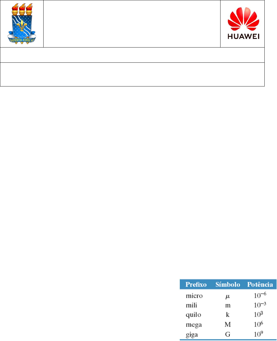UNIVERSIDADE FEDERAL DA PARAÍBA CEAR – CENTRO DE ENERGIAS ALTERNATIVAS E RENOVÁVEIS Programa Huawei Power Generation Módulo 1: Eletricidade básica aplicada a sistemas fotovoltaicos Profª. Thamyres Tâmulla C. Palitó Atividade 1 – Conceitos Fundamentais e Lei de Ohm Aluno(a): OBS: Apresente os cálculos das questões 4, 5, 6 e 7. Fórmulas úteis: 𝑉 = 𝑅𝐼 e 𝑃 = 𝑉𝐼 1- Relacione corretamente o conceito das seguintes grandezas elétricas (1,0 pontos): A. Tensão elétrica ( ) é capacidade de trabalho de uma corrente elétrica. B. Corrente elétrica ( ) é igual ao produto da tensão pela corrente. C. Resistência Elétrica ( ) é o fluxo ordenado dos elétrons. D. Potência elétrica ( ) é a força necessária para movimentar os elétrons. E. Energia elétrica ( ) é a capacidade de um material opor-se à corrente elétrica. 2- Relacione corretamente a unidade de medida das seguintes grandezas elétricas (1,0 pontos): A. Tensão elétrica ( ) Watt (W) B. Corrente elétrica ( ) Volt (V) C. Resistência Elétrica ( ) Ohm (Ω) D. Potência elétrica ( ) Watt × segundo (Ws) E. Energia elétrica ( ) Ampere (A) 3- Efetue as conversões abaixo (2,0 pontos): a) 27000 µA = __________A = 27 × 10___ A b) 85 mV = __________V = 8500 × 10___ V c) 3,7MW = __________KW = 370 × 10___ W d) 2,8 mV = __________µV = 280 × 10___ V e) 6,0 A = __________mA = 0,006 × 10___ A 4- Determine a diferença de potencial (tensão) em um fio condutor com resistência de 20 Ohms, por onde passa uma corrente de 5 Amperes (1,5 pontos). a) 4 V b) 8 V c) 10 V d) 100 V e) 120 V 5- Qual a resistência elétrica de uma lâmpada LED que possui uma tensão de 12 V e consome uma corrente elétrica de 0,5 A (1,5 pontos)? a) 6 Ω b) 24 Ω c) 30 Ω d) 48 Ω e) 60 Ω 6- Uma empresa possui um equipamento que funciona com uma corrente elétrica de 5 A e uma tensão de 127 V. Entretanto, o novo local onde a empresa se instalou fornece uma tensão de 220 V. Considerando a resistência constante, a nova corrente elétrica consumida ao ligar o equipamento na nova tensão será de aproximadamente (1,5 pontos): a) 1,27 A. b) 2,89 A. c) 3,58 A. d) 5,77 A. e) 8,66 A. 7- Uma lâmpada LED (diodo emissor de luz), que funciona com 12 V e corrente contínua de 0,45 A, produz a mesma quantidade de luz que uma lâmpada incandescente de 60 W de potência. Qual é o valor da redução da potência consumida ao se substituir a lâmpada incandescente pela de LED (1,5 pontos)? a) 54,6 W b) 27,0 W c) 26,6 W d) 5,4 W e) 5,0 W