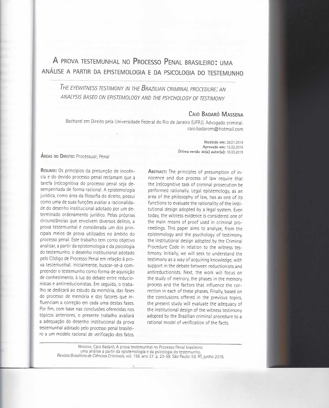 A PROVA TESTEMUNHAL NO PROCESSO PENAL BRASILEIRO: UMA ANÁLISE A PARTIR DA EPISTEMOLOGIA E DA PSICOLOGIA DO TESTEMUNHO THE EYEWITNESS TESTIMONY IN THE BRAZILIAN CRIMINAL PROCEDURE: AN ANALYSIS BASED ON EPISTEMOLOGY AND THE PSYCHOLOGY OF TESTIMONY BADARÓ MASSENA Bacharel em Direito pela Universidade Federal do Rio de Janeiro (UFRJ). Advogado criminal. caio.badarom@hotmail.com Recebido em: 28.01.2019 Aprovado em: 13.03.2019 Última versão do(a) autor(a): 18.03.2019 ÁREAS DO DIREITO: Processual; Penal RESUMO: Os princípios da presunção de inocên- ABSTRACT: The principles of presumption of in- cia e do devido processo penal reclamam que a nocence and due process of law require that tarefa (re)cognitiva do processo penal seja de- the (re)cognitive task of criminal prosecution be sempenhada de forma racional. A epistemologia performed rationally. Legal epistemology, as an jurídica, como área da filosofia do direito, possui area of the philosophy of law, has as one of its como uma de suas funções avaliar a racionalida- functions to evaluate the rationality of the insti- de do desenho institucional adotado por um de- tutional design adopted by a legal system. Even terminado ordenamento jurídico. Pelas próprias today, the witness evidence is considered one of circunstâncias que envolvem diversos delitos, a the main means of proof used in criminal pro- prova testemunhal é considerada um dos prin- ceedings. This paper aims to analyze, from the cipais meios de prova utilizados no âmbito do epistemology and the psychology of testimony, processo penal. Este trabalho tem como objetivo the institutional design adopted by the Criminal analisar, a partir da epistemologia e da psicologia Procedure Code in relation to the witness tes- do testemunho, 0 desenho institucional adotado timony. Initially, we will seek to understand the pelo Código de Processo Penal em relação à pro- testimony as a way of acquiring knowledge, with va testemunhal. Inicialmente, buscar-se-á com- support in the debate between reductionists and preender 0 testemunho como forma de aquisição antireductionists. Next, the work will focus on de conhecimento, à luz do debate entre reducio- the study of memory, the phases in the memory nistas e antirreducionistas. Em seguida, 0 traba- process and the factors that influence the cor- lho se dedicará ao estudo da memória, das fases rection in each of these phases. Finally, based on do processo de memória e dos fatores que in- the conclusions offered in the previous topics, fluenciam a correção em cada uma destas fases. the present study will evaluate the adequacy of Por fim, com base nas conclusões oferecidas nos the institutional design of the witness testimony tópicos anteriores, presente trabalho avaliará adopted by the Brazilian criminal procedure to a a adequação do desenho institucional da prova rational model of verification of the facts. testemunhal adotado pelo processo penal brasilei- ro a um modelo racional de verificação dos fatos. MASSENA, Caio Badaró. A prova testemunhal no Processo Penal brasileiro: uma análise a partir da epistemologia e da psicologia do testemunho. Revista Brasileira de Ciências Criminais. vol. 156. ano 27. p. 23-59. São Paulo: Ed. RT, junho 2019.24 REVISTA BRASILEIRA DE CRIMINAIS 2019 RBCCRIM 156 Prova Penal Prova testemu- KEYWORDS: Criminal Evidence - Witness testi- Decorre, portanto, dos nhal Epistemologia jurídica Psicologia do mony Legal epistemology Psychology of tes- inocência a função (re) CO testemunho Processo Penal. timony Criminal procedure. processo que se caracteriz zar conhecimento da inf jurídico capaz de apoiar a 1. A prova no processo penal e papel da epistemologia jurídica. 2. 0 testemunho como prova: uma aproximação epistemológica. 2.1. Reducionismo, antirreducionismo e a tese do dualismo. 3. A prova testemunhal e a psicologia do testemunho. 3.1. A memória. 3.2. Estruturas e tipos de memória. 3.3. Os processos envolvidos no registro da informação. 4. Nas palavras de Franco 3.4. Os fatores de influência na memória. 3.4.1. Fatores de codificação. 3.4.2. Fatores de re- bilire se qualcosa sia a tenção. 3.4.3. Fatores de recuperação. 4. A prova testemunhal no Código de Processo Penal. Editore, 2012 5. Considerações finais. 6. Referências bibliográficas. 5. Por certo, a verdade CO há que se falar em valores estão em jogo, 1. A PROVA NO PROCESSO PENAL E 0 PAPEL DA EPISTEMOLOGIA JURÍDICA social, a dignidade do Todos nós realizamos raciocínios através de provas. Em nossas atividades diá- não epistêmicos a lim que possibilite uma CO rias a todo momento realizamos inferências probatórias a fim de tomar decisões, Assim, ainda que se re das mais simples às mais complexas. O raciocínio inferencial é uma habilidade modelo racional do pr humana Neste sentido, Jeremy Bentham afirmou que campo da prova tório (GASCÓN ABEL não é outro que do motivo pelo qual toda disciplina que in- prueba. 3. ed. Madrid tente produzir alguma forma séria de conhecimento tem de enfrentar os proble- esclarecer "qual verda debates acerca do con mas da prova e das inferências probatórias. filosofia a partir do gir No âmbito do processo penal brasileiro, artigo 5°, inciso LIV, da Constitui- frentadas questões ção da República, estabelece processo como único meio legítimo de verificação correspondentista, en da responsabilidade penal: ninguém será privado da liberdade ou de seus bens de nós a servir de star entendo ser o realism sem devido processo legal. Entretanto, é por força do reconhecimento do prin- possível ter teorias (S cípio da presunção de inocência que se insere o problema da prova no processo linguagem e sociedade penal brasileiro. a adoção de um conce Neste sentido, Geraldo Prado adverte que "uma das consequências da posição sibilidade de uma ver da presunção de inocência como princípio reitor do processo penal, portanto, Lagier, na externos não assegura 