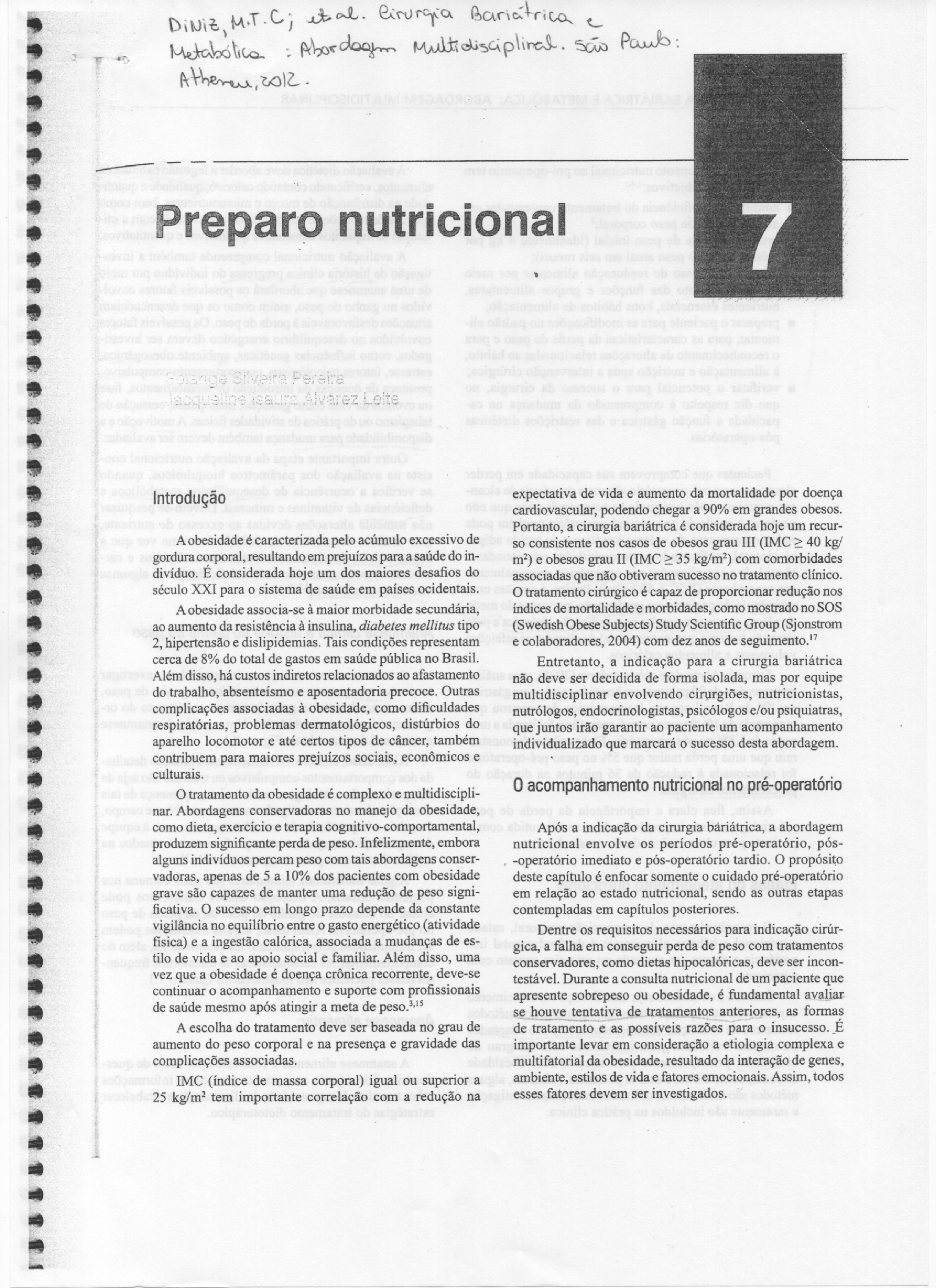 it al. Cirurgia Bariatrica Metabolica saw Preparo nutricional 7 Alvarez Leite Introdução expectativa de vida e aumento da mortalidade por doença cardiovascular, podendo chegar a 90% em grandes obesos. Portanto, a cirurgia bariátrica é considerada hoje um recur- A obesidade é caracterizada pelo acúmulo excessivo de consistente nos casos de obesos grau III (IMC > 40 kg/ gordura corporal, resultando em prejuízos para a saúde do in- e obesos grau II (IMC > 35 com comorbidades divíduo. É considerada hoje um dos maiores desafios do associadas que não obtiveram sucesso no tratamento clínico. século XXI para o sistema de saúde em países ocidentais. tratamento cirúrgico é capaz de proporcionar redução nos A obesidade associa-se à maior morbidade secundária, índices de mortalidade e morbidades, como mostrado no SOS ao aumento da resistência à insulina, diabetes mellitus tipo (Swedish Obese Subjects) Study Scientific Group (Sjonstrom hipertensão e Tais condições representam e colaboradores, 2004) com dez anos de cerca de 8% do total de gastos em saúde pública no Brasil. Entretanto, a indicação para a cirurgia bariátrica Além disso, há custos indiretos relacionados ao afastamento não deve ser decidida de forma isolada, mas por equipe do trabalho, absenteísmo e aposentadoria precoce. Outras multidisciplinar envolvendo cirurgiões, nutricionistas, complicações associadas à obesidade, como dificuldades nutrólogos, endocrinologistas, psicólogos e/ou psiquiatras, respiratórias, problemas dermatológicos, distúrbios do que juntos irão garantir ao paciente um acompanhamento aparelho locomotor e até certos tipos de câncer, também individualizado que marcará o sucesso desta abordagem. contribuem para maiores prejuízos sociais, econômicos e culturais. tratamento da obesidade é complexo e multidiscipli- 0 acompanhamento nutricional no pré-operatório nar. Abordagens conservadoras no manejo da obesidade, como dieta, exercício e terapia cognitivo-comportamental, Após a indicação da cirurgia a abordagem produzem significante perda de peso. Infelizmente, embora nutricional envolve os períodos pré-operatório, pós- alguns indivíduos percam peso com tais abordagens conser- -operatório imediato e pós-operatório tardio. propósito vadoras, apenas de 5 a 10% dos pacientes com obesidade deste capítulo é enfocar somente o cuidado pré-operatório grave são capazes de manter uma redução de peso signi- em relação ao estado nutricional, sendo as outras etapas ficativa. sucesso em longo prazo depende da constante contempladas em capítulos posteriores. vigilância no equilíbrio entre o gasto energético (atividade Dentre os requisitos necessários para indicação cirúr- física) e a ingestão calórica, associada a mudanças de es- gica, a falha em conseguir perda de peso com tratamentos tilo de vida e ao apoio social e familiar. Além disso, uma conservadores, como dietas hipocalóricas, deve ser incon- vez que a obesidade é doença crônica recorrente, deve-se testável. Durante a consulta nutricional de um paciente que continuar o acompanhamento e suporte com profissionais apresente sobrepeso ou obesidade, é fundamental avaliar de saúde mesmo após atingir a meta de se houve tentativa de tratamentos anteriores, as formas A escolha do tratamento deve ser baseada no grau de de tratamento e as possíveis razões para o insucesso. É aumento do peso corporal e na presença e gravidade das importante levar em consideração a etiologia complexa e complicações associadas. multifatorial da obesidade, resultado da interação de genes, IMC (índice de massa corporal) igual ou superior a ambiente, estilos de vida e fatores emocionais. Assim, todos 25 tem importante correlação com a redução na esses fatores devem ser investigados.54 CIRURGIA BARIÁTRICA E METABÓLICA: ABORDAGEM MULTIDISCIPLINAR acompanhamento nutricional no pré-operatório tem A avaliação dietética deve abordar a ingestão habitual de como principais alimentos, verificando conteúdo calórico, qualidade e quanti- confirmar a ineficiência do tratamento conservador em dade na distribuição de macro e micronutrientes, bem como atingir a meta de peso padrões de refeições e lanches. Pode ser avaliada com a uti- promover perda de peso inicial (idealmente 4 kg por lização de inquéritos alimentares qualitativos e quantitativos. mês ou 10% do atual em seis meses); A avaliação nutricional compreende também a inves- iniciar o processo de reeducação alimentar por meio tigação da história clínica pregressa do indivíduo por meio do conhecimento das funções e grupos alimentares, de uma anamnese que abordará os possíveis fatores envol- nutrientes essenciais, bons hábitos de alimentação; vidos no ganho de peso, assim como os que desencadeiam preparar o paciente para as modificações no padrão ali- situações desfavoráveis à perda de peso. Os possíveis fatores mentar, para as características da perda de peso e para envolvidos no desequilíbrio energético devem ser investi- o reconhecimento de alterações relacionadas ao hábito, gados, como influências genéticas, ambiente obesogênico, à alimentação e nutrição após a intervenção cirúrgica; estresse, fatores psicológicos, comportamento compulsivo, verificar o potencial para o sucesso da cirurgia, no presença de doenças ou introdução de medicamentos, fase que diz respeito à compreensão da mudança na ca- ou eventos da vida como gestação, menopausa, cessação de pacidade e função gástrica e das restrições dietéticas tabagismo ou de prática de atividades A motivação a pós-operatórias. disponibilidade para mudança também devem ser avaliadas. Outra importante etapa da avaliação nutricional con- Pacientes que comprovem sua capacidade em perder siste na avaliação dos parâmetros bioquímicos, quando algum peso no pré-operatório são mais prováveis de alcan- se verifica a ocorrênc