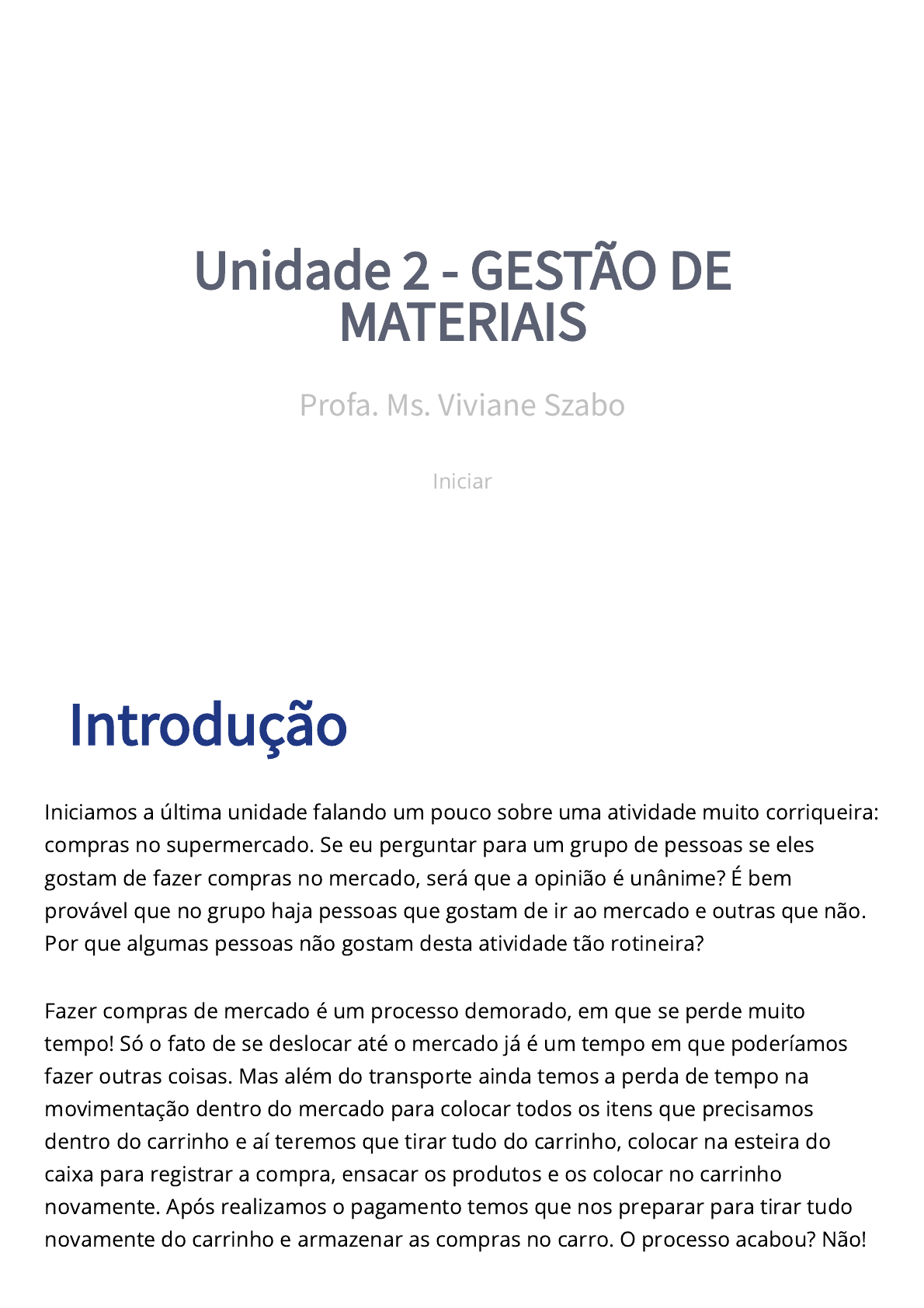 08/06/22, 19:04 NEG_ADPRMA_19_E_2_V2 https://student.ulife.com.br/ContentPlayer/Index?lc=8sZ0qebyALqO2c3dQIVTNw%3d%3d&l=dXxcnCjIdMNrqYjpQFquIA%3d%3d&cd=20VJ8Ub… 1/27 Introdução Iniciamos a última unidade falando um pouco sobre uma atividade muito corriqueira: compras no supermercado. Se eu perguntar para um grupo de pessoas se eles gostam de fazer compras no mercado, será que a opinião é unânime? É bem provável que no grupo haja pessoas que gostam de ir ao mercado e outras que não. Por que algumas pessoas não gostam desta atividade tão rotineira? Fazer compras de mercado é um processo demorado, em que se perde muito tempo! Só o fato de se deslocar até o mercado já é um tempo em que poderíamos fazer outras coisas. Mas além do transporte ainda temos a perda de tempo na movimentação dentro do mercado para colocar todos os itens que precisamos dentro do carrinho e aí teremos que tirar tudo do carrinho, colocar na esteira do caixa para registrar a compra, ensacar os produtos e os colocar no carrinho novamente. Após realizamos o pagamento temos que nos preparar para tirar tudo novamente do carrinho e armazenar as compras no carro. O processo acabou? Não! Unidade 2 - GESTÃO DE MATERIAIS Profa. Ms. Viviane Szabo Iniciar 08/06/22, 19:04 NEG_ADPRMA_19_E_2_V2 https://student.ulife.com.br/ContentPlayer/Index?lc=8sZ0qebyALqO2c3dQIVTNw%3d%3d&l=dXxcnCjIdMNrqYjpQFquIA%3d%3d&cd=20VJ8Ub… 2/27 Ainda temos que tirar tudo do carro e levar para a residência para armazenar tudo nos seus respectivos locais. Você provavelmente deve ter uma política de movimentação dentro do supermercado, outra para colocar as compras no carrinho e no carro, além de uma política de armazenamento na sua casa. Talvez seja tão intuitivo que você nem a percebe. Por exemplo, quais itens você pega primeiro para colocar no carrinho de mercado? Você pegaria o sorvete sabendo que ele �cará fora da geladeira durante todo o processo de compra e transporte até em casa ou você o deixaria para o �nal? Provavelmente você deixaria o sorvete e todos os itens frios e congelados para o �nal, não é mesmo? Você com certeza ainda analisa quais produtos você pode colocar por cima de outro, está correto? Empilhar corretamente os produtos mais pesados por baixo e os mais leves por cima é o que garantirá que seu ovo não chegue quebrado e que suas frutas, verduras e pães não �quem amassados. Ao passar seu produto no caixa e o colocar em saquinhos você também deve ter algumas regrinhas certo? Você colocaria um frango assado ou outro prato quente da rotisseria junto com o sorvete? E a água sanitária �caria junto com o pão? E quando �nalmente você chega em casa, você tem alguma política para dizer quais produtos você começa a guardar? Provavelmente os itens de geladeira e congelador são sempre os primeiros a serem guardados. A�nal, o restante pode esperar! Por que tantas regrinhas para uma simples atividade de fazer compras no mercado? Tudo para ter a melhor gestão dos materiais ! Você pode estar se perguntando: mas minhas compras são materiais? São sim! Não importa qual será o processo em que será usado a mercadoria comprada, eles serão recursos materiais do processo! Veja, se você comprou itens para fazer uma refeição, estes itens podem ser vistos como matéria-prima deste processo. Se é um item de limpeza ou higiene, estes são materiais auxiliares destes processos! Quando falamos de materiais, podemos estar falando de classi�cações diversas. Este tem relação direta com os tipos de estoques que nós temos tanto em casa quanto nas organizações. 08/06/22, 19:04 NEG_ADPRMA_19_E_2_V2 https://student.ulife.com.br/ContentPlayer/Index?lc=8sZ0qebyALqO2c3dQIVTNw%3d%3d&l=dXxcnCjIdMNrqYjpQFquIA%3d%3d&cd=20VJ8Ub… 3/27 Não importa se é uma empresa ou é sua casa, a gestão de materiais e políticas e técnicas de gestão de estoques são muito importante, não é mesmo? Nesta unidade falaremos justamente sobre estes aspectos relacionados à gestão de materiais. 1. Classificação dos materiais Vimos anteriormente que uma empresa pode adotar diferentes tipos de arranjos físicos e escolher trabalhar com diferentes tipos de processo de transformação (linha, lote, para estoque ou encomenda), tudo pensando em focar uma prioridade competitiva, um objetivo de desempenho especí�co (rapidez, �exibilidade, custo, qualidade ou con�abilidade). Todos estes aspectos são pensados na estratégia de produção e estão alinhados à estratégia competitiva da empresa. O que todas as empresas têm em comum, mesmo que tenham arranjos diferentes? Todas são um processo de transformação de recursos em produto ou serviço. Nestas entradas temos os recursos materiais! Chiavenato (2014, p. 38) diz que, no caso das indústrias, todas podem ser vistas como um “�uxo contínuo de materiais que são processados ao longo de várias atividades no sistema produtivo. Essa dinâmica requer muito cuidado para manter seu ritmo, sua �uência e sua cadência, de tal maneira que não haja paralisações ou esperas imprevistas. A busca de maior produtividade está na base desse cuidado. A preocupação com máquinas, equipamentos e tecnologia deve antes passar pela preocupação com os materiais que passam por elas. A redução de custos começa por aí, em termos de quantidades disponíveis, tempo de movimentação, qualidade etc.”. Isto quer dizer que os materiais são os insumos básicos para que possamos ter um produto acabado e estes podem ser de diversos tipos: líquido, sólido, plasma ou gases. Se analisarmos suas propriedades químicas elas ainda serão vistas com classi�cações diferentes e requerem formas diferentes não só de acondicionamento como também de transporte, estocagem e processamento. Classi�car materiais é a atividade de agrupar ou aglutinar características semelhantes dos materiais. Pode 08/06/22, 19:04 NEG_ADPRMA_19_E_2_V2 https://student.ulife.com.br