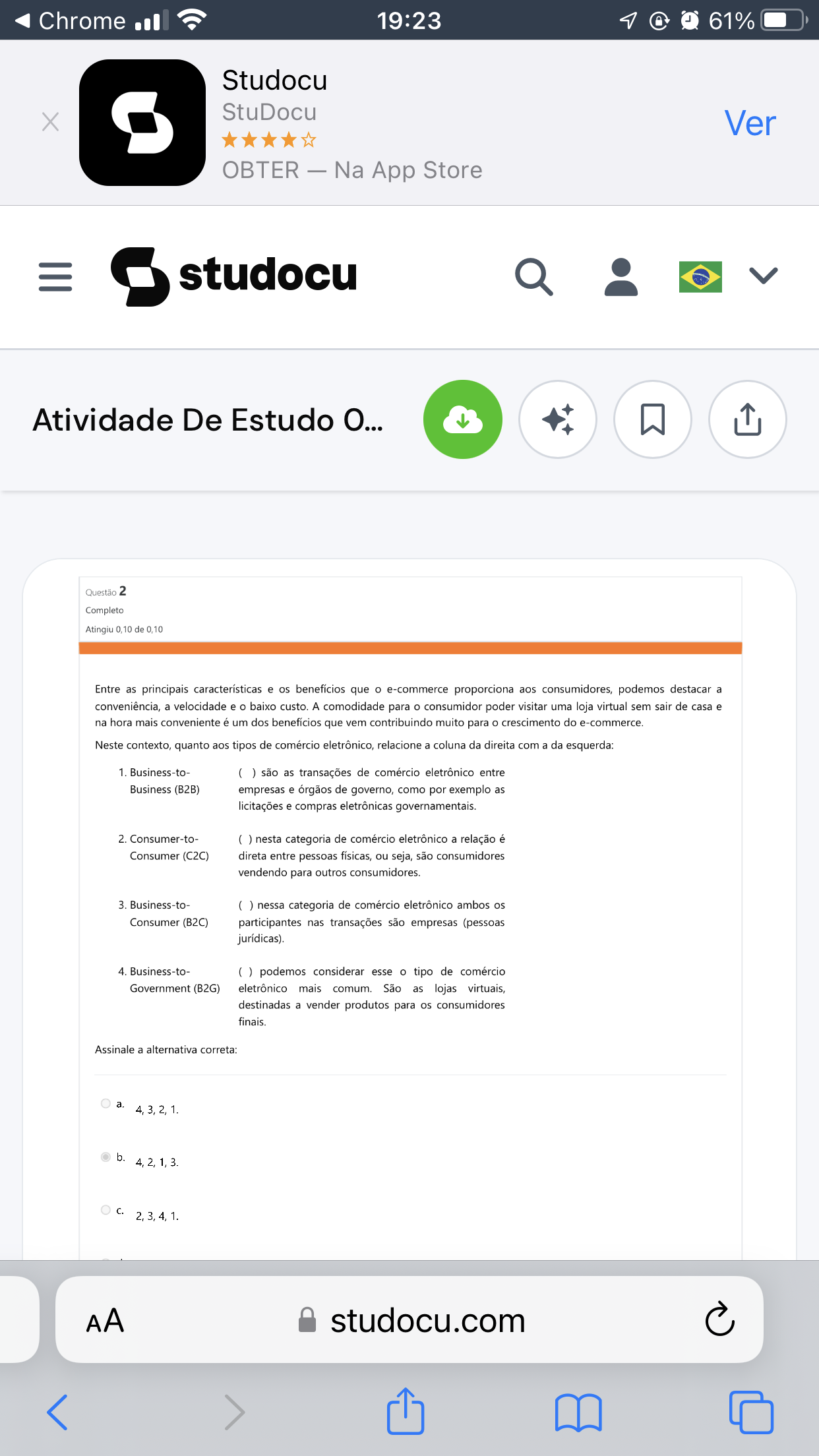 Chrome 19:23 61% Studocu X StuDocu Ver OBTER - Na App Store studocu Atividade De Estudo O... Questão 2 Completo Atingiu 0.10 de 0.10 Entre as principais características e os benefícios que o e-commerce proporciona aos consumidores, podemos destacar a conveniência, a velocidade e o baixo custo. A comodidade para o consumidor poder visitar uma loja virtual sem sair de casa e na hora mais conveniente é um dos benefícios que vem contribuindo muito para o crescimento do Neste contexto, quanto aos tipos de comércio eletrônico, relacione a coluna da direita com a da esquerda: 1. Business-to- ( ) são as transações de comércio eletrônico entre Business (B2B) empresas e órgãos de governo, como por exemplo as licitações e compras eletrônicas governamentais. 2. Consumer-to- ( ) nesta categoria de comércio eletrônico a relação é Consumer (C2C) direta entre pessoas físicas, ou seja, são consumidores vendendo para outros consumidores. 3. Business-to- ( ) nessa categoria de comércio eletrônico ambos os Consumer (B2C) participantes nas transações são empresas (pessoas jurídicas). 4. Business-to- ( ) podemos considerar esse tipo de comércio Government (B2G) eletrônico mais comum. São as lojas virtuais, destinadas a vender produtos para os consumidores finais. Assinale a alternativa correta: a. b. 2, 3. AA studocu.com
