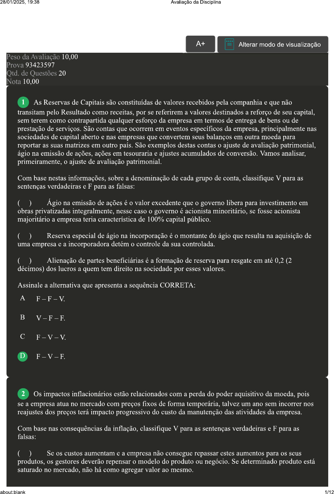 28/01/2025, 19:38 Avaliação da Disciplina A+ Alterar modo de visualização Peso da Avaliação 10,00 Prova 93423597 Qtd. de Questões 20 Nota 10,00 1 As Reservas de Capitais são constituídas de valores recebidos pela companhia e que não transitam pelo Resultado como receitas, por se referirem a valores destinados a reforço de seu capital, sem terem como contrapartida qualquer esforço da empresa em termos de entrega de bens ou de prestação de serviços. São contas que ocorrem em eventos específicos da empresa, principalmente nas sociedades de capital aberto e nas empresas que convertem seus balanços em outra moeda para reportar as suas matrizes em outro país. São exemplos destas contas ajuste de avaliação patrimonial, ágio na emissão de ações, ações em tesouraria e ajustes acumulados de conversão. Vamos analisar, primeiramente, ajuste de avaliação patrimonial. Com base nestas informações, sobre a denominação de cada grupo de conta, classifique V para as sentenças verdadeiras e F para as falsas: ( ) Ágio na emissão de ações é valor excedente que governo libera para investimento em obras privatizadas integralmente, nesse caso governo é acionista minoritário, se fosse acionista majoritário a empresa teria característica de 100% capital ( ) Reserva especial de ágio na incorporação é montante do ágio que resulta na aquisição de uma empresa e a incorporadora detém controle da sua controlada. ( ) Alienação de partes beneficiárias é a formação de reserva para resgate em até 0,2 (2 décimos) dos lucros a quem tem direito na sociedade por esses valores. Assinale a alternativa que apresenta a sequência CORRETA: A B V-F-F C F-V-V D 2 Os impactos inflacionários estão relacionados com a perda do poder aquisitivo da moeda, pois se a empresa atua no mercado com preços fixos de forma temporária, talvez um ano sem incorrer nos reajustes dos preços terá impacto progressivo do custo da manutenção das atividades da empresa. Com base nas consequências da inflação, classifique V para as sentenças verdadeiras e F para as falsas: ( Se os custos aumentam e a empresa não consegue repassar estes aumentos para os seus produtos, os gestores deverão repensar modelo do produto ou negócio. Se determinado produto está saturado no mercado, não há como agregar valor ao mesmo. about:blank 1/1228/01/2025, 19:38 Avaliação da Disciplina ( ) As mesmas consequências atingem também as instituições cujos rendimentos são decorrentes de juros pré-fixados auferidos através de títulos de crédito emitidos pelo governo ou por empresas do setor financeiro. ( A empresa não terá consequências, pois irá equilibrar as distorções financeiras junto ao mercado de crédito. Os efeitos das taxas de juros no mercado financeiro cobradas pelos bancos estão acompanhando as taxas da inflação do país e se a empresa não reavaliar a política das cobranças do custo financeiro pelas vendas a prazo, as consequências podem ser irreversíveis. Assinale a alternativa que apresenta a sequência CORRETA: A V-V-V B C V-F-V D 3 Outro aspecto que gestor financeiro precisa estar atento é a geração e manutenção do Capital de Giro Próprio, ou CGP. O CGP possui sua relevância na estrutura das finanças empresariais, pois é pelo valor do Capital Social que a empresa praticamente consegue manter financiamento das atividades do ativo circulante. Os riscos (probabilidade de perda) em uma operação sempre irão existir. O que é possível fazer, como gestor, é analisar ambiente e definir estratégias que possam minimizar esses riscos. Sobre a sistemática para apuração e avaliação da fórmula do Capital de Giro, assinale a alternativa CORRETA: A A sistemática é avaliar valor total pela fórmula: Capital de Giro Próprio = Receitas Brutas de Vendas Ativo Não Circulante. B A sistemática é avaliar valor total pela fórmula: Capital de Giro Próprio = Ativo Circulante ) Investimentos em Ativos da Produção. A sistemática é avaliar valor total pela fórmula: Capital de Giro Próprio Patrimônio Líquido (-) Ativo Não Circulante. D A sistemática é avaliar valor total pela fórmula: Capital de Giro Próprio = Receitas Brutas de Vendas (-) Efeito Tributário no Resultado. 4 Um fator preponderante que deve ser avaliado no momento da captação dos recursos de terceiros está relacionado com os prazos de vencimentos dos contratos. Em muitos casos, para determinados projetos de expansão dos negócios, há um prazo de carência para início da liquidação das parcelas do valor principal. Em pesquisas sobre custo de capital de terceiros, é importante avaliarmos os conceitos dos juros. A formação dos juros é estudada de acordo com duas teorias: a) a teoria das expectativas não viesadas e; b) teoria de preferência pela liquidez. Sobre pressuposto básico da teoria das expectativas não viesadas, assinale a alternativa CORRETA: O pressuposto básico da teoria das expectativas não viesadas é que a estrutura a termo das taxas A de juros equivale à média geométrica das taxas de juros de longo prazo (do passado) e futuras. Em outras palavras, a teoria admite que as taxas de juros de longo prazo sejam balizadas pelas taxas de curto prazo previstas para futuro. about:blank 2/1228/01/2025, 19:38 Avaliação da Disciplina O pressuposto básico da teoria das expectativas não viesadas é que a estrutura a termo das taxas B de juros equivale à somatória das taxas de juros de curto prazo (correntes) e futuras. Em outras palavras, a teoria admite que as taxas de juros de longo prazo sejam balizadas pelas taxas de curto prazo previstas para futuro. O pressuposto básico da teoria das expectativas não viesadas é que a estrutura a termo das taxas de juros equivale à média geométrica das taxas de juros de curto prazo (correntes) e futuras. Em outras palavras, a teoria admite que as taxas de juros de longo prazo sejam balizadas pelas taxas de curto prazo previstas p