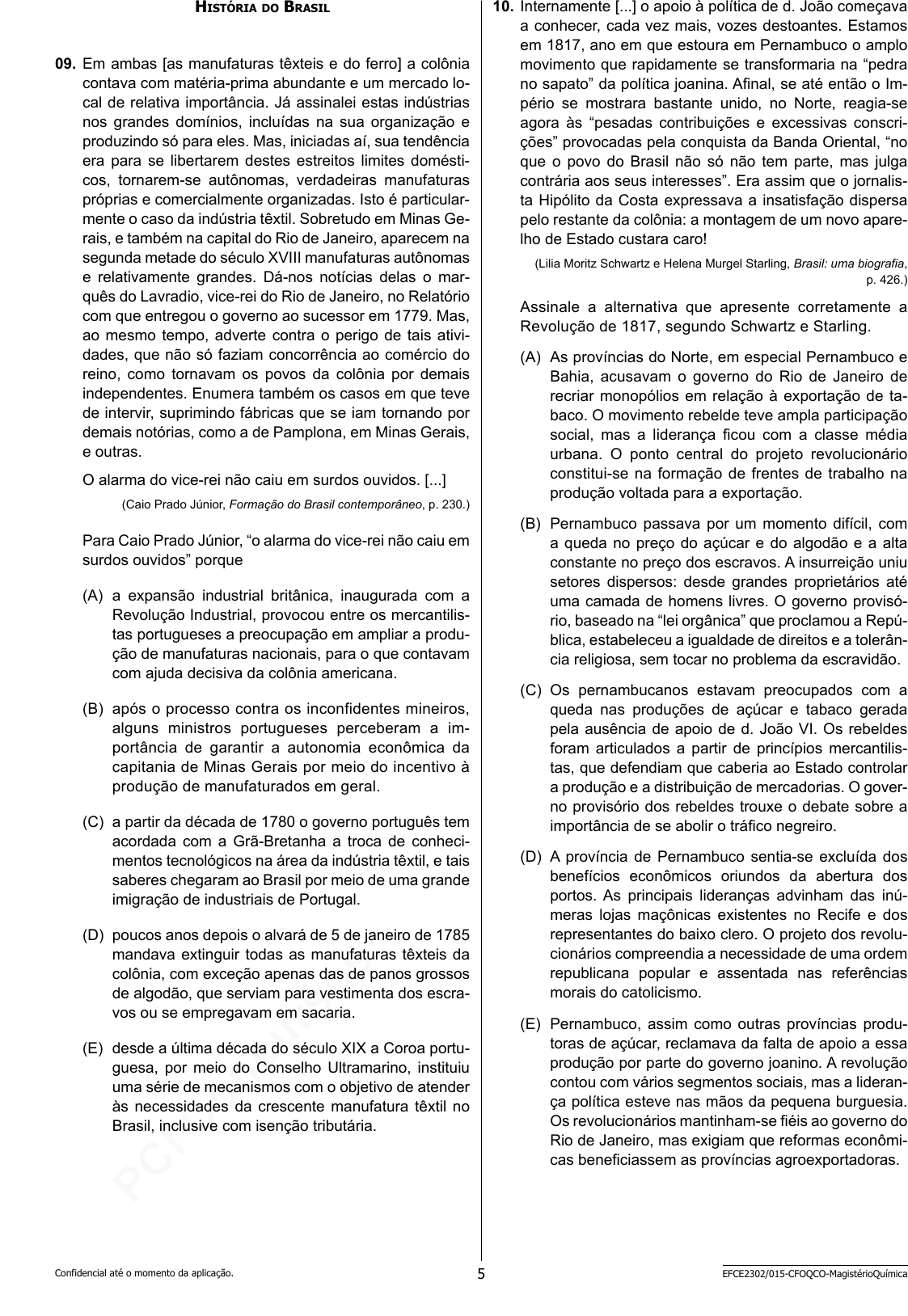 pcimarkpci MjgwNDowMTRjOjViYWU6ODBiMjpjMDRmOjBlNTE6ZGJjODo0MTlj:RnJpLCAyNCBKYW4gMjAyNSAxOTo1MzoxMyAtMDMwMA== www.pciconcursos.com.br 5 EFCE2302/015-CFOQCO-MagistérioQuímicaConfidencial até o momento da aplicação. História do BrasiL 09. Em ambas [as manufaturas têxteis e do ferro] a colônia contava com matéria-prima abundante e um mercado lo- cal de relativa importância. Já assinalei estas indústrias nos grandes domínios, incluídas na sua organização e produzindo só para eles. Mas, iniciadas aí, sua tendência era para se libertarem destes estreitos limites domésti- cos, tornarem-se autônomas, verdadeiras manufaturas próprias e comercialmente organizadas. Isto é particular- mente o caso da indústria têxtil. Sobretudo em Minas Ge- rais, e também na capital do Rio de Janeiro, aparecem na segunda metade do século XVIII manufaturas autônomas e relativamente grandes. Dá-nos notícias delas o mar- quês do Lavradio, vice-rei do Rio de Janeiro, no Relatório com que entregou o governo ao sucessor em 1779. Mas, ao mesmo tempo, adverte contra o perigo de tais ativi- dades, que não só faziam concorrência ao comércio do reino, como tornavam os povos da colônia por demais independentes. Enumera também os casos em que teve de intervir, suprimindo fábricas que se iam tornando por demais notórias, como a de Pamplona, em Minas Gerais, e outras. O alarma do vice-rei não caiu em surdos ouvidos. [...] (Caio Prado Júnior, Formação do Brasil contemporâneo, p. 230.) Para Caio Prado Júnior, “o alarma do vice-rei não caiu em surdos ouvidos” porque (A) a expansão industrial britânica, inaugurada com a Revolução Industrial, provocou entre os mercantilis- tas portugueses a preocupação em ampliar a produ- ção de manufaturas nacionais, para o que contavam com ajuda decisiva da colônia americana. (B) após o processo contra os inconfidentes mineiros, alguns ministros portugueses perceberam a im- portância de garantir a autonomia econômica da capitania de Minas Gerais por meio do incentivo à produção de manufaturados em geral. (C) a partir da década de 1780 o governo português tem acordada com a Grã-Bretanha a troca de conheci- mentos tecnológicos na área da indústria têxtil, e tais saberes chegaram ao Brasil por meio de uma grande imigração de industriais de Portugal. (D) poucos anos depois o alvará de 5 de janeiro de 1785 mandava extinguir todas as manufaturas têxteis da colônia, com exceção apenas das de panos grossos de algodão, que serviam para vestimenta dos escra- vos ou se empregavam em sacaria. (E) desde a última década do século XIX a Coroa portu- guesa, por meio do Conselho Ultramarino, instituiu uma série de mecanismos com o objetivo de atender às necessidades da crescente manufatura têxtil no Brasil, inclusive com isenção tributária. 10. Internamente [...] o apoio à política de d. João começava a conhecer, cada vez mais, vozes destoantes. Estamos em 1817, ano em que estoura em Pernambuco o amplo movimento que rapidamente se transformaria na “pedra no sapato” da política joanina. Afinal, se até então o Im- pério se mostrara bastante unido, no Norte, reagia-se agora às “pesadas contribuições e excessivas conscri- ções” provocadas pela conquista da Banda Oriental, “no que o povo do Brasil não só não tem parte, mas julga contrária aos seus interesses”. Era assim que o jornalis- ta Hipólito da Costa expressava a insatisfação dispersa pelo restante da colônia: a montagem de um novo apare- lho de Estado custara caro! (Lilia Moritz Schwartz e Helena Murgel Starling, Brasil: uma biografia, p. 426.) Assinale a alternativa que apresente corretamente a Revolução de 1817, segundo Schwartz e Starling. (A) As províncias do Norte, em especial Pernambuco e Bahia, acusavam o governo do Rio de Janeiro de recriar monopólios em relação à exportação de ta- baco. O movimento rebelde teve ampla participação social, mas a liderança ficou com a classe média urbana. O ponto central do projeto revolucionário constitui-se na formação de frentes de trabalho na produção voltada para a exportação. (B) Pernambuco passava por um momento difícil, com a queda no preço do açúcar e do algodão e a alta constante no preço dos escravos. A insurreição uniu setores dispersos: desde grandes proprietários até uma camada de homens livres. O governo provisó- rio, baseado na “lei orgânica” que proclamou a Repú- blica, estabeleceu a igualdade de direitos e a tolerân- cia religiosa, sem tocar no problema da escravidão. (C) Os pernambucanos estavam preocupados com a queda nas produções de açúcar e tabaco gerada pela ausência de apoio de d. João VI. Os rebeldes foram articulados a partir de princípios mercantilis- tas, que defendiam que caberia ao Estado controlar a produção e a distribuição de mercadorias. O gover- no provisório dos rebeldes trouxe o debate sobre a importância de se abolir o tráfico negreiro. (D) A província de Pernambuco sentia-se excluída dos benefícios econômicos oriundos da abertura dos portos. As principais lideranças advinham das inú- meras lojas maçônicas existentes no Recife e dos representantes do baixo clero. O projeto dos revolu- cionários compreendia a necessidade de uma ordem republicana popular e assentada nas referências morais do catolicismo. (E) Pernambuco, assim como outras províncias produ- toras de açúcar, reclamava da falta de apoio a essa produção por parte do governo joanino. A revolução contou com vários segmentos sociais, mas a lideran- ça política esteve nas mãos da pequena burguesia. Os revolucionários mantinham-se fiéis ao governo do Rio de Janeiro, mas exigiam que reformas econômi- cas beneficiassem as províncias agroexportadoras.
