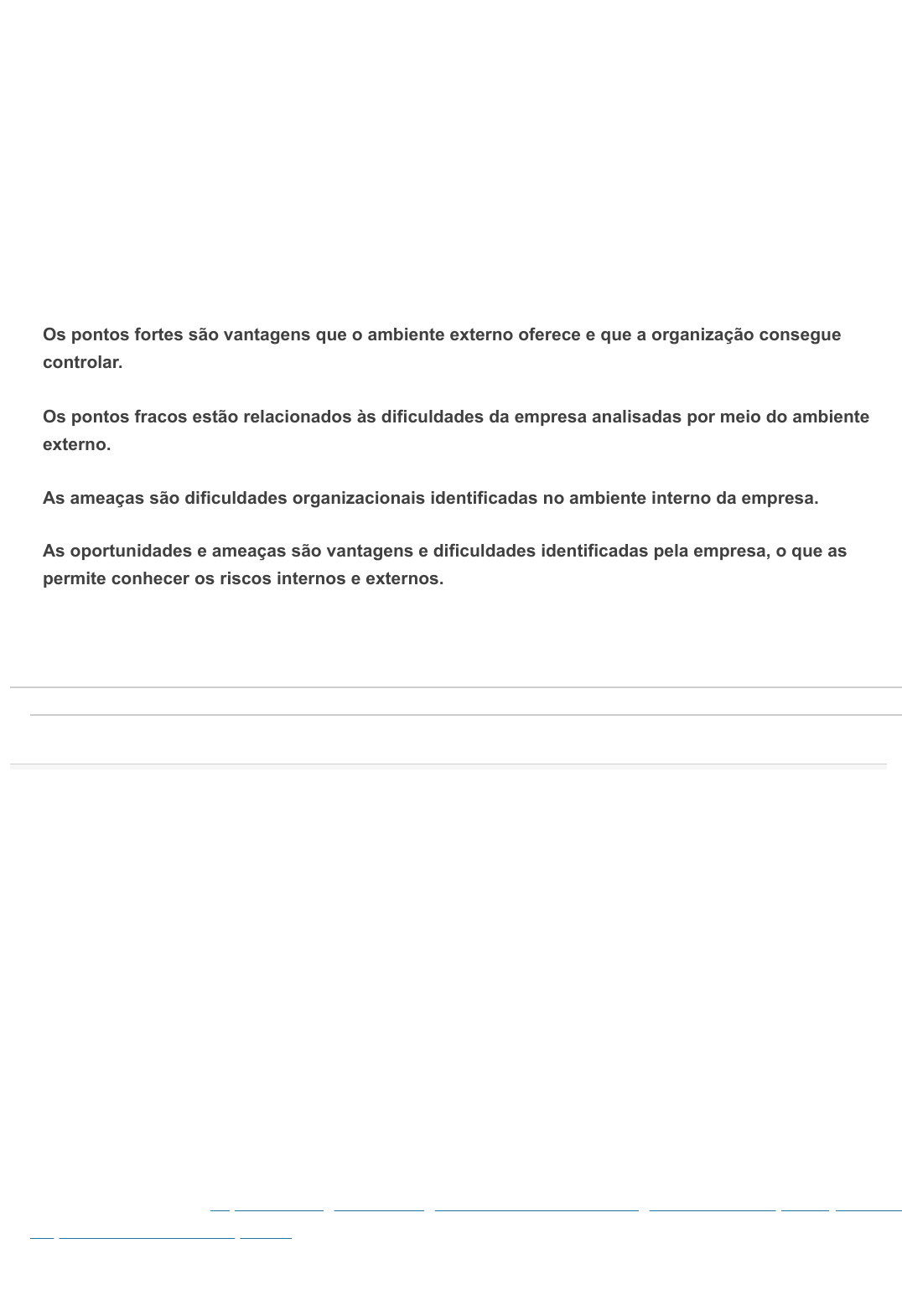 Ocultar opções de resposta Pergunta 1 -- /1 As empresas estão cada vez mais preocupadas com o processo de mudança na economia, uma realidade que gera riscos e oportunidades. Para enfrentar esse desafio na elaboração do planejamento estratégico, realiza-se uma análise integrada do ambiente interno e externo. Nesse processo, também identificam-se as forças, as fraquezas, as oportunidades e as ameaças da empresa. Considerando essas informações e o conteúdo estudado sobre análise ambiental, pode-se afirmar que: Os pontos fortes são vantagens que o ambiente externo oferece e que a organização consegue controlar. Os pontos fracos estão relacionados às dificuldades da empresa analisadas por meio do ambiente externo. As ameaças são dificuldades organizacionais identificadas no ambiente interno da empresa. As oportunidades e ameaças são vantagens e dificuldades identificadas pela empresa, o que as permite conhecer os riscos internos e externos. Resposta corret As oportunidades são as vantagens que o ambiente externo oferece e que a organização poderá aproveitar. Pergunta 2 -- /1 Leia o trecho a seguir: “Hoje, ter uma boa ideia e desenvolver um bom plano de negócios é apenas o primeiro passo que uma empresa deve fazer para ter sucesso em seu segmento. Em um mundo altamente competitivo, é importante ir além e se posicionar sempre à frente da concorrência – o que significa saber utilizar os dados a favor com o atual cenário de conectividade. Por conta disso, uma das primeiras estratégias utilizadas por empreendedores compreende justamente o armazenamento de informações relevantes para a organização e que podem oferecer insights importantes no futuro. Fonte: ALBUQUERQUE, R. Como a inteligência de dados pode ajudar a sua empresa a ficar mais competitiva. 2019. Disponível em: . Acesso em: 31/07/2019. Considerando essas informações e o conteúdo estudado sobre análise de mercado, analise as afirmativas a seguir. I O armazenamento de informações relevantes para a organização permite que a empresa desenvolva https://www.segs.com.br/seguros/153268-como-a-inteligencia-de-dados-pode-ajudar-sua-empresa-a-ficar-mais-competitiva Ocultar opções de resposta II. A obtenção de dados importantes para a empresa permite que o processo de inteligência competitiva desenvolva ações antecipadas com o objetivo que se pretende atingir. III. Estratégias competitivas devem ser direcionadas para atingir novos clientes. IV. Quanto mais informações, melhor para a empresa, para que se possa analisar e perceber todas as possibilidades antes de tomar uma decisão. Está correto apenas o que se afirma em: Resposta corretI, II e IV. I, III e IV. II e III. I e III. I, II e III. Pergunta 3 -- /1 Analise a seguinte situação-problema: Um empreendedor deseja montar um food truck (automóvel que comercializa comida) para vender hambúrguer, oferecendo pratos elaborados a preços acessíveis. Para tanto, buscou analisar seus concorrentes e possível loc de atividade; analisou o comportamento das pessoas que por lá passavam. Analisou como poderia trazer um serviço diferenciado por meio de atendimento eficaz e eficiente e, assim, desenvolveu o delivery, para atender a pessoas que estavam em seu trabalho ou em sua casa. Considerando essas informações e o conteúdo estudado sobre análise ambiental, análise de cenários, planejamento estratégico, análise SWOT e análise de mercado, analise os itens a seguir e associe-os a suas respectivas características. 1) Análise ambiental. 2) Análise de cenários. 3) Missão da empresa. 4) Análise SWOT. 5) Análise de mercado. ( ) Ferramenta que permite ao empreendedor avaliar oportunidades e ameaças, bem como forças e fraquezas. ( ) Premissa básica para o desenvolvimento da empresa bem como do planejamento estratégico. ( ) Informações importantes referentes ao ambiente interno da empresa, como por exemplo, produção, matéria prima, funcionários, entre outros. ( ) Informações importantes sobre onde a empresa pretende atuar, bem como concorrentes, público-alvo, Ocultar opções de resposta ( ) Reforça o planejamento estratégico da empresa e ajuda no desenvolvimento de novos produtos e serviços qu atendam as demandas futuras dos clientes. Agora, assinale a alternativa que apresenta a sequência correta. 2, 3, 4, 5, 1. 1, 3, 2, 5, 4. 3, 4, 2, 1, 5. Resposta corret4, 3, 1, 5, 2. 2, 4, 5, 1, 3. Pergunta 4 -- /1 Leia o trecho a seguir: “Dois bons exemplos de empresas que falharam no processo de mudança são a Blockbuster e Blackberry. Em ambos os casos, essas empresas, além de não serem capazes de perceber as mudanças de contexto, não fora capazes de inovar em relação ao novo ambiente. A falta de capacidade resultou na ruína de empresas que já comandaram o mercado na qual estavam inseridas. Isso evidencia a importância de estarem sempre buscando novo, olhar para o mercado, analisar os concorrentes, necessidade dos clientes! Para entender como gerir o processo de implementação de mudança empresarial é necessário entender o que de fato são estas mudanças quais são as motivações.” Fonte: Gestão de Mudanças Organizacionais. 2018. Disponível em: . Acesso em: 30/07/2019. Considerando essas informações e o conteúdo estudado sobre planejamento estratégico e análise SWOT, analise as afirmativas a seguir e assinale V para a(s) verdadeira(s) e F para a(s) falsa(s). I. As empresas optam pelo planejamento estratégico para responderem de forma rápida e qualitativa às necessidades de mercado. II. As empresas que não se preparam para mudar sempre correm o risco de ficarem para trás, obtendo uma desvantagem competitiva. III. A busca por mudanças organizacionais pode promover um processo de desgaste físico e mental nos colaboradores da empresa. IV. A empresa pode ter decisões mais flexíveis ou rígidas e o impacto do resultado dessas decisões podem traze resultados tanto positivos quanto negativos. V