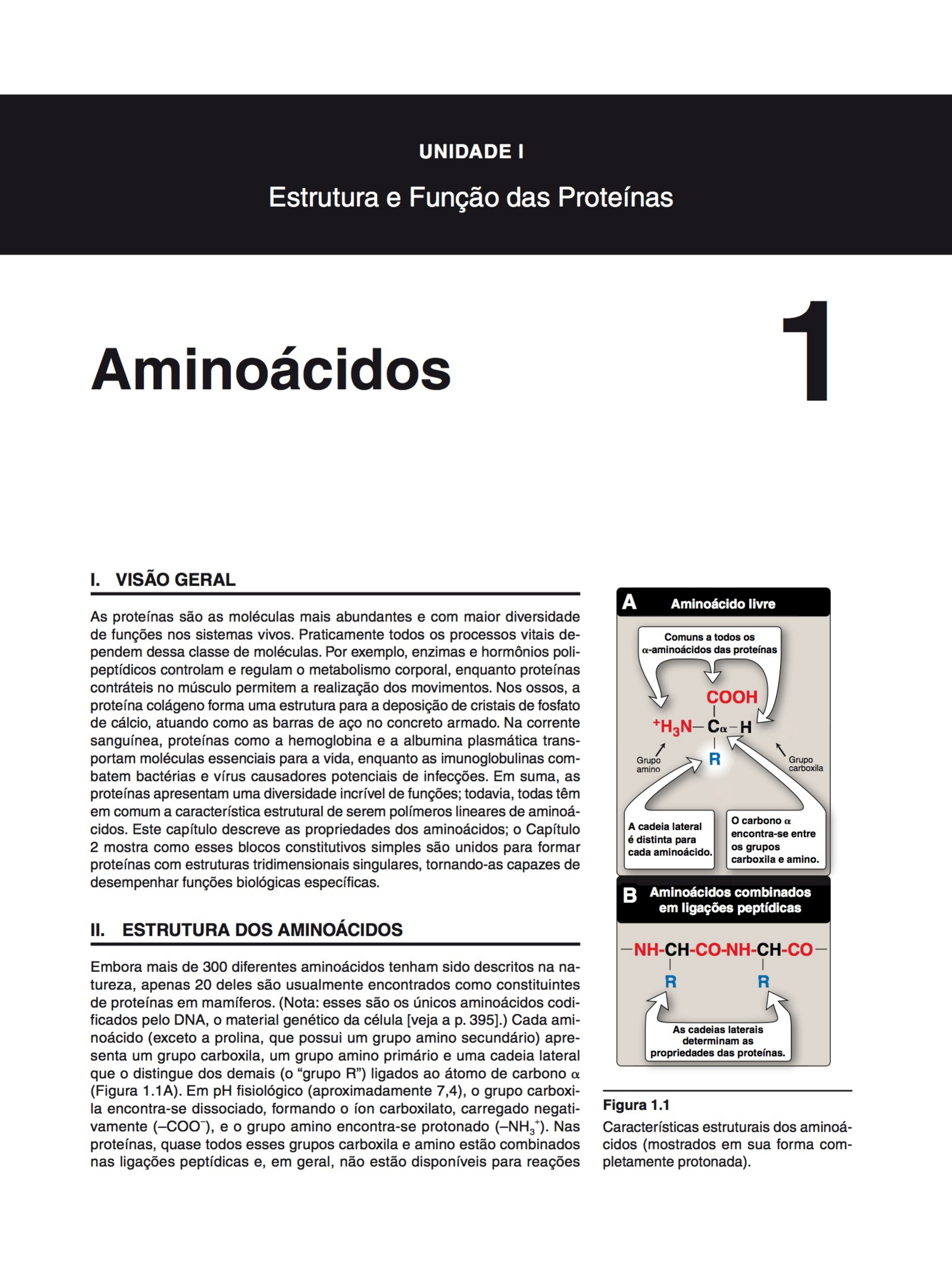 UNIDADE Estrutura e Função das Proteínas Aminoácidos 1 I. VISÃO GERAL A Aminoácido livre As proteínas são as moléculas mais abundantes e com maior diversidade de funções nos sistemas vivos. Praticamente todos os processos vitais de- Comuns a todos os pendem dessa classe de moléculas. Por exemplo, enzimas e hormônios poli- das proteínas peptídicos controlam e regulam o metabolismo corporal, enquanto proteínas contráteis no músculo permitem a realização dos movimentos. Nos ossos, a COOH proteína colágeno forma uma estrutura para a deposição de cristais de fosfato de cálcio, atuando como as barras de aço no concreto armado. Na corrente +H3N- sanguínea, proteínas como a hemoglobina e a albumina plasmática trans- portam moléculas essenciais para a vida, enquanto as imunoglobulinas com- Grupo R Grupo amino carboxila batem bactérias e vírus causadores potenciais de infecções. Em suma, as proteínas apresentam uma diversidade incrível de funções; todavia, todas têm em comum a característica estrutural de serem polímeros lineares de aminoá- o carbono cidos. Este capítulo descreve as propriedades dos aminoácidos; o Capítulo A cadeia lateral encontra-se entre é distinta para 2 mostra como esses blocos constitutivos simples são unidos para formar cada aminoácido. os grupos proteínas com estruturas tridimensionais singulares, tornando-as capazes de carboxila e amino. desempenhar funções biológicas específicas. B Aminoácidos combinados em ligações peptídicas II. ESTRUTURA DOS AMINOÁCIDOS Embora mais de 300 diferentes aminoácidos tenham sido descritos na na- tureza, apenas 20 deles são usualmente encontrados como constituintes R R de proteínas em mamíferos. (Nota: esses são os únicos aminoácidos codi- ficados pelo DNA, o material genético da célula [veja a p. 395].) Cada ami- As cadeias laterais noácido (exceto a prolina, que possui um grupo amino secundário) apre- determinam as senta um grupo carboxila, um grupo amino primário e uma cadeia lateral propriedades das proteínas. que o distingue dos demais (o "grupo R") ligados ao átomo de carbono a (Figura 1.1A). Em pH fisiológico (aproximadamente 7,4), o grupo carboxi- la encontra-se dissociado, formando o íon carboxilato, carregado negati- Figura 1.1 vamente e o grupo amino encontra-se protonado Nas Características estruturais dos aminoá- proteínas, quase todos esses grupos carboxila e amino estão combinados cidos (mostrados em sua forma com- nas ligações peptídicas e, em geral, não estão disponíveis para reações pletamente protonada).2 Harvey & Ferrier químicas, exceto pela possibilidade de formação de ligações de hidrogênio (Figura 1.1B). Portanto, em última análise, é a natureza dessas cadeias laterais que determina o papel do aminoácido na proteína. Por isso, é útil classificá-los de acordo com as propriedades de suas cadeias laterais - ou seja, se são apolares (apresentam distribuição homogênea de elétrons) ou polares (apresentam distribuição desigual de elétrons, como no caso de ácidos e bases; Figuras 1.2 e 1.3). A. Aminoácidos com cadeias laterais apolares Cada um desses aminoácidos possui uma cadeia lateral apolar, que é inca- paz de receber ou doar prótons, de participar em ligações ou de hidro- gênio (Figura 1.2). As cadeias laterais desses aminoácidos podem ser vistas como "oleosas", ou semelhantes a lipídeos, uma propriedade que promove interações hidrofóbicas (veja a Figura 2.10, p. 19). 1. Localização dos aminoácidos apolares nas proteínas. Nas pro- teínas encontradas em soluções aquosas - um ambiente polar as Cadeias laterais apolares COOH COOH COOH C H +H3N +H3N H CH3 CH H3C Glicina Alanina Valina COOH COOH COOH +H3N-C-H +H3N-C-H +H3N-C-H CH2 H-C-CH3 CH2 CH CH2 H3C CH3 Leucina Isoleucina Fenilalanina COOH COOH +H3N +H3N C-H COOH CH2 CH2 +H2N C-H C CH2 H2C S CH2 CH N H CH3 Triptofano Metionina Prolina Figura 1.2 A classificação dos 20 aminoácidos comumente encontrados nas proteínas, de acordo com a carga e a polaridade de suas laterais em pH ácido, é mostrada aqui e continua na Figura 1.3. Cada aminoácido é mostrado em sua forma completamente protonada, com os íons hidrogênio dissociáveis representados em vermelho. Os valores de para os grupos e dos aminoácidos apolares são semelhantes àqueles mostrados para a glicina (continua na Figura 1.3).Bioquímica Ilustrada 3 Cadeias laterais polares desprovidas de carga COOH +H3N-C-H COOH COOH CH2 +H3N-C-H +H3N-C-H H-C-OH H-C-OH H CH3 OH - Serina Treonina Tirosina COOH COOH +H3N-C-H COOH - CH2 CH2 +H3N-C-H CH2 CH2 NH2 SH NH2 Asparagina Glutamina Cisteína Cadeias laterais ácidas COOH COOH pK3=9,8 +H3N C-H CH2 CH2 CH2 o OH o OH 4,3 Ácido aspártico Ácido glutâmico Cadeias laterais básicas COOH COOH COOH +H3N - C - H +H3N-C-H +H3N-C-H CH2 CH2 CH2 C CH CH2 CH2 NH CH2 CH2 C H CH2 N-H NH3+ C=NH2+ NH2 Histidina Lisina Arginina Figura 1.3 A classificação dos 20 aminoácidos comumente encontrados nas proteínas, de acordo com a carga e a polaridade de suas cadeias laterais em pH ácido (continuação da Figura 1.2).4 Harvey & Ferrier cadeias laterais apolares dos aminoácidos tendem a agrupar-se no Aminoácidos apolares Aminoácidos apolares interior da proteína (Figura 1.4). Esse fenômeno, conhecido como (O) agrupados agrupados na superfície no interior de de proteínas de membrana. efeito hidrofóbico, é o resultado da hidrofobicidade dos grupos R proteínas solúveis. apolares, que atuam como gotículas de óleo coalescendo em am- biente aquoso. Desse modo, os grupos R apolares preenchem o in- terior da proteína à medida que ela se dobra e ajudam a estabelecer sua forma tridimensional. Entretanto, nas proteínas localizadas em ambiente hidrofóbico, como o interior de uma membrana, os grupos Membrana celular R apolares são encontrados na superfície da proteína, interagindo com o ambiente lipídico (veja a Figura 1.4). A importância dessas intera