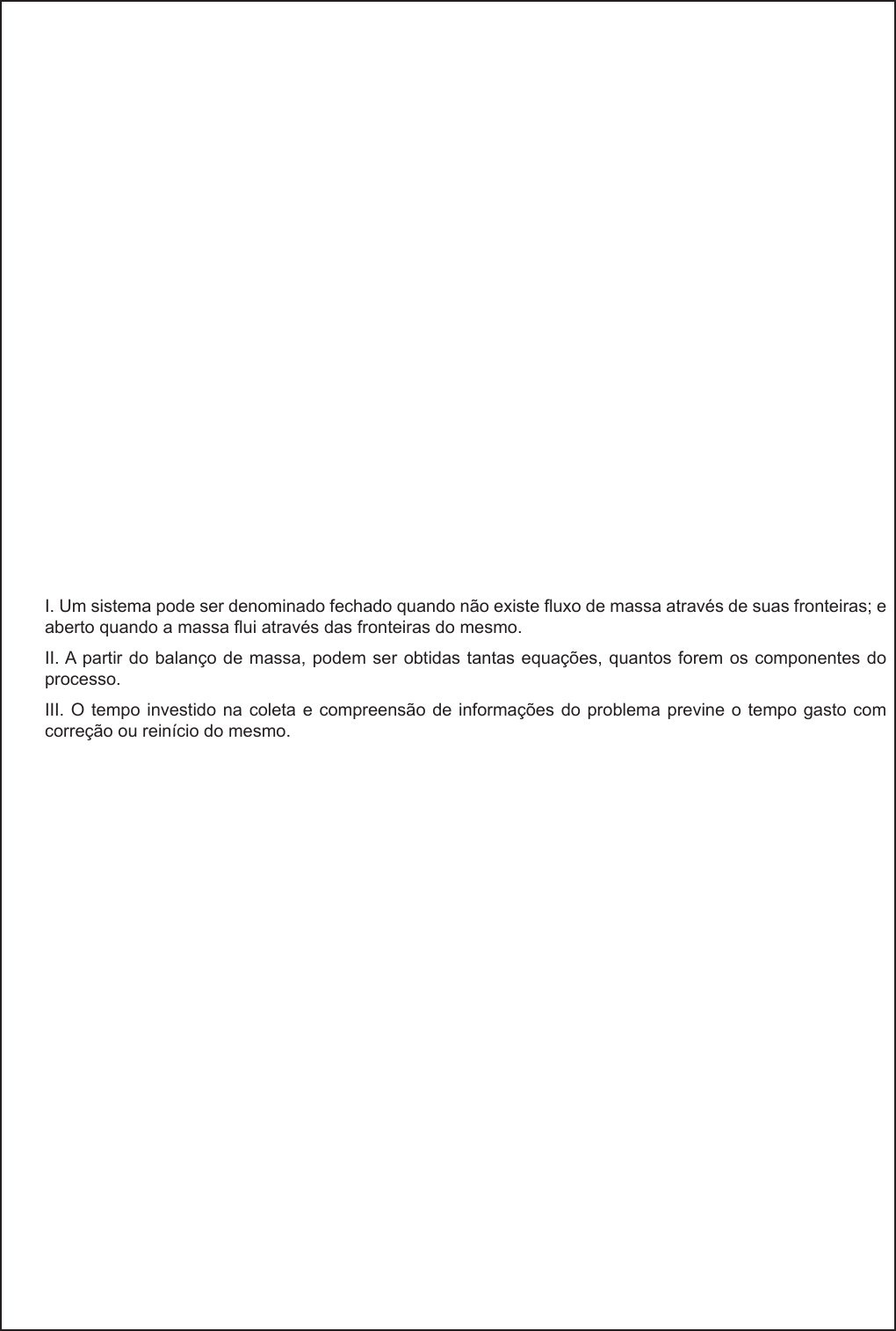 15 EAOEAR 2018 - Engenharia Química (QUI) - Versão A 37) O polietileno (PE) é um dos plásticos mais importantes da atualidade, principalmente entre os termoplásticos, aqueles que se deformam com o calor. No caso do polietileno, a temperatura de deformação e fusão está entre 110ºC e 115°C. O polietileno pode existir em cinco diferentes variações, que são: PEAD (polietileno de alta densidade), PEBD (polietileno de baixa densidade), PELBD (polietileno linear de baixa densidade ou PEBDL), PEUAPM (polietileno de ultra-alto peso molecular) e PEUBD (polietileno de ultrabaixa densidade). Todos podem ser reciclados e comercializados como material recuperado. O polietileno, em suas variadas formas, possui propriedades únicas, tais como resistência ao impacto, alta flexibilidade, boa trabalhabilidade e estabilidade térmica e química (em determinadas condições). Informe se é verdadeiro (V) ou falso (F) o que se afirma abaixo sobre o polietileno. (...) Por meio da escolha de catalisadores apropriados e condições de reação, é possível controlar o tipo de polietileno gerado. (...) O etileno não polimeriza sob condições suaves na ausência de um catalisador. As moléculas de etileno teriam de colidir a uma energia muito elevada para reagirem entre si. (...) O polietileno pode ser obtido através de reações de polimerização por condensação. A alternativa que apresenta a sequência correta é a) (V); (V); (F). b) (V); (F); (V). c) (F); (V); (F). d) (F); (F); (V). 38) O balanço de massa representa uma peça fundamental do projeto de equipamentos e torna-se complexo quando tratamos de processos constituídos por diversos equipamentos interligados. Tal complexidade aumenta em sistemas multifásicos, heterogêneos e com reações químicas. Analise as assertivas abaixo. I. Um sistema pode ser denominado fechado quando não existe fluxo de massa através de suas fronteiras; e aberto quando a massa flui através das fronteiras do mesmo. II. A partir do balanço de massa, podem ser obtidas tantas equações, quantos forem os componentes do processo. III. O tempo investido na coleta e compreensão de informações do problema previne o tempo gasto com correção ou reinício do mesmo. IV. Na operação em regime estacionário, os valores das variáveis de processo variam com o tempo em alguma posição fixa do processo. Está correto apenas o que se afirma em a) I e III. b) I, II e III. c) I, II e IV. d) II, III e IV. 39) A equação de Bernoulli descreve o comportamento de um fluido que se move ao longo de um tubo ou conduto, podendo ser utilizada para calcular a velocidade da água. A equação pode ser escrita: P1+ ρυ +ρgh1 = P2+ ρυ+ρgh2 , em que: υ = velocidade do fluido ao longo do conduto. g = aceleração da gravidade. h = altura em relação a um referencial. P = pressão ao longo do recipiente. ρ = massa específica do fluido. Considerando que uma represa retira a água em um grande lago artificial, sabe-se que o volume retirado é insignificante. Assim sendo, se a barragem tem um pequeno buraco a 1,4m abaixo da superfície do lago, a que velocidade a água sai do buraco? a) ± 4,6m/s b) ± 5,2m/s c) ± 8,0m/s d) ± 13,7m/s www.pciconcursos.com.br EAOEAR 2018 - Engenharia Química (QUI) - Versão A 16 40) Em qualquer sistema de bombeamento, o papel da bomba é proporcionar pressão suficiente para superar a pressão de funcionamento do sistema a fim de mover o fluido a uma taxa de fluxo necessária. A pressão de funcionamento do sistema é uma função do fluxo através do sistema e da disposição do sistema em termos de comprimento do tubo, acessórios, diâmetro do tubo, alteração na elevação do líquido, pressão sobre a superfície do líquido etc. Informe se é verdadeiro (V) ou falso (F) o que se afirma abaixo sobre sistemas de bombas. (...) O NPSHD (disponível) é influenciado por quatro variáveis resultantes do sistema no qual a bomba irá operar. Essas quatro variáveis estão sob controle do fabricante e, portanto, devem ser consultadas. (...) O NPSHR (requerido) é resultante do projeto da bomba e é controlado apenas pelo fabricante. O fabricante da bomba deverá saber informar o NPSH requerido por suas bombas operando em determinadas condições. (...) Todas as bombas que trabalham livre de cavitação respeitam a seguinte regra: NPSHD > NPSHR. A alternativa que apresenta a sequência correta é a) (F); (F); (V). b) (F); (V); (V). c) (V); (V); (F). d) (V); (F); (F). 41) Os confinamentos nos quais ocorrem reações químicas são chamados reatores. Existem vários tipos de reatores químicos e várias maneiras de classificá-los. Informe se é verdadeiro (V) ou falso (F) o que se afirma abaixo sobre Reatores. (...) O reator em batelada é um tipo de vaso largamente usado em processos industriais. As vantagens de um reator de batelada residem em sua versatilidade. (...) Reator perfeitamente agitado (RPA) é um tipo de reator ideal comum em engenharia química. Frequentemente refere-se a um modelo usado para estimar as variáveis principais de uma operação unitária. (...) Reator de fluxo em pistão (PFR) é usado para descrever reações químicas em sistemas de fluxo contínuo. (...) A manutenção de reatores RPA é mais cara do que a manutenção dos reatores RFP. (...) Reatores de fluxo em pistão têm uma conversão por unidade de volume baixa, mas operam por longos períodos de tempo sem manutenção. A alternativa que apresenta a sequência correta é a) (V); (F); (F); (V); (V). b) (F); (V): (V); (F); (V). c) (V); (V); (F); (V); (F). d) (V); (V); (V); (F); (F). 42) Um catalisador é uma substância que faz variar a velocidade de uma reação química sem que ele próprio sofra uma variação química permanente no processo. Os catalisadores são bem comuns, muitas reações na indústria química ocorrem com a ajuda de catalisadores. Informe se é verdadeiro (V) ou falso (F) o que se afirma abaixo sobre a Catálise Homogênea. (...)
