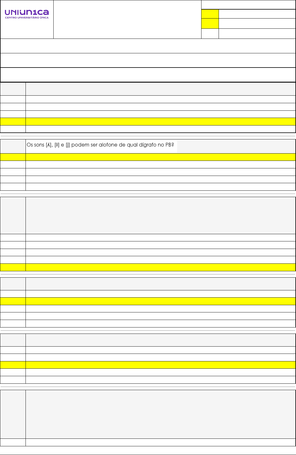 Pincel Atômico - 29/01/2025 10:22:54 1/4 KELY AZEVEDO MONTEIRO Recuperação Online (SALA EAD) - Todos Capitulos/Referencias Atividade finalizada em 28/01/2025 15:09:04 (3146670 / 1) LEGENDA Resposta correta na questão # Resposta correta - Questão Anulada X Resposta selecionada pelo Aluno Disciplina: FONÉTICA E FONOLOGIA [1426595] - Avaliação com 20 questões, com o peso total de 100,00 pontos [capítulos - Todos] Turma: Segunda Graduação: Licenciatura em Letras - Português e Inglês p/ Licenciados - Grupo: DEZEMBRO/2024 - SGice0A021224 [152478] Aluno(a): 91708016 - KELY AZEVEDO MONTEIRO - Respondeu 19 questões corretas, obtendo um total de 95,00 pontos como nota [362219_193397] Questão 001 Quantos sons surdos podemos encontrar na seguinte frase: "Antes tarde do que nunca"? (ATENÇÃO! Não contaremos sons repetidos). 2. 5. 4. X 3. 6. [362219_193413] Questão 002 X Lh Nh Rr Gu Ch [362219_193406] Questão 003 Sobre o acento tônico, analise as sentenças e marque a opções corretas: I. O acento primário terá um valor puramente fonético. II. Palavras paroxítonas são mais comuns no português brasileiro que oxítonas e proparoxítonas. III. O acento secundário tem valor puramente fonético sendo incapaz de diferenciar palavras. IV. As palavras oxítonas, paroxítonas e proparoxítonas podem ser acabadas tanto em vogais quanto em consoante. V. Proparoxítonas com coda final absoluta é um padrão raro. Todas as sentenças estão incorretas. Somente as sentenças I, II e V estão corretas. Somente as sentenças I, IV e V estão corretas. Todas as sentenças estão corretas. X Todas as sentenças estão corretas, exceto a I. [362219_193403] Questão 004 Marque a opção em que a sequência de palavras seja finalizada com sílabas abertas: Lápis – Caneta – Papel Quadrado – Dedo – Travesseiro X Cantar – Para - Constituir Celular – Visão – Mesa Cama – Teclar – Pães [362219_193405] Questão 005 Marque a alternativa em que apresentamos a sequência oxítona, paroxítona e proparoxítona, respectivamente: Jovem – Cipó – Quente Sofá – Ínterim – Fácil X Barril – Escola - Córrego Abóbora – Viver – Estudar Pá – Dólar - Árvore [362219_193391] Questão 006 Com base no assunto estudado nessa unidade, analise as sentenças a seguir e marque a opção correta. I. Tanto a fonética quanto a fonologia são disciplinas que transitam por outros campos de trabalho, tais como: fonoaudiologia, dramaturgia e tradução. II. De um modo geral a fonética costuma ser dividida em três grandes ramos: a articulatória, a acústica e a perceptiva. III. A fonética articulatória corresponde à emissão dentro do ato comunicativo. IV. A fonética articulatória estuda a produção do som desde o ponto de vista fisiológico. V. A fonética acústica é responsável pela percepção dos sons, portanto, dentro do ato comunicativo está ligada à recepção dos sons. Todas as alternativas estão incorretas, exceto a I e a IV. Pincel Atômico - 29/01/2025 10:22:54 2/4 Todas as alternativas estão corretas. Todas as alternativas estão corretas, exceto a II. Todas as alternativas estão incorretas. X Todas as alternativas estão corretas, exceto a V. [362219_191223] Questão 007 IDCAP - 2018 - Prefeitura de Serra - ES - Professor - Língua Portuguesa Observando a classificação das vogais basicamente articulatória da língua portuguesa nos exemplos abaixo, indique a alternativa correta quanto ao grau de abertura. Abertas e semiabertas; velares e nasais. X Abertas e semiabertas; fechadas e semifechadas. Palatais; nasais; orais. Orais; nasais; palatais. Palatais; nasais; velares. [362219_191214] Questão 008 Avança SP - 2020 - Prefeitura de Itatiba - SP - PEB II - Língua Portuguesa Concernente à classificação das consoantes, analise os critérios abaixo: I – quanto ao modo de articulação. II – quanto à zona de articulação. III – quanto ao papel das cordas vocais. apenas o item I é verdadeiro. X todos os itens são verdadeiros. apenas o item II é verdadeiro. apenas os itens I e III são verdadeiros. apenas o item III é verdadeiro. [362219_191251] Questão 009 (Prova AMEOSC - 2022 - Prefeitura de São Miguel do Oeste - SC - Professor de Língua Portuguesa- adaptada) Se tomarmos o verbo vendiam e trocarmos o seu primeiro som para p teremos pendiam, que é uma outra palavra em português, a qual se distingue de vendiam apenas pela diferença no seu primeiro som. Ainda se trocarmos o som inicial de as (artigo feminino plural) para o, passaremos a os (artigo masculino plural). O mesmo pode acontecer com gatos que pode ser passado a galos, com a troca de seu terceiro som t para l, significando um outro animal; ou ainda trocando seu primeiro som g para r passando a ter também outro significado (ratos). Fonte: https://ppglin.posgrad.ufsc.br/files/2013/04/Livro_Fonetica_e_Fonologia.pdf Essas unidades mínimas que distinguem as palavras entre si são denominadas: alofones. variantes. X fonemas. consoantes. morfemas [362219_193407] Questão 010 Quantas sílabas têm as seguintes palavras: queijo – deixo – Paraguai? X 2 – 2 – 3. 3 – 2 – 2. 2 – 2 – 2. 3 – 2 – 3. 2 – 3 – 2. [362219_191211] Questão 011 (Prova AMEOSC - 2022 - Prefeitura de São Miguel do Oeste - SC - Professor de Língua Portuguesa- adaptada) Tanto a Fonética quanto a Fonologia têm como objeto de estudo os sons da fala. Ou melhor dizendo, tanto a fonética quanto a fonologia investigam como os seres humanos produzem e ouvem os sons da fala. "A definição de fonema necessita da compreensão do que seja uma unidade distintiva. As línguas naturais formam-se da união de dois conceitos: __________________________é a imagem acústica do som que ainda se constitui em uma abstração. __________________________tem a ver com a ideia que essa imagem acústica transporta." Fonte: https://ppglin.posgrad.ufsc.br/files/2013/04/Livro_Fonetica_e_Fonologia.pdf Assinale a sequência 