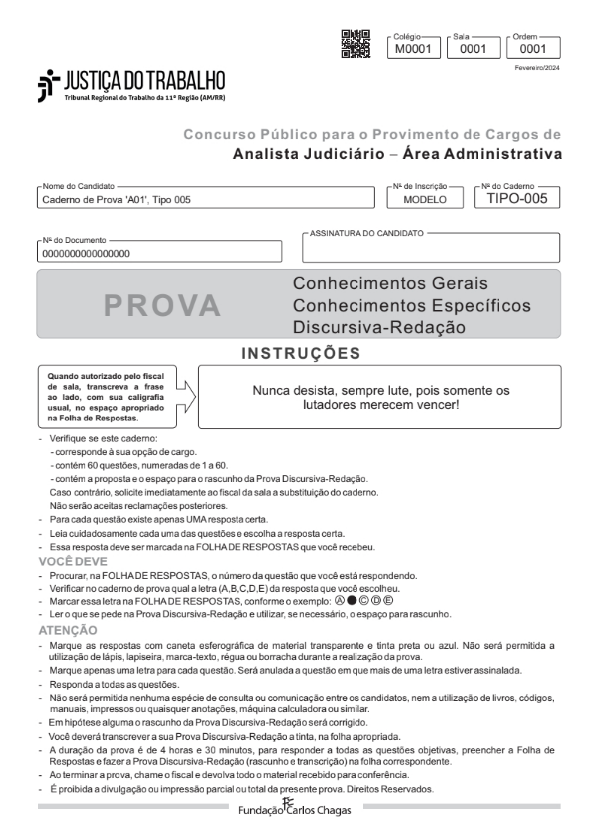 Colégio Sala Ordem M0001 0001 0001 Fevereiro/2024 JUSTIÇA DO TRABALHO Tribunal Regional do Trabalho da Região (AM/RR) Concurso Público para o Provimento de Cargos de Analista Judiciário Área Administrativa Nome do Candidato N° de Inscrição N° do Caderno Caderno de Prova 'A01', Tipo 005 MODELO TIPO-005 ASSINATURA DO CANDIDATO do Documento 0000000000000000 Conhecimentos Gerais PROVA Conhecimentos Específicos Discursiva-Redação INSTRUÇÕES Quando autorizado pelo fiscal de sala, transcreva a frase Nunca desista, sempre lute, pois somente os ao lado, com sua caligrafia usual, no espaço apropriado lutadores merecem vencer! na Folha de Respostas. Verifique se este caderno: corresponde à sua opção de cargo. contém 60 questões, numeradas de 1 a 60. contém a proposta e o espaço para o rascunho da Prova Discursiva-Redação. Caso contrário, solicite imediatamente ao fiscal da sala a substituição do caderno. Não serão aceitas reclamações posteriores. Para cada questão existe apenas UMA resposta certa. Leia cuidadosamente cada uma das questões e escolha a resposta certa. Essa resposta deve ser marcada na FOLHADE RESPOSTAS que você recebeu. VOCÊ DEVE Procurar, na FOLHADE RESPOSTAS, o número da questão que você está respondendo. Verificar no caderno de prova qual a letra (A,B,C,D,E) da resposta que você Marcar essa letra na FOLHADE RESPOSTAS, conforme o exemplo: A D E Ler o que se pede na Prova Discursiva-Redação e utilizar, se necessário, o espaço para rascunho. ATENÇÃO Marque as respostas com caneta esferográfica de material transparente e tinta preta ou azul. Não será permitida a utilização de lápis, lapiseira, marca-texto, régua ou borracha durante a realização da prova. Marque apenas uma letra para cada questão. Será anulada a questão em que mais de uma letra estiver assinalada. Responda a todas as questões. Não será permitida nenhuma espécie de consulta ou comunicação entre os candidatos, nem a utilização de livros, códigos, impressos ou quaisquer anotações, máquina calculadora ou similar. Em hipótese alguma o rascunho da Prova Discursiva-Redação será corrigido. Você deverá transcrever a sua Prova Discursiva-Redação a tinta, na folha apropriada. A duração da prova é de 4 horas e 30 minutos, para responder a todas as questões objetivas, preencher a Folha de Respostas e fazer a Prova Discursiva-Redação (rascunho e transcrição) na folha correspondente. Ao terminar a prova, chame o fiscal e devolva todo o material recebido para conferência. É proibida a divulgação ou impressão parcial ou total da presente prova. Direitos Reservados. Fundação Carlos ChagasCaderno de Prova Tipo 005 CONHECIMENTOS GERAIS Língua Portuguesa Atenção: Para responder às questões de números 1 a no texto abaixo. Temos que acreditar Será que podemos entender o mundo sem algum tipo de crença? Esta é uma pergunta central na dicotomia entre ciência e fé. De fato, o modo como um indivíduo escolhe responder a ela determina, em grande parte, como se relaciona com o mundo e a vida em geral. Contrastando as explicações e cientificas da realidade, podemos dizer que muitos religiosos buscam explicar o desco- com o enquanto a ciência busca explicar o desconhecido com o Muito da tensão entre ciência e fé vem da suposição de que existem duas realidades mutuamente incompatíveis, uma dentro deste mundo (e, portanto, através da aplicação diligente do método e outro fora dele (e, portanto, "desco- relacionada tradicionalmente à crença religiosa). Mitos religiosos permitem que os que neles creem transcendam sua "situação a perplexidade que sentimos ao compreendermos que somos criaturas delimitadas pelo tempo, cada um com uma história que tem um começo e um fim. Em um mais pragmático, explicações miticas de naturais são tentativas de dar sentido áquilo que existe além do controle A motivação por trás dessas explicações não é tão diferente daquela da já que ambas tentam de alguma forma revelar mecanismos por trás dos fenómenos naturais: afinal, tanto deuses quanto forças físicas coisas acontecer, mesmo que de formas radicalmente distintas. Tanto cientista quanto o crente acreditam em causas não compreendidas, ou seja, em coisas que ocorrem por razões desconhecidas, mesmo que a natureza da causa seja completamente diferente para cada um. (Adaptado de: GLEISER, Marcelo. A ilha do conhecimento. Rio de Janeiro: Record, 2023, p. 31-32) 1. Considerando-se o contexto, traduz-se adequadamente o sentido de um segmento do texto em: (A) explicações miticas de (3° parágrafo) = suposições de ocorrências (B) a motivação por trás dessas explicações parágrafo) = a causa oculta dessas elucidações (C) uma pergunta central na dicotomia (1° parágrafo) = um mistério essencial na relativização (D) aplicação diligente do método parágrafo) = administração implícita da prática (E) Em um mais pragmático (3° parágrafo) = com um teor mais concebível 2. As normas de concordância verbal estão plenamente observadas na frase: (A) É comum que mesmo aos cientistas mais diligentes venham a faltar, em suas pesquisas, o acerto necessário na condução dos seus métodos. (B) aprimoramento dos métodos possibilitam aos pesquisadores alimentar esperanças no sucesso do empreendi- mento que os inspiram. (C) Não resta aos cientistas ou religiosos senão tomarem para si o dever de encontrar respostas a todo e qualquer mistério que os intrigue. (D) Não são de se supor que os mistérios que a cada leigo intriga não preocupe também os cientistas mais determinados e os religiosos mais convictos. (E) que mais convêm aos cientistas é apurarem seus métodos de investigação, assim como não podem faltar aos religiosos o apoio da fé. 3. No primeiro parágrafo do texto, afirma-se, essencialmente, que (A) as explicações religiosas e derivam de uma mesma motivação inicial em face do que é desconhecido. (B) os r
