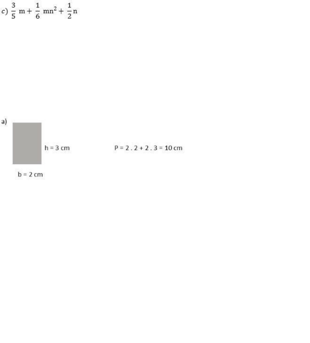 Expressões algébricas Expressões algébricas são expressões matemáticas que apresentam números, letras e operações. As expressões desse tipo são usadas com frequência em fórmulas e equações. As letras que aparecem em uma expressão algébrica são chamadas de variáveis e representam um valor desconhecido. Os números escritos na frente das letras são chamados de coeficientes e deverão ser multiplicados pelos valores atribuídos as letras. Exemplos a) x + 5 b) b2 – 4ac Cálculo de uma Expressão Algébrica O valor de uma expressão algébrica depende do valor que será atribuído às letras. Para calcular o valor de uma expressão algébrica devemos substituir os valores das letras e efetuar as operações indicadas. Lembrando que entre o coeficiente e a letras, a operação é de multiplicação. Exemplo O perímetro de um retângulo é calculado usando a fórmula: P = 2b + 2h Substituindo as letras com os valores indicados, encontre o perímetro dos seguintes retângulos Monômio Expressão algébrica definida apenas pela multiplicação entre o coeficiente e a parte literal. Exemplos: 2x, 4ab, 10x², 20xyz, 30abc, 2z, y, b³, 100ax³ Monômios semelhantes Expressões algébricas que possuem a parte literal semelhante. Exemplos: 2x e 4x 7x² e 8x² 10ab e 3ab Adição e subtração de monômio A adição e a subtração de monômio devem ser efetuadas quando as partes literais são semelhantes. Exemplos: 2a + 7a = 9a 5x – 2x = 3x 10ab – 9ab = ab 6y – 9y = – 3y Multiplicação entre monômios Ao multiplicar monômios em que as partes literais são semelhantes devemos seguir os seguintes passos: 1º passo: multiplicar os coeficientes 2º passo: conservar a parte literal e somar os expoentes. Exemplos: 2x * 2x = 4x² 4xy * 6xy² = 24x²y³ Divisão entre monômios Parte literal semelhantes 1º passo: dividir os coeficientes 2º passo: conservar a parte literal e subtrair os expoentes Exemplo: 5x³ : 5x² = x 10x²y² : 2x = 5xy² Polinômios Expressão algébrica composta por dois ou mais monômios com a existência de operações entre eles. Exemplos: 2x² + 7x – 6 10x³ + x² – 9x 6x + 5 120x² – 10x + 9 14x4 + 7x³ – 20x² – 60x – 100 image1.jpeg image2.jpeg
