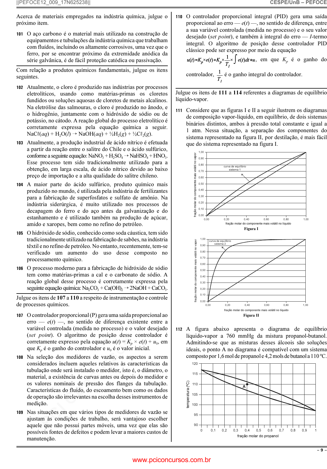 pcimarkpci MjgwNDowMTRjOjViYWU6ODBiMjphODllOmQ3ZTE6NDI5YTozMmI4:U2F0LCAyNSBKYW4gMjAyNSAxMDo0ODo0OSAtMDMwMA== www.pciconcursos.com.br ||PEFOCE12_009_17N625238|| CESPE/UnB – PEFOCE – 9 – Acerca de materiais empregados na indústria química, julgue o próximo item. 101 O aço carbono é o material mais utilizado na construção de equipamentos e tubulações da indústria química que trabalham com fluídos, incluindo os altamente corrosivos, uma vez que o ferro, por se encontrar próximo da extremidade anódica da série galvânica, é de fácil proteção catódica ou passivação. Com relação a produtos químicos fundamentais, julgue os itens seguintes. 102 Atualmente, o cloro é produzido nas indústrias por processos eletrolíticos, usando como matérias-primas os cloretos fundidos ou soluções aquosas de cloretos de metais alcalinos. Na eletrólise das salmouras, o cloro é produzido no ânodo, e o hidrogênio, juntamente com o hidróxido de sódio ou de potássio, no cátodo. A reação global do processo eletrolítico é corretamente expressa pela equação química a seguir. NaCR(aq) + H2O(l) ÷ NaOH(aq) + ½H2(g) + ½CR2(g). 103 Atualmente, a produção industrial de ácido nítrico é efetuada a partir da reação entre o salitre do Chile e o ácido sulfúrico, conforme a seguinte equação: NaNO3 + H2SO4 ÷ NaHSO4 + HNO3. Esse processo tem sido tradicionalmente utilizado para a obtenção, em larga escala, de ácido nítrico devido ao baixo preço de importação e a alta qualidade do salitre chileno. 104 A maior parte do ácido sulfúrico, produto químico mais produzido no mundo, é utilizada pela indústria de fertilizantes para a fabricação de superfosfatos e sulfato de amônio. Na indústria siderúrgica, é muito utilizado nos processos de decapagem do ferro e do aço antes da galvanização e do estanhamento e é utilizado também na produção de açúcar, amido e xaropes, bem como no refino do petróleo. 105 O hidróxido de sódio, conhecido como soda cáustica, tem sido tradicionalmente utilizado na fabricação de sabões, na indústria têxtil e no refino de petróleo. No entanto, recentemente, tem-se verificado um aumento do uso desse composto no processamento químico. 106 O processo moderno para a fabricação de hidróxido de sódio tem como matérias-primas a cal e o carbonato de sódio. A reação global desse processo é corretamente expressa pela seguinte equação química: Na2CO3 + Ca(OH)2 ÷ 2NaOH + CaCO3. Julgue os itens de 107 a 110 a respeito de instrumentação e controle de processos químicos. 107 O controlador proporcional (P) gera uma saída proporcional ao erro — e(t) —, no sentido de diferença existente entre a variável controlada (medida no processo) e o valor desejado (set point). O algoritmo de posição desse controlador é corretamente expresso pela equação u(t) = Kp × e(t) + u0, em que Kp é o ganho do controlador e u0 é o valor inicial. 108 Na seleção dos medidores de vazão, os aspectos a serem considerados incluem aqueles relativos às características da tubulação onde será instalado o medidor, isto é, o diâmetro, o material, a existência de curvas antes ou depois do medidor e os valores nominais de pressão dos flanges da tubulação. Características do fluido, do escoamento bem como os dados de operação são irrelevantes na escolha desses instrumentos de medição. 109 Nas situações em que vários tipos de medidores de vazão se ajustam às condições de trabalho, será vantajoso escolher aquele que não possui partes móveis, uma vez que elas são possíveis fontes de defeitos e podem levar a maiores custos de manutenção. 110 O controlador proporcional integral (PID) gera uma saída proporcional ao erro — e(t) —, no sentido de diferença, entre a sua variável controlada (medida no processo) e o seu valor desejado (set point), e também à integral do erro — I-termo integral. O algoritmo de posição desse controlador PID clássico pode ser expresso por meio da equação , em que Kp é o ganho do controlador, é o ganho integral do controlador. Julgue os itens de 111 a 114 referentes a diagramas de equilíbrio líquido-vapor. 111 Considere que as figuras I e II a seguir ilustrem os diagramas de composição vapor-líquido, em equilíbrio, de dois sistemas binários distintos, ambos à pressão total constante e igual a 1 atm. Nessa situação, a separação dos componentes do sistema representado na figura II, por destilação, é mais fácil que do sistema representado na figura I. fr a ç ã o m o la r d o c o m p o n e n te m a is v o lá ti l n o v a p o r fração molar do componente mais volátil no líquido curva de equilíbrio sistema 1 1,00 0,90 0,80 0,70 0,60 0,50 0,40 0,30 0,20 0,10 0,00 0,00 0,20 0,40 0,60 0,80 1,00 Figura I fr a çã o m o la r d o c o m p o n e n te m a is v o lá ti l n o v a p o r fração molar do componente mais volátil no líquido 1,00 0,90 0,80 0,70 0,60 0,50 0,40 0,30 0,20 0,10 0,00 0,00 0,20 0,40 0,60 0,80 1,00 curva de equilíbrio sistema 2 Figura II 112 A figura abaixo apresenta o diagrama de equilíbrio líquido-vapor a 760 mmHg da mistura propanol-butanol. Admitindo-se que as misturas desses álcoois são soluções ideais, o ponto A no diagrama é compatível com um sistema composto por 1,6 mol de propanol e 4,2 mols de butanol a 110 ºC. A 120 115 110 105 100 95 90 te m p e ra tu ra ( ºC ) 0 0,1 0,2 0,3 0,4 0,5 0,6 0,7 0,8 0,9 1 fração molar do propanol www.pciconcursos.com.br pcimarkpci MjgwNDowMTRjOjViYWU6ODBiMjphODllOmQ3ZTE6NDI5YTozMmI4:U2F0LCAyNSBKYW4gMjAyNSAxMDo0ODo0OSAtMDMwMA== www.pciconcursos.com.br ||PEFOCE12_009_17N625238|| CESPE/UnB – PEFOCE – 10 – 113 Considere que a figura abaixo ilustre o diagrama de equilíbrio líquido-vapor, a 100 ºC, da mistura benzeno-tolueno. Se as misturas de ambos os compostos são soluções ideais, então o ponto A, no diagrama, refere-se ao sistema em que a mistura apresenta 4,2 mols de propano