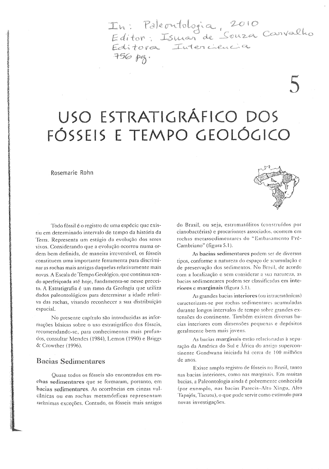 In Paleontologia 2010 Editor : de Souza Carvalho Editora 756 5 USO ESTRATIGRÁFICO DOS FÓSSEIS E TEMPO GEOLÓGICO Rosemarie Rohn Todo fóssil é o registro de uma espécie que exis- do Brasil, ou seja, estromatólitos (construídos por tiu em determinado intervalo de tempo da história da cianobactérias) e procariontes associados. ocorrem em Terra. Representa um estágio da evolução dos seres rochas metassedimentares do "Embasamento Pré- Considerando que a evolução ocorreu numa or- Cambriano" (figura 5.1). dem bem definida, de maneira irreversível, os fósseis As bacias sedimentares podem ser de diversos constituem uma importante ferramenta para discrimi- tipos, conforme a natureza do espaço de acumulação nar as rochas mais antigas daquelas relativamente mais de preservação dos sedimentos. No Brasil, de acordo novas. A Escala de Tempo Geológico, que continua sen- com a localização e sem considerar a sua natureza, as do aperfeiçoada até hoje, fundamenta-se nesse precei- bacias sedimentares podem ser classificadas em inte- A Estratigrafia é um ramo da Geologia que utiliza riores e marginais (figura 5.1). dados paleontológicos para determinar a idade relati- As grandes bacias interiores (ou intracratônicas) va das rochas, visando reconhecer a sua distribuição caracterizam-se por rochas sedimentares acumuladas espacial. durante longos intervalos de tempo sobre grandes ex- No presente capítulo são introduzidas as infor- tensões do continente. Também existem diversas ba- mações básicas sobre uso estratigráfico dos fósseis, cias interiores com dimensões pequenas e depósitos recomendando-sc, para conhecimentos mais profun- geralmente bem mais jovens. dos, consultar Mendes (1984), Lemon (1990) e Briggs As bacias marginais estão relacionadas à sepa- & Crowther (1996). ração da América do Sul e África do antigo supercon- tinente Gondwana iniciada há cerca de 100 milhões Bacias Sedimentares de anos. Existe amplo registro de fósseis no Brasil, tanto Quase todos os fósseis são encontrados em ro- nas bacias interiores, como nas marginais. Em muitas chas sedimentares que se formaram, portanto, em bacias, a Paleontologia ainda é pobremente conhecida bacias sedimentares. As ocorrências em cinzas vul- (por exemplo, nas bacias Parecis-Alto Xingu, Alto cânicas ou em rochas metamórficas representam Tacutu), que pode servir como estímulo para raríssimas Contudo, os fósseis mais antigos novas investigações.62 Paleontologia 45 44 10 11 12 13 2 15 16 14 1 3 7 18 4 19 23 21 24 46 20 22 43 28 26 5 8 29 30 32 31 47 9 34 35 33 6 38 37 36 BACIAS MESO-CENOZÓICAS 39 (áreas emersas) 40 249 BACIAS PALEOZÓICAS 41 N EMBASAMENTO PRÉ-CAMBRIANO 250 500 750 1000km 42 0 460 Bacias Paleozóicas 14- Potiguar 31- Jequitinhonha 1 Solimões 15- Iguatu 32- Sanfranciscana 2 Amazonas 16- Icó 33- Espírito Santo 17- Rio do Peixe 34- Gandarela 3 Parnaíba 4 Alto Tapajós 18- Lavras da Mangabeira 35- Fonseca 5 Parecis-Alto Xingu 19- Araripe 36- Campos 20- Serra do Inácio 37- Itaborai 6 Paraná 7 Rio das Barreiras Mirandiba 38- Resende 8 Água Bonita 22- Tupanaci 39- Taubaté 9 Coimbra 23- Afogados da Ingazeira 40- São Paulo 24- Betânia 41 Curitiba 25- Pernambuco-Paraíba 42- Pelotas Bacias Meso-Cenozóicas 26- Sergipe-Alagoas 43- Acre 10- Marajó 27- Jatobá 44- Tacutu 11 Pirabas 28- Tucano 45- Boa Vista 12- São 29- 46- Bananal 13- Barreirinhas 30- Almada 47- Pantanal Figura 5.1 Distribuição das bacias sedimentares da parte emersa do Brasil (modificado de Schobbenhaus & Campos, 1984). Conceitos Fundamentais da apresentando distintas características de acordo com as Estratigrafia condições físicas, químicas, biológicas, geográficas e Nas bacias sedimentares, os ambientes deposi- climáticas reinantes. Independentemente do tipo de cionais podem ser marinhos, continentais e transicionais, ambiente, os sedimentos depositam-se em estratos.Uso Estratigráfico dos e Tempo Geológico 63 Estratigrafia é a parte da Geologia que trata do estudo de bacia. Em qualquer situação, pode-se enfatizar a im- de rochas estratificadas, sua descrição, sua interpreta- portância da Paleontologia para reconhecimento de ção e suas relações mútuas. estratos de mesma idade (figura 5.4). A designação fácies é empregada para uma Os fósscis mais adequados para correlações a cha com determinadas características, que podem set longas distâncias são os fósseis-guias (figura 5.3B). litológicas (litofácies), palcontológicas (biofácies) ou Além da grande distribuição geográfica (preferencial- outras. Em geral, as características das fácies permi- mente distribuição cosmopolita ou pandêmica, isto tem interpretar processo deposicional e paleoam- é, global), esses fósseis devem ter pequena amplitude biente. Alguns pesquisadores discriminam as fácies vertical (ou seja, evoluído rapidamente ou experi- função da sua gênese e não pelos caracteres descri- mentado rápida extinção), devem ser facilmente iden- tivos. Um estrato pode conter uma ou mais fácies. tificáveis, abundantes e preferencialmente indepen- O dinamarquês Nicolaus Steno (1638-1687) dentes do tipo de rocha. Muitos especi- lançou os primeiros importantes conceitos da Estra- almente de organismos planctônicos, grãos de pólen e tigrafia, como Princípio da Superposição, que pode esporos preenchem estes requisitos. São muito úteis ser traduzido como: "em qualquer empilhamento de nas correlações de subsuperfície porque as amostras estratos não perturbados, a camada inferior é a mais de poços e de sondagens geralmente não permitem a antiga e as camadas sucessivamente mais altas são su- obtenção de macrofósseis inteiros e em quantidades cessivamente mais jovens". significativas. A Estratigrafia experimentou grande avanço Os estratos podem ser denominados de diversas com os trabalhos do engenheiro inglês William Smith maneiras, variando de acordo com os critérios de classi- (1769-1839). 