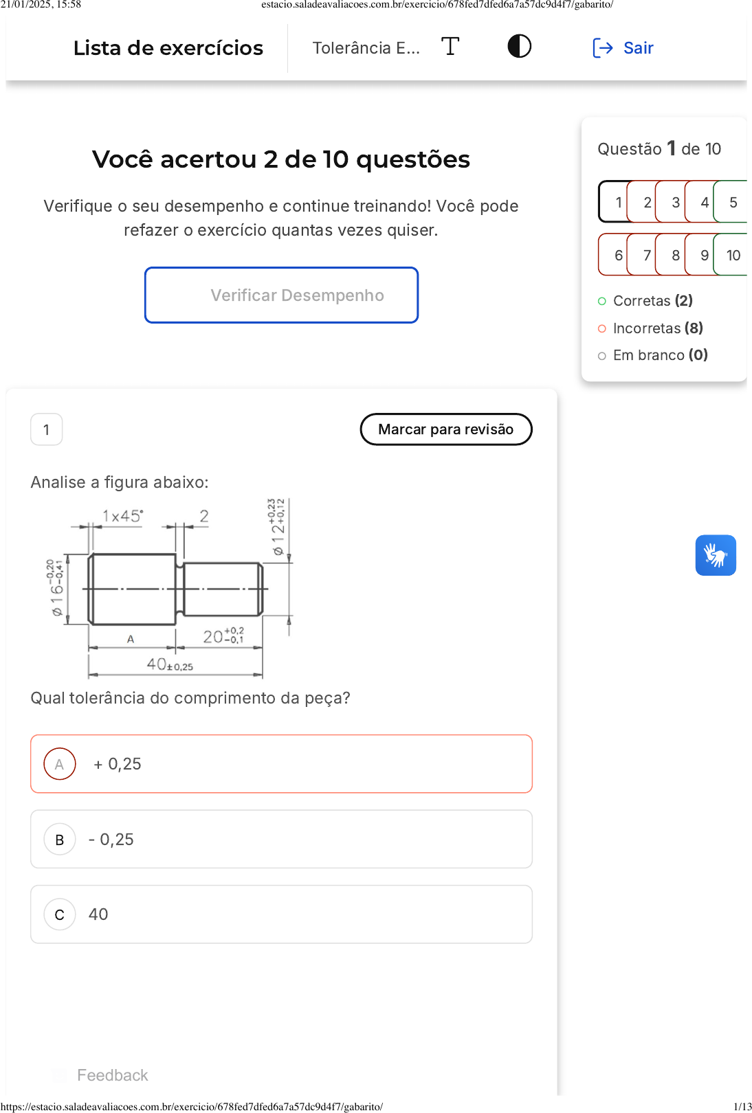 Você acertou 2 de 10 questões Verifique o seu desempenho e continue treinando! Você pode refazer o exercício quantas vezes quiser. Verificar Desempenho A B C 1 Marcar para revisão Analise a figura abaixo: Qual tolerância do comprimento da peça? + 0,25 - 0,25 40 Questão 1 de 10 Corretas �2� Incorretas �8� Em branco �0� 1 2 3 4 5 6 7 8 9 10 Lista de exercícios Tolerância E… Sair Feedback 21/01/2025, 15:58 estacio.saladeavaliacoes.com.br/exercicio/678fed7dfed6a7a57dc9d4f7/gabarito/ https://estacio.saladeavaliacoes.com.br/exercicio/678fed7dfed6a7a57dc9d4f7/gabarito/ 1/13 D E A B C 0,50 40,25 Resposta incorreta Opa! A alternativa correta é a letra D. Confira o gabarito comentado! Gabarito Comentado + 0,25 - ��0,25� = 0,50 2 Marcar para revisão Dados os valores, calcule as categorias de montagem dos elementos de um conjunto que são classificadas segundo a possibilidade de movimento relativo entre as peças que o constituem. Segundo aO IT máximo é 3. necessidade de funcionamento dos componentes haverá conjuntos furo/eixo que tenham liberdade de movimento, outros com se deslocam longitudinalmente de forma deslizante e outros fixos sob pressão para garantir a união das peças. a) Ajuste Móvel e móvel deslizante; b) Ajuste fixo e c) Ajuste incerto. o IT para um diâmetro com dn = 20 mm; as = �0,009 e ai = = 0,004? 6 5 11 21/01/2025, 15:58 estacio.saladeavaliacoes.com.br/exercicio/678fed7dfed6a7a57dc9d4f7/gabarito/ https://estacio.saladeavaliacoes.com.br/exercicio/678fed7dfed6a7a57dc9d4f7/gabarito/ 2/13 D E 8 12 Resposta incorreta Opa! A alternativa correta é a letra A. Confira o gabarito comentado! Gabarito Comentado De acordo com a tabela: 20 está entre 18 e 30, logo: Sendo assim, considerando a tabela de Relações de IT� O IT 6 tem tolerância de 10i. 3 Marcar para revisão O sistema ISO estabelece qualidades de trabalho, ou seja, graus de tolerância. Quantas qualidades de trabalho o sistema oferece? 21/01/2025, 15:58 estacio.saladeavaliacoes.com.br/exercicio/678fed7dfed6a7a57dc9d4f7/gabarito/ https://estacio.saladeavaliacoes.com.br/exercicio/678fed7dfed6a7a57dc9d4f7/gabarito/ 3/13 A B C D E 4. 9. 12. 18. 32. Resposta incorreta Opa! A alternativa correta é a letra D. Confira o gabarito comentado! Gabarito Comentado O sistema ISO, que é um padrão internacional para especificações e diretrizes, estabelece 18 qualidades de trabalho. Essas qualidades são graus de tolerância, que são designados como IT 01, IT 0, IT 1, e assim por diante, até IT 16. O "I" representa ISO e o "T" representa Tolerância. Esses graus de tolerância são usados para atender a diversas necessidades na construção de peças, garantindo que elas se encaixem e funcionem corretamente dentro de um sistema ou máquina. Portanto, a resposta correta é a alternativa D, que afirma que o sistema ISO estabelece 18 qualidades de trabalho. 4 Marcar para revisão Ao definir as Tolerâncias Dimensionais de uma peça, o objetivo é que ela tenha uma dimensão que possa ser montada. Enquanto que nas Tolerâncias Geométricas, o objetivo é ter as peças fabricadas com a geometria desejada e que possam ser 21/01/2025, 15:58 estacio.saladeavaliacoes.com.br/exercicio/678fed7dfed6a7a57dc9d4f7/gabarito/ https://estacio.saladeavaliacoes.com.br/exercicio/678fed7dfed6a7a57dc9d4f7/gabarito/ 4/13 A B C D E montadas na posição final necessária para o funcionamento do conjunto. O que é a condição de máximo material? Condição de um elemento de forma, para o qual algumas dimensões locais se encontram no limite onde o material do elemento é mínimo. Condição de um elemento de forma, para o qual algumas dimensões locais se encontram no limite onde o material do elemento é máximo. Condição de um elemento de forma, para o qual algumas dimensões locais se encontram fora do limite onde o material do elemento é mínimo. Condição de um elemento de forma, para o qual todas as dimensões locais se encontram no limite onde o material do elemento é mínimo. Condição de um elemento de forma, para o qual todas as dimensões locais se encontram no limite onde o material do elemento é máximo. Resposta incorreta Opa! A alternativa correta é a letra E. Confira o gabarito comentado! Gabarito Comentado A condição de máximo material é a situação em que todas as dimensões locais de um elemento de forma se encontram no limite onde o material do elemento é máximo. Isso significa que o elemento tem a maior quantidade de material possível dentro das tolerâncias definidas. Um exemplo prático seria o menor diâmetro de um furo ou o maior diâmetro de um eixo. Nesses casos, a condição de máximo material é alcançada quando o furo é o menor possível 21/01/2025, 15:58 estacio.saladeavaliacoes.com.br/exercicio/678fed7dfed6a7a57dc9d4f7/gabarito/ https://estacio.saladeavaliacoes.com.br/exercicio/678fed7dfed6a7a57dc9d4f7/gabarito/ 5/13 A B C D E (mais material) ou quando o eixo é o maior possível (mais material). 5 Marcar para revisão A tolerância de orientação e localização não deve ser aplicada ao próprio elemento, mas ao seu prolongamento. Tal campo, denominado campo de tolerância projetado, deve ser indicado pelo símbolo P. Quando a tolerância se aplica a vários elementos repetitivos, como indicá-la no quadro de tolerância? No rodapé do desenho Com uma seta indicativa Ao lado do quadro Dentro do quadro Sobre o quadro Resposta correta Parabéns, você selecionou a alternativa correta. Confira o gabarito comentado! Gabarito Comentado Quando a tolerância se aplica a vários elementos repetitivos, a indicação deve ser feita sobre o quadro de tolerância. Isso é geralmente realizado na forma de uma nota explicativa. O número de elementos aos quais a tolerância se aplica deve ser seguido por um sinal de multiplicação, ou pode-se optar por escrever diretamente a quantidade de elementos que devem ser tolerados. Portanto, a alternativa correta é a letra 21/01/2025, 