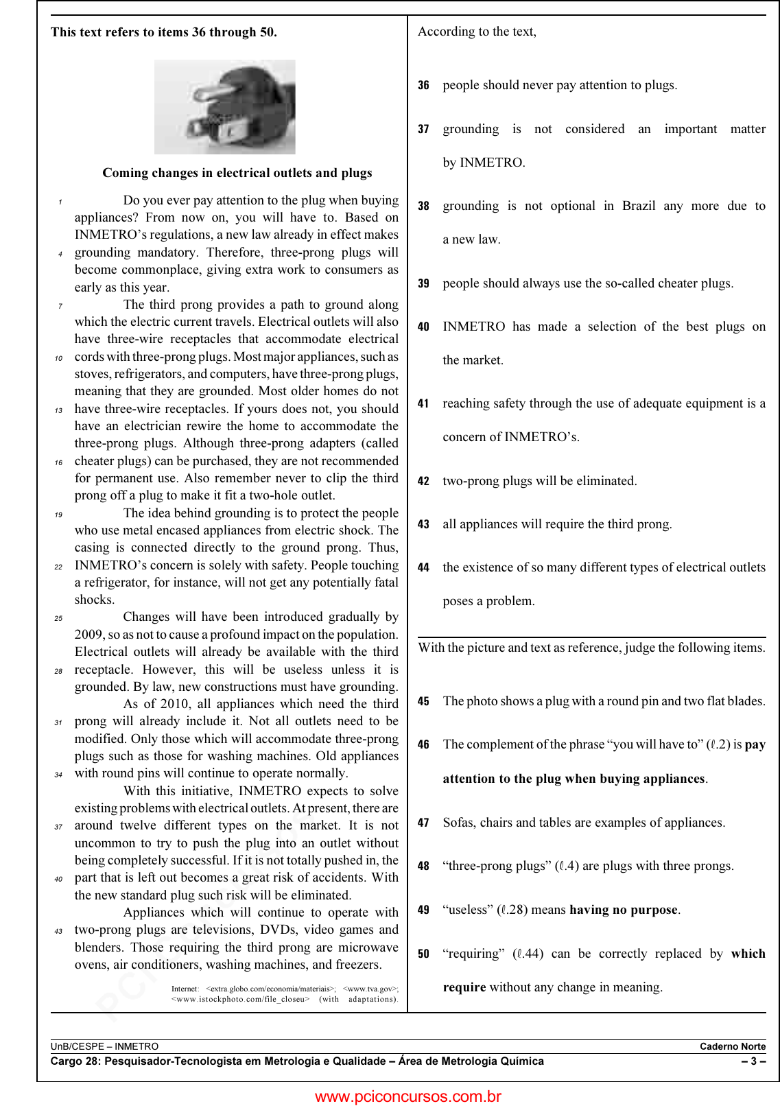 pcimarkpci MjgwNDowMTRjOjViYWU6ODBiMjphODllOmQ3ZTE6NDI5YTozMmI4:U2F0LCAyNSBKYW4gMjAyNSAxMToxNzozMCAtMDMwMA== www.pciconcursos.com.br UnB/CESPE – INMETRO Caderno Norte Cargo 28: Pesquisador-Tecnologista em Metrologia e Qualidade – Área de Metrologia Química – 3 – This text refers to items 36 through 50. Coming changes in electrical outlets and plugs Do you ever pay attention to the plug when buying1 appliances? From now on, you will have to. Based on INMETRO’s regulations, a new law already in effect makes grounding mandatory. Therefore, three-prong plugs will4 become commonplace, giving extra work to consumers as early as this year. The third prong provides a path to ground along7 which the electric current travels. Electrical outlets will also have three-wire receptacles that accommodate electrical cords with three-prong plugs. Most major appliances, such as10 stoves, refrigerators, and computers, have three-prong plugs, meaning that they are grounded. Most older homes do not have three-wire receptacles. If yours does not, you should13 have an electrician rewire the home to accommodate the three-prong plugs. Although three-prong adapters (called cheater plugs) can be purchased, they are not recommended16 for permanent use. Also remember never to clip the third prong off a plug to make it fit a two-hole outlet. The idea behind grounding is to protect the people19 who use metal encased appliances from electric shock. The casing is connected directly to the ground prong. Thus, INMETRO’s concern is solely with safety. People touching22 a refrigerator, for instance, will not get any potentially fatal shocks. Changes will have been introduced gradually by25 2009, so as not to cause a profound impact on the population. Electrical outlets will already be available with the third receptacle. However, this will be useless unless it is28 grounded. By law, new constructions must have grounding. As of 2010, all appliances which need the third prong will already include it. Not all outlets need to be31 modified. Only those which will accommodate three-prong plugs such as those for washing machines. Old appliances with round pins will continue to operate normally. 34 With this initiative, INMETRO expects to solve existing problems with electrical outlets. At present, there are around twelve different types on the market. It is not37 uncommon to try to push the plug into an outlet without being completely successful. If it is not totally pushed in, the part that is left out becomes a great risk of accidents. With40 the new standard plug such risk will be eliminated. Appliances which will continue to operate with two-prong plugs are televisions, DVDs, video games and43 blenders. Those requiring the third prong are microwave ovens, air conditioners, washing machines, and freezers. Internet: ; ; (with adaptations). According to the text, �� people should never pay attention to plugs. �� grounding is not considered an important matter by INMETRO. � grounding is not optional in Brazil any more due to a new law. � people should always use the so-called cheater plugs. �� INMETRO has made a selection of the best plugs on the market. �� reaching safety through the use of adequate equipment is a concern of INMETRO’s. �� two-prong plugs will be eliminated. �� all appliances will require the third prong. �� the existence of so many different types of electrical outlets poses a problem. With the picture and text as reference, judge the following items. �� The photo shows a plug with a round pin and two flat blades. �� The complement of the phrase “you will have to” (R.2) is pay attention to the plug when buying appliances. �� Sofas, chairs and tables are examples of appliances. � “three-prong plugs” (R.4) are plugs with three prongs. � “useless” (R.28) means having no purpose. �� “requiring” (R.44) can be correctly replaced by which require without any change in meaning. www.pciconcursos.com.br pcimarkpci MjgwNDowMTRjOjViYWU6ODBiMjphODllOmQ3ZTE6NDI5YTozMmI4:U2F0LCAyNSBKYW4gMjAyNSAxMToxNzozMCAtMDMwMA== www.pciconcursos.com.br UnB/CESPE – INMETRO Caderno Norte Cargo 28: Pesquisador-Tecnologista em Metrologia e Qualidade – Área de Metrologia Química – 4 – CONHECIMENTOS ESPECÍFICOS A oxidação completa da glicose, que forma dióxido de carbono e água, apresenta )Gº = !2.880 kJ/mol. Essa reação, no corpo humano, requer vários catalisadores enzimáticos. Com relação a esse assunto, julgue os itens que seguem. �� Na reação mencionada, os reagentes acessam um número de configurações espaciais maior que os produtos. �� O valor de )Gº implica a ocorrência de uma reação instantânea. �� Na presença de enzimas, a reação ocorre com energia de ativação zero. �� Na oxidação completa da glicose com catálise enzimática, um aumento da temperatura desse sistema reacional pode ocasionar a desnaturação de enzimas e, conseqüentemente, a diminuição da velocidade da reação. �� A presença de catalisadores altera a variação de energia livre da reação em apreço. �� Um modelo de mecanismo para uma reação catalisada por enzima pode ser corretamente representado pela equação E + S º ES ÷ E + P, em que E representa a enzima, S, o substrato, ES, o complexo enzima-substrato e P, o produto. D – glicose H C OH HO C C C H H C C OH H C OH CH OH2 H O C D – frutose C O HO C C C H H C C OH H C OH CH OH2 CH OH2 L – glicose HO C H H C C C OH HO C C H HO C H CH OH2 H O C A D-glicose, cuja estrutura é mostrada acima, desempenha papel de extrema importância no metabolismo animal e constitui a base da indústria da fermentação alcoólica. Já a L-glicose, também mostrada acima, não participa do metabolismo animal e não é fermentada por leveduras. Acerca dessas moléculas, bem como da D-frutose, cuja estrutura também é ilustrada acima, julgue os itens a seguir. �� O processo de fe