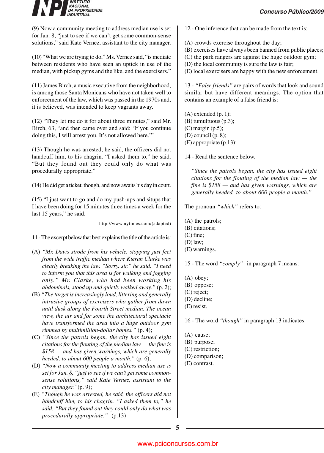 pcimarkpci MjgwNDowMTRjOjViYWU6ODBiMjphODllOmQ3ZTE6NDI5YTozMmI4:U2F0LCAyNSBKYW4gMjAyNSAxMToxMDoyMyAtMDMwMA== www.pciconcursos.com.br 5 Concurso Público/2009 (9) Now a community meeting to address median use is set for Jan. 8, “just to see if we can’t get some common-sense solutions,” said Kate Vernez, assistant to the city manager. (10) “What we are trying to do,” Ms. Vernez said, “is mediate between residents who have seen an uptick in use of the median, with pickup gyms and the like, and the exercisers.” (11) James Birch, a music executive from the neighborhood, is among those Santa Monicans who have not taken well to enforcement of the law, which was passed in the 1970s and, it is believed, was intended to keep vagrants away. (12) “They let me do it for about three minutes,” said Mr. Birch, 63, “and then came over and said: ‘If you continue doing this, I will arrest you. It’s not allowed here.’” (13) Though he was arrested, he said, the officers did not handcuff him, to his chagrin. “I asked them to,” he said. “But they found out they could only do what was procedurally appropriate.” (14) He did get a ticket, though, and now awaits his day in court. (15) “I just want to go and do my push-ups and situps that I have been doing for 15 minutes three times a week for the last 15 years,” he said. http://www.nytimes.com/(adapted) 11 - The excerpt below that best explains the title of the article is: (A) “Mr. Davis strode from his vehicle, stopping just feet from the wide traffic median where Kieran Clarke was clearly breaking the law. “Sorry, sir,” he said, “I need to inform you that this area is for walking and jogging only.” Mr. Clarke, who had been working his abdominals, stood up and quietly walked away.” (p. 2); (B) “The target is increasingly loud, littering and generally intrusive groups of exercisers who gather from dawn until dusk along the Fourth Street median. The ocean view, the air and for some the architectural spectacle have transformed the area into a huge outdoor gym rimmed by multimillion-dollar homes.” (p. 4); (C) “Since the patrols began, the city has issued eight citations for the flouting of the median law — the fine is $158 — and has given warnings, which are generally heeded, to about 600 people a month.” (p. 6); (D) “Now a community meeting to address median use is set for Jan. 8, “just to see if we can’t get some common- sense solutions,” said Kate Vernez, assistant to the city manager.´ (p. 9); (E) “Though he was arrested, he said, the officers did not handcuff him, to his chagrin. “I asked them to,” he said. “But they found out they could only do what was procedurally appropriate.” (p.13) 12 - One inference that can be made from the text is: (A) crowds exercise throughout the day; (B) exercises have always been banned from public places; (C) the park rangers are against the huge outdoor gym; (D) the local community is sure the law is fair; (E) local exercisers are happy with the new enforcement. 13 - “False friends” are pairs of words that look and sound similar but have different meanings. The option that contains an example of a false friend is: (A) extended (p. 1); (B) tumultuous (p.3); (C) margin (p.5); (D) council (p. 8); (E) appropriate (p.13); 14 - Read the sentence below. “Since the patrols began, the city has issued eight citations for the flouting of the median law — the fine is $158 — and has given warnings, which are generally heeded, to about 600 people a month.” The pronoun “which” refers to: (A) the patrols; (B) citations; (C) fine; (D) law; (E) warnings. 15 - The word “comply” in paragraph 7 means: (A) obey; (B) oppose; (C) reject; (D) decline; (E) resist. 16 - The word “though” in paragraph 13 indicates: (A) cause; (B) purpose; (C) restriction; (D) comparison; (E) contrast. www.pciconcursos.com.br pcimarkpci MjgwNDowMTRjOjViYWU6ODBiMjphODllOmQ3ZTE6NDI5YTozMmI4:U2F0LCAyNSBKYW4gMjAyNSAxMToxMDoyMyAtMDMwMA== www.pciconcursos.com.br Concurso Público/2009 6 TEXT TWO The paragraph below was taken from the “Perspectives” section of Newsweek. Read it and answer the questions that follow. “I am beginning to get fed up with the amount of nonsensical rubbish I take all day and every day. If one more (New Zealand) child asks me what it’s like to be a prince, I shall go demented… Will you visit me when they strap me in a white apron and deposit me in some institution”? England’s Prince Charles, in a letter to friends during a 1981 tour to the southern hemisphere. The letter was part of a collection of Charles’ private writings released by The Guardian last week in honour of his 60th birthday. 17 - In the text above, the phrasal verb “to get fed up with” means: (A) nourished; (B) exhausted; (C) experienced; (D) distracted; (E) annoyed. 18 - The word “nonsensical” in “I am beginning to get fed up with the amount of nonsensical rubbish I take all day and every day” means: (A) silly; (B) untrue; (C) impossible; (D) uninteresting; (E) insensitive. 19 - The word “if” in “If one more (New Zealand) child asks me what it’s like to be a prince, I shall go demented …” , introduces an idea of: (A) time; (B) concession; (C) condition; (D) result; (E) determination. 20 - After reading Prince Charles’ words, one can infer that: (A) the Prince is considered to be a lunatic by a child; (B) the Prince is sick and tired of the questions he’s been asked; (C) the Prince is surely going demented and knows that; (D) the Prince doesn’t want to be a prince anymore; (E) the Prince wants his friend to go on a tour to the southern hemisphere. CONHECIMENTOS ESPECÍFICOS 21- Alem de regular os direitos e obrigações relativos à propriedade industrial das pessoas físicas e jurídicas nacionais, a Lei 9.279 se aplica nos seguintes casos: (A) apenas aos nacionais dos países com os quais o Brasil mantenha um acordo bilateral específico n