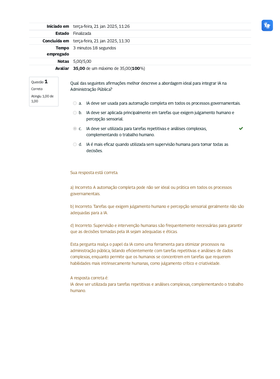Questão 1 Correto Atingiu 1,00 de 1,00 Iniciado em terça-feira, 21 jan. 2025, 11:26 Estado Finalizada Concluída em terça-feira, 21 jan. 2025, 11:30 Tempo empregado 3 minutos 18 segundos Notas 5,00/5,00 Avaliar 35,00 de um máximo de 35,00(100%) Qual das seguintes a�rmações melhor descreve a abordagem ideal para integrar IA na Administração Pública? a. IA deve ser usada para automação completa em todos os processos governamentais. b. IA deve ser aplicada principalmente em tarefas que exigem julgamento humano e percepção sensorial. c. IA deve ser utilizada para tarefas repetitivas e análises complexas, complementando o trabalho humano. d. IA é mais e�caz quando utilizada sem supervisão humana para tomar todas as decisões. Sua resposta está correta. a) Incorreto. A automação completa pode não ser ideal ou prática em todos os processos governamentais. b) Incorreto. Tarefas que exigem julgamento humano e percepção sensorial geralmente não são adequadas para a IA. d) Incorreto. Supervisão e intervenção humanas são frequentemente necessárias para garantir que as decisões tomadas pela IA sejam adequadas e éticas. Esta pergunta realça o papel da IA como uma ferramenta para otimizar processos na administração pública, lidando e�cientemente com tarefas repetitivas e análises de dados complexas, enquanto permite que os humanos se concentrem em tarefas que requerem habilidades mais intrinsecamente humanas, como julgamento crítico e criatividade. A resposta correta é: IA deve ser utilizada para tarefas repetitivas e análises complexas, complementando o trabalho humano. Questão 2 Correto Atingiu 1,00 de 1,00 Qual é o objetivo da aplicação de IA na análise de reclamações de clientes de operadoras de saúde, conforme visto na primeira rodada de Desa�os de IA? a. Substituir completamente o atendimento humano nas operadoras de saúde. b. Facilitar a comunicação direta entre pacientes e médicos. c. Classi�car e analisar reclamações para tomada de decisões rápidas e e�cientes. d. Prever tendências futuras em reclamações de saúde para publicidade direcionada. Sua resposta está correta. a) Incorreto. O objetivo não é substituir completamente o atendimento humano, mas auxiliar na classi�cação e análise de reclamações. b) Incorreto. O foco não está na comunicação direta entre pacientes e médicos. d) Incorreto. A previsão de tendências futuras para publicidade não é o foco principal deste desa�o. Esta questão destaca a importância da IA na melhoria da e�ciência administrativa em operadoras de saúde, demonstrando como ela pode auxiliar na análise e classi�cação de reclamações de clientes, contribuindo para uma tomada de decisão mais rápida e informada. A resposta correta é: Classi�car e analisar reclamações para tomada de decisões rápidas e e�cientes. Questão 3 Correto Atingiu 1,00 de 1,00 Qual é a �nalidade de uma solução de IA no desa�o de monitoramento de conformidade de empresas? a. Automatizar completamente todas as operações da empresa. b. Identi�car riscos sanitários usando modelos preditivos baseados em análise de dados. c. Substituir a necessidade de �scalização humana nas empresas. d. Coletar dados �nanceiros das empresas para análises econômicas. Sua resposta está correta. a) Incorreto. A IA não visa automatizar todas as operações da empresa, mas foca em aspectos especí�cos de conformidade. c) Incorreto. A IA complementa a �scalização humana, não a substitui completamente. d) Incorreto. O foco está em riscos sanitários, não na coleta de dados �nanceiros para análises econômicas. Esta pergunta ressalta a utilização da IA para melhorar a e�ciência no monitoramento da conformidade das empresas, especi�camente na identi�cação de riscos sanitários. Ela destaca o papel da IA em fornecer análises preditivas, complementando, e não substituindo, a �scalização humana, demonstrando assim a capacidade da IA de lidar com grandes volumes de dados para antecipar e prevenir problemas. A resposta correta é: Identi�car riscos sanitários usando modelos preditivos baseados em análise de dados. Questão 4 Correto Atingiu 1,00 de 1,00 Qual das seguintes ações é crucial para garantir a equidade e justiça na implementação de sistemas de Inteligência Arti�cial na Administração Pública? a. Maximizar a velocidade de processamento da IA. b. Garantir a diversidade e representatividade nos conjuntos de dados. c. Focar exclusivamente na automatização de processos administrativos. d. Limitar a transparência dos algoritmos para proteger a propriedade intelectual. Sua resposta está correta. a) Incorreta. Maximizar a velocidade de processamento da IA não aborda diretamente questões de equidade e justiça. c) Incorreta. Focar exclusivamente na automatização não assegura a justiça e equidade nos resultados do sistema de IA. d) Incorreta. Limitar a transparência é contrário aos princípios de ética e responsabilidade na implementação de IA na Administração Pública. Esta questão visa ressaltar a importância de assegurar que os conjuntos de dados utilizados em sistemas de IA sejam diversos e representativos. Isso é fundamental para prevenir a perpetuação de vieses e garantir decisões justas e equitativas. A resposta correta é: Garantir a diversidade e representatividade nos conjuntos de dados. Questão 5 Correto Atingiu 1,00 de 1,00 Em relação à ética e privacidade na implementação de sistemas de IA na Administração Pública, qual das seguintes práticas é recomendada? a. Utilizar dados não anonimizados para aumentar a precisão do sistema. b. Priorizar a maximização de lucro no design dos sistemas de IA. c. Garantir políticas de privacidade transparentes e acessíveis. d. Evitar a transparência sobre como os dados são coletados e usados. Sua resposta está correta. a) Incorreta. A utilização de dados não anoni