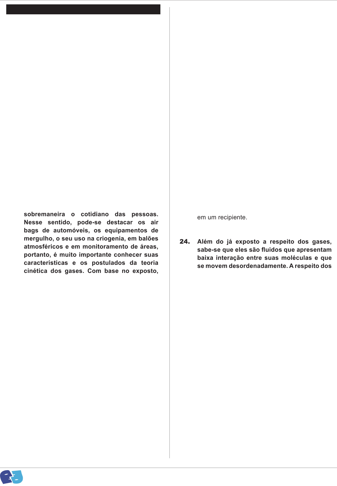10 Química C O N H E C I M E N T O S E S P E C Í F I C O S 21. As pilhas de níquel-cádmio são baterias recarregáveis muito utilizadas em aparelhos como calculadoras, celulares, câmeras de vídeo, brinquedos, entre outros. Considerando que as semireações, que possivelmente ocorrem nesses tipos de pilhas, estão representadas a seguir, assinale a alternativa correta. Cd(s) + 2OH- (aq) → Cd(OH)2(s) + 2e- 2Ni(OH)3(s) + 2e- → 2Ni(OH)2(s) + 2OH- (aq) (A) O polo negativo da pilha é o níquel. (B) ∆G do processo é positivo. (C) O cátodo da pilha é o cádmio. (D) O cádmio atua como agente redutor. (E) O fluxo de elétrons se dá do eletrodo de Ni(OH)3 para o eletrodo de cádmio. As propriedades dos gases influenciam sobremaneira o cotidiano das pessoas. Nesse sentido, pode-se destacar os air bags de automóveis, os equipamentos de mergulho, o seu uso na criogenia, em balões atmosféricos e em monitoramento de áreas, portanto, é muito importante conhecer suas características e os postulados da teoria cinética dos gases. Com base no exposto, responda às questões 22, 23 e 24. 22. Com relação à teoria cinética dos gases, às leis que tentam descrever o comportamento dos gases e que fornecem a base para a compreensão do seu comportamento, assinale a alternativa correta. (A) Levando em consideração a Lei Geral dos Gases, o volume de uma determinada quantidade de gás é diretamente proporcional à sua pressão a uma temperatura constante. (B) De acordo com Robert Boyle, o volume de uma quantidade fixa de gás, a uma dada temperatura, é inversamente proporcional à pressão exercida pelo gás. (C) De acordo com a hipótese de Avogadro, o volume de um gás a uma determinada temperatura e pressão é inversamente proporcional à quantidade (em mol) de gás. (D) De acordo com a lei de Charles, o volume de uma quantidade fixa de gás, à pressão constante, aumenta com a diminuição da temperatura. (E) De acordo com a lei de Boyle, para proporcionar um aumento na pressão de uma determinada amostra gasosa em uma transformação isotérmica, é necessário aumentar seu volume. 23. Ainda em relação ao comportamento dos gases e às leis que tentam explicá-lo, assinale a alternativa correta. (A) A velocidade de efusão do CO2 e do N2 será a mesma nas mesmas condições de temperatura e pressão e serão diferentes com a variação da temperatura. (B) Os gases reais têm propriedades diferentes das preditas pela lei dos gases ideais. Essas diferenças são importantes em pressões elevadas e temperaturas baixas. (C) A energia cinética média das partículas de um gás é inversamente proporcional à temperatura do gás. (D) A energia cinética média das partículas de um gás não é influenciada pelas massas desses gases. (E) A difusão de um gás é caracterizada pela facilidade ou dificuldade que as partículas desse gás têm para atravessar uma minúscula abertura em um recipiente. 24. Além do já exposto a respeito dos gases, sabe-se que eles são fluidos que apresentam baixa interação entre suas moléculas e que se movem desordenadamente. A respeito dos gases e do estudo de seu comportamento, assinale a alternativa correta. (A) De acordo com a lei de Graham, a taxa de efusão de um gás é diretamente proporcional à raiz quadrada de sua massa molar. (B) Em uma mistura gasosa, a pressão parcial de um gás é igual ao resultado de sua fração em mol na mistura pela própria temperatura. (C) A pressão parcial de um gás em uma mistura é o produto de sua fração molar pela pressão total da mistura. (D) Quando em uma mistura gasosa há um aumento no número de moléculas de determinado gás, mantendo-se a temperatura e o volume constantes, o número de colisões ocorridas por minuto diminui, pois há mais dificuldade de locomoção das partículas. (E) As curvas de Maxwell-Boltzmann são utilizadas para mostrar a relação existente entre o número de moléculas de um gás e a pressão. www.pciconcursos.com.br 11 Química 25. A lei de velocidade para a reação de decomposição do ozônio estratosférico é: velocidade = k [O3] 2[O2] -1. Sobre essa lei de velocidade, assinale a alternativa correta. (A) Ao dobrar a concentração de ozônio, a velocidade de decomposição dobra. (B) Se a concentração de oxigênio triplicar, a velocidade de decomposição será três vezes maior. (C) A reação de decomposição do ozônio é mais lenta em regiões em que as moléculas de gás oxigênio é mais abundante. (D) A ordem total da reação é igual a 2. (E) A reação sofre aceleração quando a concentração de ozônio diminui. 26. Em relação às interações atrativas do tipo forças de London, assinale a alternativa correta. (A) À medida que o número de elétrons em uma molécula aumenta, as interações de London tornam-se mais fortes e, consequentemente, os pontos de ebulição tendem a aumentar. (B) Somente as moléculas apolares possuem forças de London. (C) A energia das interações de London diminui com a polarizabilidade das moléculas que interagem. (D) As interações de London entre moléculas de geometria esferoide são mais efetivas do que entre moléculas de geometria cilindroide contendo o mesmo número de elétrons. (E) A energia potencial das interações de London aumentam rapidamente com a distância entre as moléculas. 27. Tendo em vista que a Termodinâmica estuda as transferências de energia entre um dado sistema e sua vizinhança, as conversões entre os diferentes tipos de energia e as relações entre as propriedades dos sistemas em equilíbrio, assinale a alternativa correta. (A) Sendo a combustão total do etanol representada pela equação química balanceada: C2H5OH(l) + 3O2(g) → 2CO2(g) + 3H2O(l) onde ΔH= -327 kcal/mol, a quantidade de calor liberada na queima de 141g de álcool etílico é aproximadamente – 520 kcal. (DADOS: C = 12; O = 16; H = 1). (B) Ao se preparar uma solução aquosa de H2SO4 adicionando-o à ág