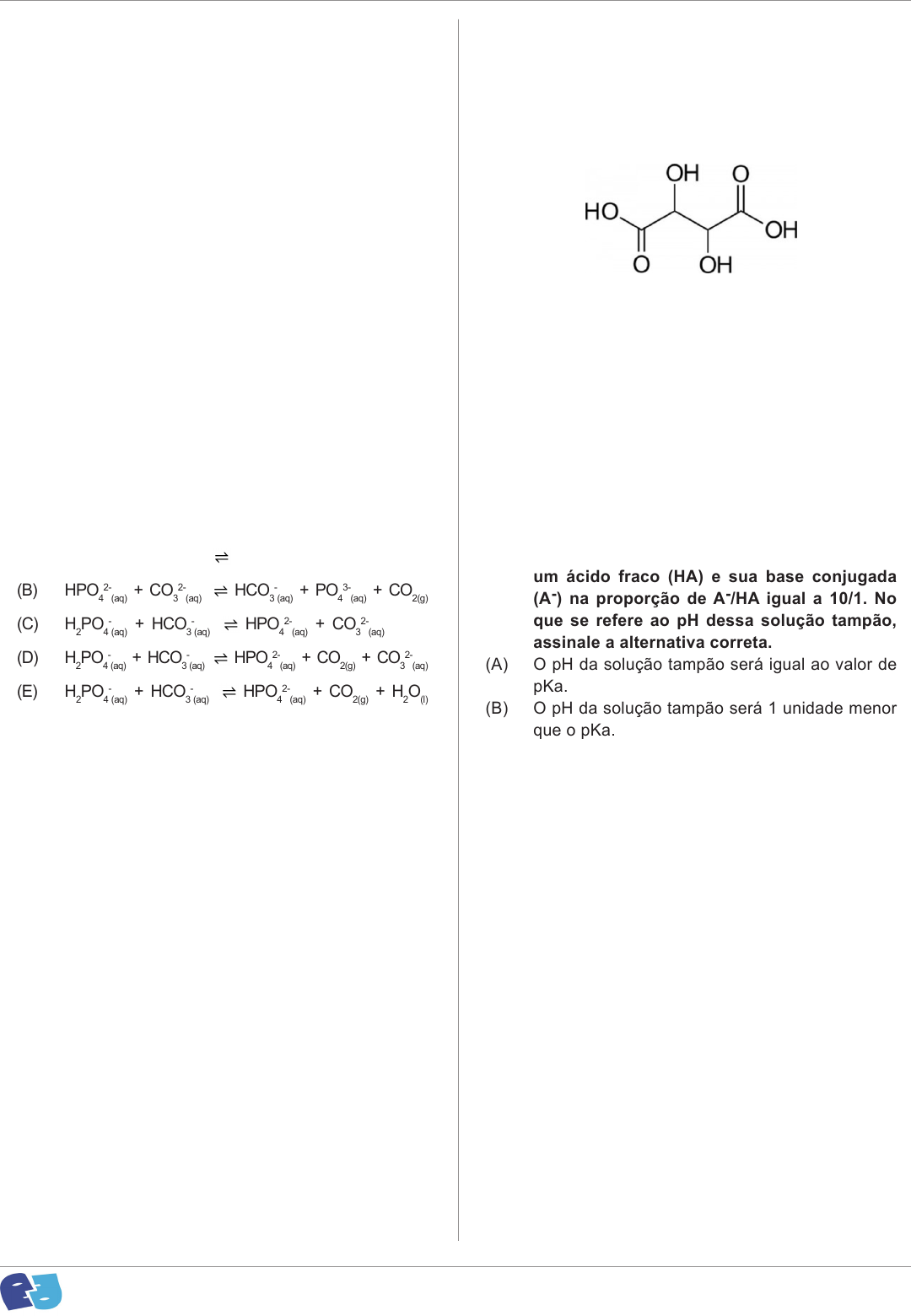 14 Química 39. De acordo com as teorias de ligação covalente, assinale a alternativa que apresenta, para o composto trifluoreto de cloro, a forma molecular, o arranjo de elétrons e a hibridação do cloro, respectivamente. Dados: Cl (Z = 17); F(Z = 9). (A) Pirâmide trigonal, tetraédrica, sp3. (B) Bipirâmide trigonal, forma de T, sp3d. (C) Forma de T, bipirâmide trigonal, sp3d. (D) Balanço, bipirâmide trigonal, sp3d. (E) Bipirâmide trigonal, balanço, sp3d. 40. A produção de CO2 proveniente do processo de fermentação é responsável pelo crescimento das massas de pães e bolos, porém é um processo lento. Para que a produção de CO2 seja mais rápida, os padeiros utilizam a reação entre bicarbonato de sódio e dihidrogenofosfato de sódio, que constituem o fermento químico. Diante do exposto, assinale a alternativa que representa corretamente a reação que ocorre no processo. (A) HPO4 2- (aq) + HCO3 - (aq) H2PO4 - (aq) + CO2(g) + H3O + (aq) (B) HPO4 2- (aq) + CO3 2- (aq) HCO3 - (aq) + PO4 3- (aq) + CO2(g) (C) H2PO4 - (aq) + HCO3 - (aq) HPO4 2- (aq) + CO3 2- (aq) (D) H2PO4 - (aq) + HCO3 - (aq) HPO4 2- (aq) + CO2(g) + CO3 2- (aq) (E) H2PO4 - (aq) + HCO3 - (aq) HPO4 2- (aq) + CO2(g) + H2O(l) 41. Sobre a teoria de ligação de valência (TLV), assinale a alternativa correta. (A) A superposição lateral de orbitais p produz uma ligação sigma (σ). (B) A superposição de orbitais permite que dois elétrons de spins contrários compartilhem um espaço comum entre os núcleos, formando uma ligação covalente. (C) Um arranjo linear de domínio de elétrons implica uma hibridação do tipo sp2. (D) Um orbital s e dois orbitais p hibridizam para formar três orbitais híbridos sp3 equivalentes. (E) Uma ligação pi (π) é simetricamente cilíndrica e não tem um plano nodal contendo o eixo internuclear. 42. O ácido tartárico é encontrado na uva e no mosto e constitui o principal ácido presente no vinho, além de possuir atividade antioxidante. A estrutura desse ácido está representada a seguir. Sobre o ácido tartárico, assinale a alternativa correta. (A) Apresenta quatro isômeros opticamente ativos. (B) Apresenta dois isômeros opticamente ativos e dois inativos. (C) Apresenta um isômero opticamente inativo por compensação interna. (D) Pode desviar a luz polarizada em três ângulos diferentes. (E) Apresenta uma mistura racêmica e dois isômeros mesógiros. 43. Uma solução tampão contém a mistura de um ácido fraco (HA) e sua base conjugada (A-) na proporção de A-/HA igual a 10/1. No que se refere ao pH dessa solução tampão, assinale a alternativa correta. (A) O pH da solução tampão será igual ao valor de pKa. (B) O pH da solução tampão será 1 unidade menor que o pKa. (C) O pH da solução tampão será 10 vezes maior que o Ka. (D) O pH da solução tampão será 1 unidade maior que o pKa. (E) O pH da solução tampão será 1 unidade maior que o Ka. 44. De acordo com a Teoria do Orbital Molecular (TOM), assinale a alternativa que apresenta a ordem de ligação e o comportamento magnético para o íon peróxido, respectivamente. Dados: O (Z = 8). (A) 1, diamagnético. (B) 2, paramagnético. (C) 3/2, paramagnético. (D) 5/2, paramagnético. (E) 2, diamagnético. www.pciconcursos.com.br 15 Química 45. Deseja-se preparar uma solução tampão de fosfato (H2PO4 - / HPO4 2-) em pH 7,00. Sabendo que o pKa do H2PO4 - é 7,21, assinale a alternativa que apresenta o valor da razão entre [HPO4 2-]/ [H2PO4 -]. (A) 10+0,21 (B) 10-7,00 (C) 10-0,21 (D) 10+7,00 (E) 10+7,21 46. Utilizando como referência o conceito de entalpia no estado padrão, pode-se calcular o valor da variação de entalpia de reações químicas. Nessa perspectiva, aparecem a seguir algumas equações químicas. Analise- as e a seguir assinale a alternativa que corresponde à associação correta entre a equação e o tipo de variação de entalpia envolvida (a 25ºC e 1 atm). 6C(g) + 3H2(g) → C6H6(l) C2H4(g) + 3O2(g) → 2CO2(g) + 2H2O(l) CH4(g) → 4H(g) + C(g) HCl(aq) + NaOH(aq) → NaCl(aq) + H2O(l) H2SO4(l) → H2(g) + 2O2(g) + S(romb) (A) Entalpia de formação, entalpia de combustão; entalpia de ligação, entalpia de neutralização, entalpia de decomposição. (B) Entalpia de dissociação, entalpia de combustão, entalpia de ligação, entalpia de formação, entalpia de decomposição. (C) Entalpia de combustão, entalpia de formação, entalpia de decomposição, entalpia de decomposição, entalpia de dissociação. (D) Entalpia de formação, entalpia de combustão, entalpia de neutralização, entalpia de formação, entalpia de formação. (E) Entalpia de ligação, entalpia de combustão, entalpia de ligação, entalpia de neutralização, entalpia de combustão. 47. Em relação aos fenômenos termoquímicos, assinale a única alternativa INCORRETA. (A) A entalpia de substâncias no estado gasoso é maior que no estado líquido, que, por sua vez, é maior que no estado sólido. (B) A variação da entalpia é muito sensível à temperatura em que ocorreu a reação, devido à intensidade de agitação das partículas. (C) A forma alotrópica mais estável de um elemento é sempre a de menor variação de entalpia. (D) A quantidade de reagentes e produtos que participam de uma reação é proporcional à quantidade de calor envolvida nessa reação. (E) A quebra das ligações dos reagentes é sempre um processo exotérmico. 48. Em relação às propriedades coligativas, assinale a alternativa correta. (A) Uma solução 0,01 mol/L de Ca(NO3)2 apresenta maior ponto de ebulição que uma solução 0,01 mol/L de NaNO3. (B) Duas soluções são consideradas isotônicas quando apresentam a mesma concentração iônica. (C) Ao nível do mar, a água ferve a uma temperatura menos elevada que a uma altura de 1000m. (D) A adição de uma certa quantidade de um soluto molecular não volátil à água provocará um aumento da pressão de vapor. (E) Tendo-se duas soluções, 