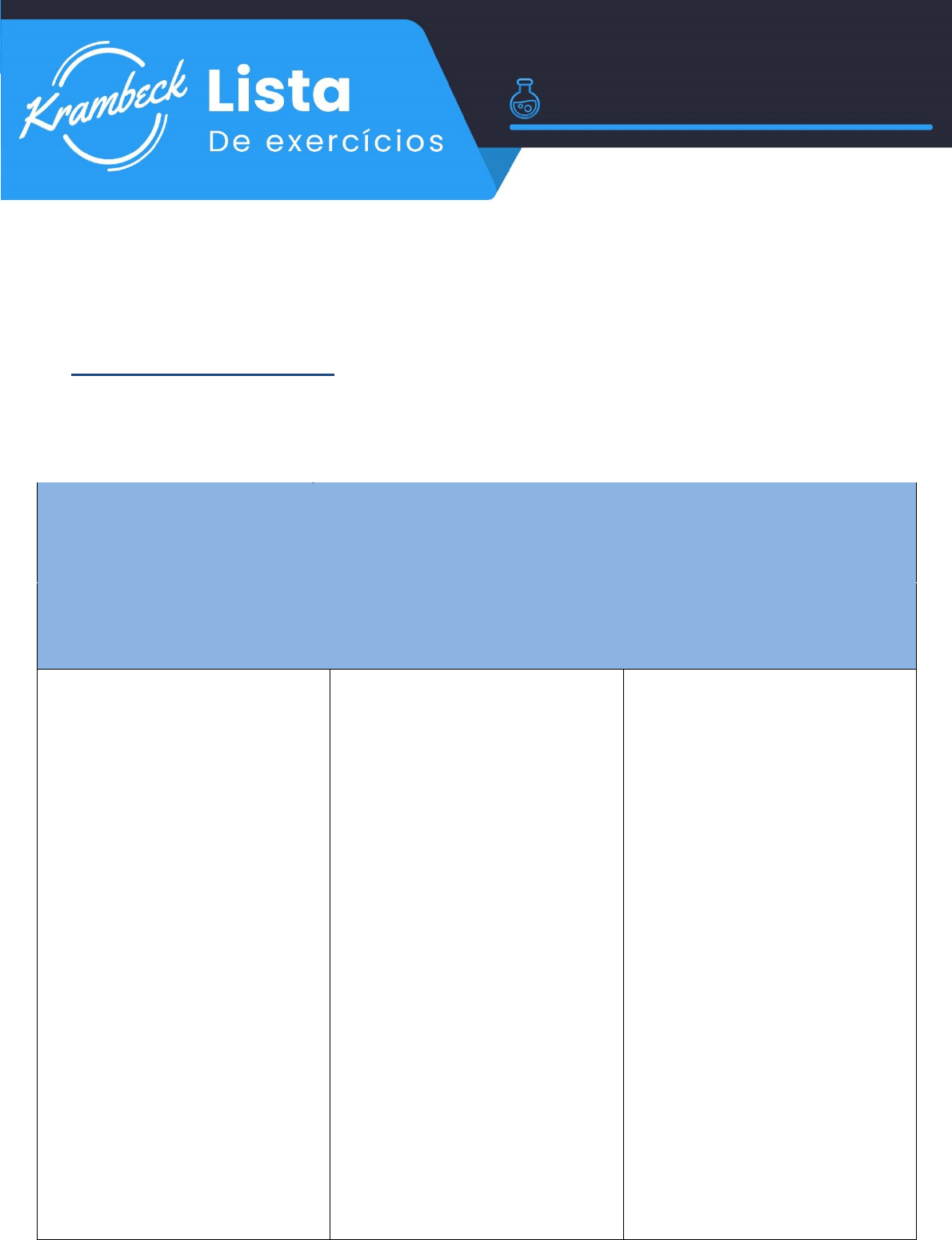RESUMO + EXERCÍCIOS 1. Regras de nomenclatura A IUPAC (International Union of Pure and Applied Chemistry) considera como a nomencatura oficial dos compostos orgânicos a seguinte estrutura: PREFIXO + INFIXO + SUFIXO Número de Átomos de Carbono Tipo de Ligação entre Função Orgânica Carbonos 1 = MET 2 = ET AN SÓ LIGAÇÕES SIMPLES O HIDROCARBONETO 3 = PROP 4 = BUT EN UMA LIGAÇÃO DUPLA OL ÁLCOOL 5 = PENT 6 = HEX IN UMA LIGAÇÃO TRIPLA AL ALDEÍDO 7 = HEPT 8 = OCT DIEN DUAS LIGAÇÕES DUPLAS ONA CETONA 9 = NON 10 = DEC TRIEN TRÊS LIGAÇÕES DUPLAS ÓICO ÁCIDO CARBOXÍLICO 11 = UNDEC 12 = DODEC DIIN DUAS LIGAÇÕES TRIPLAS AMIDA AMIDA Nomenclatura dos compostos Orgânicos 2. Numeração das cadeias A cadeia principal para cadeias carbônicas abertas é aquela com maior número de átomos de carbonos que contenham: ▪ grupo funcional (procure átomos que não sejam carbono e hidrogênio); ▪ maior número de insaturações (ligações duplas ou triplas entre carbonos); ▪ maior número de grupos radicais substituintes. Começar a numerar a cadeia com os menores números possíveis a partir da extremidade de acordo com a preferência: Quando houver só uma possibilidade, a numeração não precisa ser indicada. 3. Ramificações Hidrocarbonetos ramificados apresentam pelo menos um carbono terciário ou quaternário. Não existem ramificações em carbonos secundários e primários. Função Insaturação Ramificação 3.a. Principais ramificações metil etil vinil sec-butil n-pentil fenil benzil 4. Regra de nomenclatura para compostos orgânicos ramificados RADICAL + PREFIXO + INFIXO + SUFIXO n-propil isopropil n-butil terc-butil isobutil Observação: radicais diferentes devem ser colocados em ordem alfabética FAAAALAAAA GALERINHAAAAA!! Essa atividade apresenta um vídeo de Correção dos Exercícios que está na PASTA DO DRIVE. Espero que a correção possa ajudá-los. Correção dos exercícios em relação ao tempo do vídeo: Resumão 0:00 às 5:20 Questão 1 – 5:20 min Questão 2 – 20:50 min Questão 3 – 31:00 min Questão 4 – 35:20 min Questão 5 - 37:40 min Questão 6 - 48:40 min ATIVIDADE - NOMENCLATURA DE COMPOSTOS ORGÂNICOS 1. Os nomes corretos dos compostos orgânicos: 1. Dê os nomes nos compostos: 2. O composto orgânico representado a seguir é denominado: a) 3-etil-2,4-dimetilbutano. b) 2-etil-1,3-dimetilbutano. c) 3-isopropilpentano. d) 3-etil-4-metilpentano. e) 3-etil-2-metilpentano. 3. O nome correto do composto orgânico de fórmula a) 3-isopropil-2-metilpentano. b) 2-isopropil-2,4-dimetilbutano. c) 2,3,3-trimetilexano. d) 2,2,4-trimetilpentano. e) 3,3-dimetil-5-metilpentano. 4. Dê o nome segundo as recomendações da IUPAC para os hidrocarbonetos apresentados abaixo. 5. Dê o nome segundo as recomendações da IUPAC para os hidrocarbonetos de cadeia ramificada apresentados abaixo. GABARITO 01- I) 3-metil hexano ; II) 2,4,5 trimetil hex-1-eno ; III) 4-metil hex-2-ino ; 02- I) 2,2,4-trimetil-pentano (isoctano) ; II) 2-isopropil3,4-dimetil hex-1-eno ; III) 1-etil-3-metil-benzeno 03- E 04- C 05- 6-