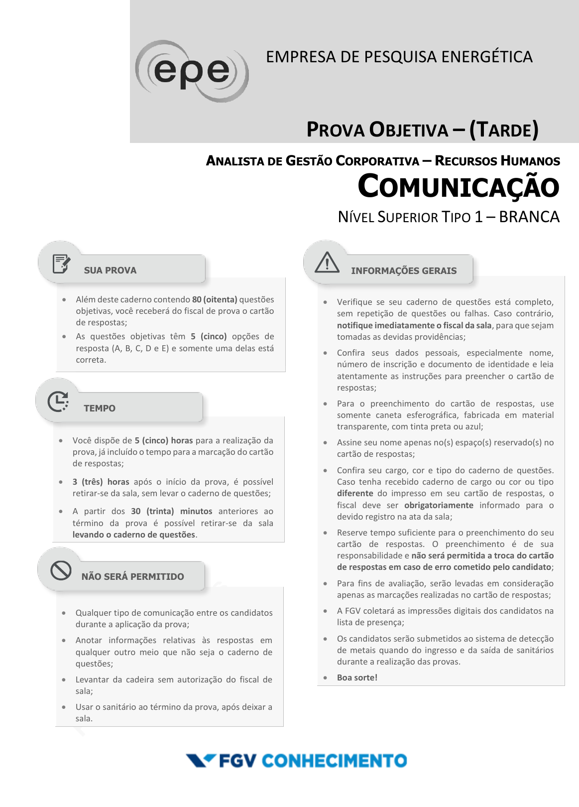 pcimarkpci MDAwMDowMDAwOjAwMDA6MDAwMDowMDAwOmZmZmY6OTU0ZTpiOTRj:VGh1LCAzMCBKYW4gMjAyNSAwMzozNzowMiAtMDMwMA== www.pciconcursos.com.br EMPRESA DE PESQUISA ENERGÉTICA PROVA OBJETIVA – (TARDE) ANALISTA DE GESTÃO CORPORATIVA – RECURSOS HUMANOS COMUNICAÇÃO NÍVEL SUPERIOR TIPO 1 – BRANCA • Além deste caderno contendo 80 (oitenta) questões objetivas, você receberá do fiscal de prova o cartão de respostas; • As questões objetivas têm 5 (cinco) opções de resposta (A, B, C, D e E) e somente uma delas está correta. • • Verifique se seu caderno de questões está completo, sem repetição de questões ou falhas. Caso contrário, notifique imediatamente o fiscal da sala, para que sejam tomadas as devidas providências; • Confira seus dados pessoais, especialmente nome, número de inscrição e documento de identidade e leia atentamente as instruções para preencher o cartão de respostas; • Para o preenchimento do cartão de respostas, use somente caneta esferográfica, fabricada em material transparente, com tinta preta ou azul; • Assine seu nome apenas no(s) espaço(s) reservado(s) no cartão de respostas; • Confira seu cargo, cor e tipo do caderno de questões. Caso tenha recebido caderno de cargo ou cor ou tipo diferente do impresso em seu cartão de respostas, o fiscal deve ser obrigatoriamente informado para o devido registro na ata da sala; • Reserve tempo suficiente para o preenchimento do seu cartão de respostas. O preenchimento é de sua responsabilidade e não será permitida a troca do cartão de respostas em caso de erro cometido pelo candidato; • Para fins de avaliação, serão levadas em consideração apenas as marcações realizadas no cartão de respostas; • A FGV coletará as impressões digitais dos candidatos na lista de presença; • Os candidatos serão submetidos ao sistema de detecção de metais quando do ingresso e da saída de sanitários durante a realização das provas. • Boa sorte! • Você dispõe de 5 (cinco) horas para a realização da prova, já incluído o tempo para a marcação do cartão de respostas; • 3 (três) horas após o início da prova, é possível retirar-se da sala, sem levar o caderno de questões; • A partir dos 30 (trinta) minutos anteriores ao término da prova é possível retirar-se da sala levando o caderno de questões. • Qualquer tipo de comunicação entre os candidatos durante a aplicação da prova; • Anotar informações relativas às respostas em qualquer outro meio que não seja o caderno de questões; • Levantar da cadeira sem autorização do fiscal de sala; • Usar o sanitário ao término da prova, após deixar a sala. SUA PROVA TEMPO NÃO SERÁ PERMITIDO INFORMAÇÕES GERAIS pcimarkpci MDAwMDowMDAwOjAwMDA6MDAwMDowMDAwOmZmZmY6OTU0ZTpiOTRj:VGh1LCAzMCBKYW4gMjAyNSAwMzozNzowMiAtMDMwMA== www.pciconcursos.com.br pcimarkpci MDAwMDowMDAwOjAwMDA6MDAwMDowMDAwOmZmZmY6OTU0ZTpiOTRj:VGh1LCAzMCBKYW4gMjAyNSAwMzozNzowMiAtMDMwMA== www.pciconcursos.com.br EMPRESA DE PESQUISAS ENERGÉTICAS - EPE FGV CONHECIMENTO ANALISTA DE GESTÃO CORPORATIVA – RECURSOS HUMANOS – COMUNICAÇÃO – TARDE TIPO BRANCA – PÁGINA 3 Conhecimentos Básicos Língua Portuguesa 1 Sobre a charge acima, assinale a afirmativa incorreta. (A) Identificamos os personagens como prisioneiros também pelo uniforme que usam. (B) Outro motivo de identificarmos os personagens como prisioneiros é a presença de uma janela com grades. (C) Os temas explorados nos quadros mostram as semelhanças entre os prisioneiros. (D) As posições dos prisioneiros mostram, respectivamente, da esquerda para a direita, inquietação e tranquilidade. (E) Os defeitos nas paredes caracterizam o local onde estão os prisioneiros como pobre e descuidado. 2 Assinale a opção que indica a frase em que o vocábulo lá mostra antecedente expresso. (A) Se eu pudesse ir para o céu com um partido, eu lá não iria de modo algum. (B) Os mecânicos me conhecem e quando apareço por lá fazem uma festa. (C) Meus colegas ainda me acompanharam por lá durante um tempo. (D) Os livros estão custando muito caro e por isso eu não vou mais lá. (E) Todos querem a medalha de ouro, mas quando chegam lá, ficam nervosos e choram. 3 As opções a seguir apresentam frases nas quais o pronome pessoal oblíquo sublinhado está corretamente empregado, à exceção de uma. Assinale-a. (A) Quando não se pode derrotar, torne-se sócio. (B) Qual é o melhor governo? O que nos ensina a governar a nós mesmos. (C) A espada está erguida e não posso embainhá-la sem a vitória ou sem honra. (D) Entre mortos e feridos salvaram-se todos. (E) Não se acaba com a corrupção, se combate. 4 Assinale a opção que mostra a frase em que a comparação realizada não é explicada. (A) Leis são como salsichas: é melhor não ver como são feitas. (B) Todo mundo no governo é como uma porção de formigas sobre um tronco que flutua em um rio. Cada um pensa que está dirigindo o tronco. (C) Política é como fotografia. Se você se mexer, não sai. (D) Os reis com seus ministros são como maridos enganados com suas mulheres. (E) A saída do estádio era como um enterro: todos de cabeça baixa e alguns choravam. 5 Assinale a opção que apresenta a frase em que o pronome sublinhado refere-se a um termo anterior. (A) O tempo das armas não é o das leis. (B) O grande triunfo do adversário é fazer-nos crer o que diz de nós. (C) Eles não estão certos sobre o que pensam sobre a guerra. (D) Eles agiram conforme o que manda o manual. (E) Ele não faz o que lhe mandam. 6 Assinale a opção que apresenta a frase em que a locução adverbial sublinhada foi substituída, adequadamente, por um advérbio de mesmo significado. (A) Agia todos os dias da mesma forma. / frequentemente. (B) À força de conceder direito a todos, a democracia é o regime que mata com mais segurança. / securitariamente. (C) Dos poderosos nada se consegue que não seja cobrado em dobro. / dualmente. (D) Não se