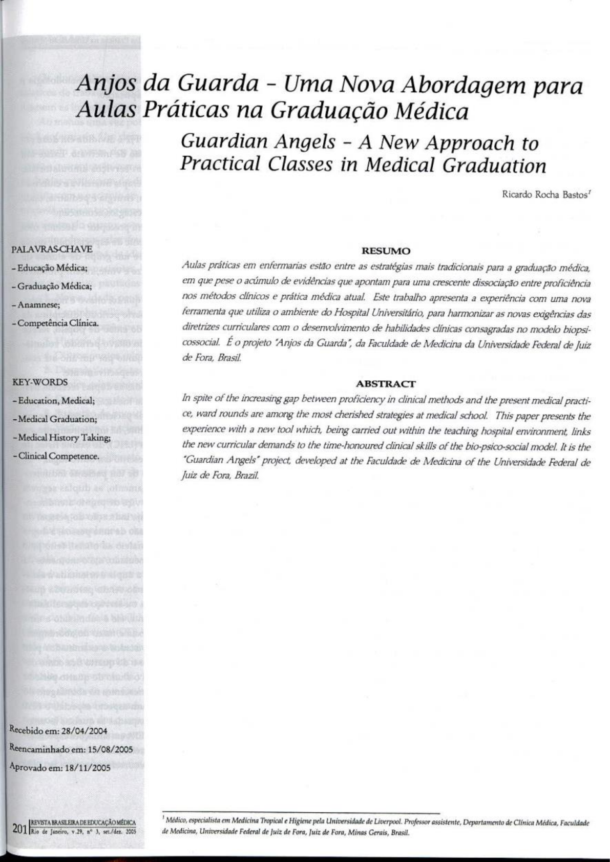 Anjos da Guarda - Uma Nova Abordagem para Aulas Práticas na Graduação Médica Guardian Angels - A New Approach to Practical Classes in Medical Graduation Ricardo Rocha RESUMO - Educação Médica; Aulas práticas em enfermarias estão entre as mais tradicionais para a graduação médica, em que pese o acúmulo de evidências que apontam para uma crescente dissociação entre proficiência Graduação Médica; nos métodos clínicos e prática médica atual. Este trabalho apresenta a experiência com uma nova Anamnese; ferramenta que utiliza o ambiente do Hospital Universitário, para harmonizar as novas das Competência Clínica. diretrizes curriculares com o desenvolvimento de habilidades clínicas consagradas no modelo biopsi- cossocial. É projeto "Anjos da da Faculdade de Medicina da Universidade Federal de Juiz de Fora, Brasil. KEY-WORDS ABSTRACT - Education, Medical; In spite of the increasing gap between proficiency in clinical methods and the present medical practi- ce, ward rounds are among the most cherished strategies at medical school. This paper presents the Medical Graduation; experience with a new tool which, being carried out within the teaching hospital environment, links Medical History Taking; the new curricular demands to the time-honoured clinical skills of the bio-psico-social model. It is the Clinical Competence. "Guardian project, developed at the Faculdade de Medicina of the Universidade Federal de Juiz de Fora, Recebido em: 28/04/2004 Reencaminhado em: 15/08/2005 Aprovado em: 18/11/2005 REVISTA Médico, especialista em Medicina Tropical e Higiene pela Universidade de Professor assistente, Departamento de Médica, Faculdade 201 Rio de n° 2003 de Medicina, Universidade Federal de Juiz de Fora, Juiz de Fora, Minas Gerais, Brasil.Ricardo Rocha Bastos Anjos da Guarda Uma Nova Abordagem para Aulas Práticas na Graduação Médica INTRODUÇÃO cias curriculares. Este trabalho apresenta sua metodologia e Aulas práticas são tradicionalmente reconhecidas como os resultados do primeiro ano de aplicação. estratégia integrante dos currículos de graduação médica e seu valor, quanto à fixação de experiências, tem sido assina- MÉTODO lado por parte de muitas autoridades. A graduação médica na FM-UFJF é dividida em doze pe- Podendo acontecer onde quer que a atividade médica se dos quais os três últimos são de Existe um desenrole, é nas enfermarias, entretanto, que gerações de gra- Hospital Universitário (HU), com serviços ambulatoriais, duandos têm tido a maior parte de sua exposição. A visita às pronto-atendimento, unidade de terapia intensiva e enferma- enfermarias, como modalidade de o aprendiz seqüenci- rias de clínica médica, ginecologia, cirurgia e pediatria, onde almente a indivíduos com suas doenças, ainda que possivel- grande parte das aulas práticas e estágios acontecem. mente existente de uma certa forma já no antigo alcança o projeto tem início quando um preceptor docente com uma estrutura bem definida e documentada com os trabalhos formação clínica, independentemente de especialidade ou de de Laennec, no início do século XIX, em Muito valoriza- vinculação departamental recebe um grupo de alunos de da por pioneiros do moderno método clínico ocidental,4 alcan- graduação, geralmente entre quinze e vinte, çou posição definida em nossos currículos,5 sendo desejada com dos ao quarto período. ansiedade pelos alunos sequiosos de ingressarem no ciclo pro- Participam alunos do quarto, quinto, oitavo e nono A disciplina de semiologia médica é historica- odos. Ao ser promovido para o quarto período (disciplina de mente responsável por esse primeiro contato com as enferma- Semiologia I), cada aluno, chamado então de pupilo, recebe rias e, durante minha experiência profissional, tenho observa- seu "anjo da guarda", um aluno do oitavo período, voluntá- do que a expectativa não é correspondida pela qualidade das rio. Essa dupla trabalhará em conjunto por um ano até con- atividades desenvolvidas, com os encontros se dando num am- cluírem quinto e nono períodos, respectivamente. biente de artificialidade em que o que ocorre não guarda muita No início do período letivo, todas as duplas recebem trei- relação com a verdadeira prática médica. Vivemos o paradoxo namento em técnicas de entrevista médica, com simulações em que, por um lado se proclama a relevância da proficiência nas quais o preceptor faz o papel de paciente, e estudo de um clínica e, por outro, avolumam-se as evidências de que as habi- vídeo Paralelamente, há um treinamento, no lidades de e exame físico8 talvez estejam entre as laboratório de habilidades clínicas (LHC), do exame físico de mais precárias da prática médica atual. abordagem (EFA), um conjunto descrito em outro de Consoante a tendência mundial de uma graduação médi- manobras para abordagem inicial de um paciente indiferen- ca que desenvolva valores profissionais e pessoais, expressos ciado. Após esse período de treinamento, as duplas seguem na Declaração de Edimburgo,9 as Diretrizes Curriculares Na- uma escala de permanência no serviço de pronto atendimen- clamam por uma formação que seja "generalista, to (SPA) do Tão logo haja indicação do pessoal do humanística, crítica e reflexiva", enquanto incluem nos seis SPA, staff e residentes, para admissão de uma pessoa, a dupla conteúdos essenciais de realizar história clíni- assume seu acompanhamento, paralelo ao oficial, feito pelo ca e exame físico, conhecimento fisiopatológico dos sinais e serviço ao qual o paciente está vinculado, até o momento da sintomas; capacidade reflexiva e compreensão ética, psicoló- alta. Para evitar o viés de seleção, a dupla é orientada a assu- gica e da relação médico-paciente... o Progra- mir a primeira pessoa admitida, não sendo permitida qual- ma de Incentivo a Mudanças Curriculares dos Cursos de Me- quer escolha quanto a sexo, idade, ou serviç