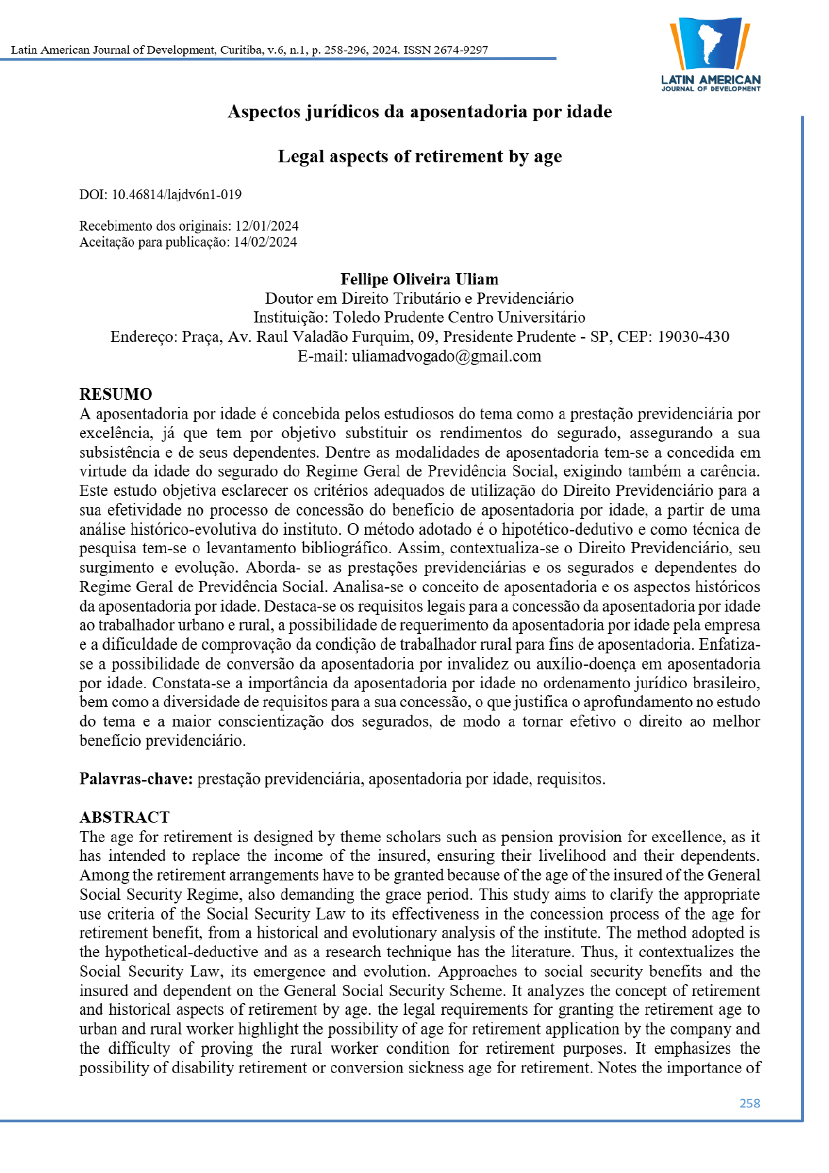 Latin American Journal of Development, Curitiba, v.6, n.1, p. 258-296, 2024. ISSN 2674-9297 LATIN AMERICAN JOURNAL OF DEVELOPMENT Aspectos jurídicos da aposentadoria por idade Legal aspects of retirement by age DOI: 10.46814/lajdv6n1-019 Recebimento dos originais: 12/01/2024 Aceitação para publicação: 14/02/2024 Fellipe Oliveira Uliam Doutor em Direito Tributário e Previdenciário Instituição: Toledo Prudente Centro Universitário Endereço: Praça, Av. Raul Valadão Furquim, 09, Presidente Prudente - SP, CEP: 19030-430 E-mail: uliamadvogado@gmail.com RESUMO A aposentadoria por idade é concebida pelos estudiosos do tema como a prestação previdenciária por excelência, já que tem por objetivo substituir os rendimentos do segurado, assegurando a sua subsistência e de seus dependentes. Dentre as modalidades de aposentadoria tem-se a concedida em virtude da idade do segurado do Regime Geral de Previdência Social, exigindo também a carência. Este estudo objetiva esclarecer os critérios adequados de utilização do Direito Previdenciário para a sua efetividade no processo de concessão do benefício de aposentadoria por idade, a partir de uma análise histórico-evolutiva do instituto. método adotado é o hipotético-dedutivo e como técnica de pesquisa tem-se o levantamento bibliográfico. Assim, contextualiza-se o Direito Previdenciário, seu surgimento e evolução. Aborda- se as prestações previdenciárias e os segurados e dependentes do Regime Geral de Previdência Social. Analisa-se o conceito de aposentadoria e os aspectos históricos da aposentadoria por idade. Destaca-se os requisitos legais para a concessão da aposentadoria por idade ao trabalhador urbano e rural, a possibilidade de requerimento da aposentadoria por idade pela empresa e a dificuldade de comprovação da condição de trabalhador rural para fins de aposentadoria. Enfatiza- se a possibilidade de conversão da aposentadoria por invalidez ou auxílio-doença em aposentadoria por idade. Constata-se a importância da aposentadoria por idade no ordenamento jurídico brasileiro, bem como a diversidade de requisitos para a sua concessão, o que justifica o aprofundamento no estudo do tema e a maior conscientização dos segurados, de modo a tornar efetivo o direito ao melhor benefício previdenciário. Palavras-chave: prestação previdenciária, aposentadoria por idade, requisitos. ABSTRACT The age for retirement is designed by theme scholars such as pension provision for excellence, as it has intended to replace the income of the insured, ensuring their livelihood and their dependents. Among the retirement arrangements have to be granted because of the age of the insured of the General Social Security Regime, also demanding the grace period. This study aims to clarify the appropriate use criteria of the Social Security Law to its effectiveness in the concession process of the age for retirement benefit, from a historical and evolutionary analysis of the institute. The method adopted is the hypothetical-deductive and as a research technique has the literature. Thus, it contextualizes the Social Security Law, its emergence and evolution. Approaches to social security benefits and the insured and dependent on the General Social Security Scheme. It analyzes the concept of retirement and historical aspects of retirement by age. the legal requirements for granting the retirement age to urban and rural worker highlight the possibility of age for retirement application by the company and the difficulty of proving the rural worker condition for retirement purposes. It emphasizes the possibility of disability retirement or conversion sickness age for retirement. Notes the importance of 258Latin American Journal of Development, Curitiba, v.6, n.1, p. 258-296, 2024. ISSN 2674-9297 LATIN AMERICAN JOURNAL OF DEVELOPMENT age for retirement in the Brazilian legal system, as well as the diversity of requirements for its grant, which justifies the deepening on the subject of the study and the increased awareness of the insured, in order to make effective the right to the best social security benefits. Keywords: social security services, retirement age, requirements. 1 INTRODUÇÃO presente estudo versa sobre a evolução da aposentadoria por idade no ordenamento jurídico brasileiro, a partir da análise doutrinária e legal, mormente as Leis n° 8.212/1991 e 8.213/1991, em uma visão sistêmica e prática, da efetividade e eficácia objetivada da Previdência Social. A atual e crescente valorização das medidas de benefícios previdenciários, com o paralelo respaldo das conceituações e sistematizações, enriquece o tema acerca da importância e conveniência da presente política previdenciária, a exemplo do que se processa quanto ao conceito e natureza das diferentes medidas disponíveis no ordenamento atinentes à agilização dos procedimentos de geração de benefícios, tanto administrativo quanto judicial no mundo contemporânea. Nesse ponto é mister destacar que a aposentadoria tem como propósito o surgimento latente de um direito, com a busca do efetivo benefício aos segurados. Assim, o problema que se vislumbra é a necessidade de que as aposentadorias por idade sejam aplicadas de forma correta, ou seja, como preconiza a legislação brasileira. Desta feita, no presente trabalho se analisa os requisitos e hipóteses do seu cabimento. presente trabalho trata da premente e relevante tarefa de justificar o novo perfil da prestação previdenciária, para a sua compatibilização com os princípios da garantia do devido benefício, o que é viabilizado por meio da utilização criteriosa dos institutos, da terminologia própria e adequada na conceituação do direito, da classificação racional, técnica e útil dos institutos. Tal panorama convida a uma análise da questão, que passa pela confusão que ainda se verifica entre, por exemplo, a celeridade e a sumarização do processo administrativo, ent