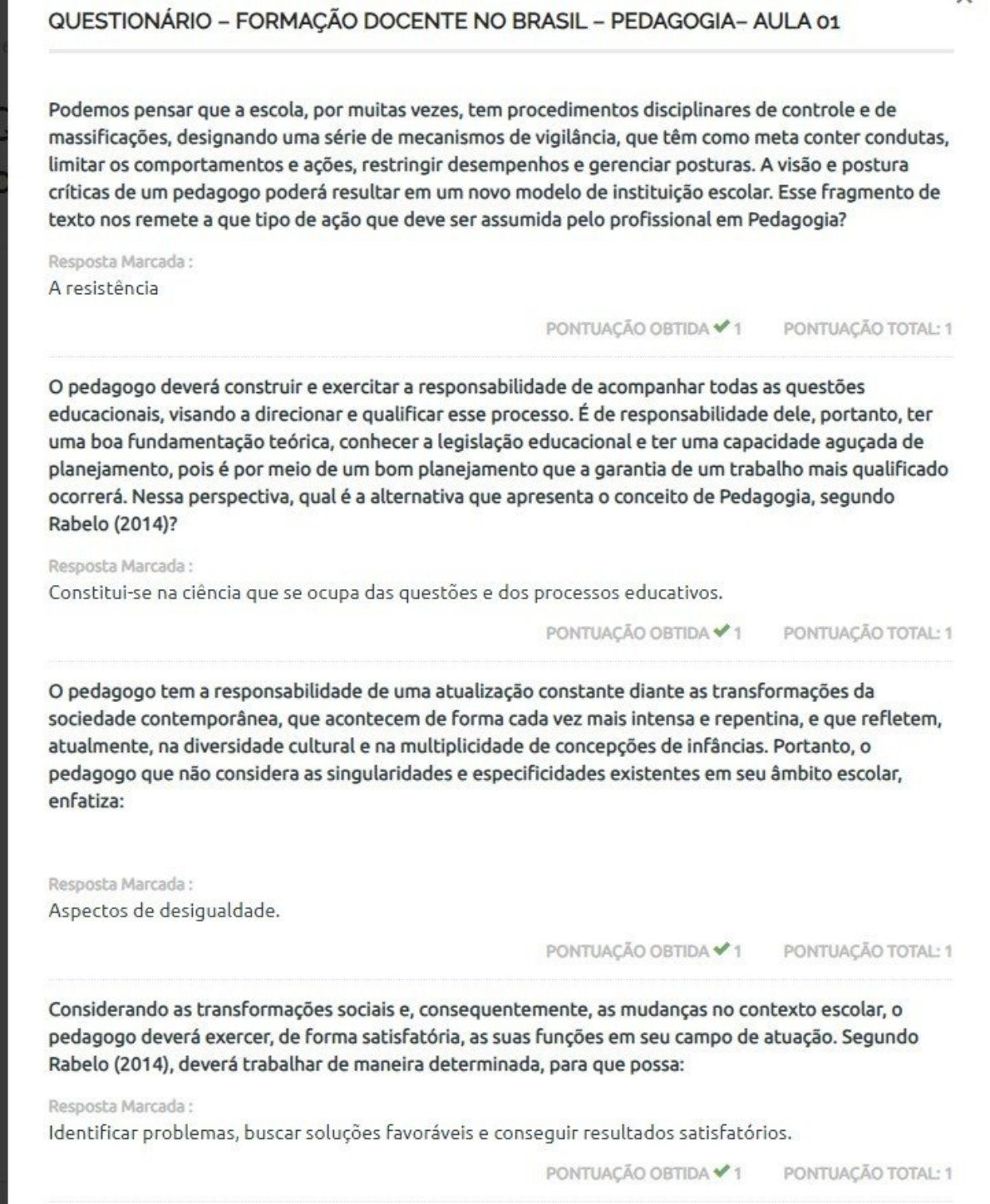 QUESTIONÁRIO - FORMAÇÃO DOCENTE NO BRASIL - PEDAGOGIA- AULA 01 Podemos pensar que a escola, por muitas vezes, tem procedimentos disciplinares de controle e de massificações, designando uma série de mecanismos de vigilância, que têm como meta conter condutas, limitar os comportamentos e ações, restringir desempenhos e gerenciar posturas. A visão e postura críticas de um pedagogo poderá resultar em um novo modelo de instituição escolar. Esse fragmento de texto nos remete a que tipo de ação que deve ser assumida pelo profissional em Pedagogia? Resposta Marcada : A resistência PONTUAÇÃO OBTIDA 1 PONTUAÇÃO TOTAL: 1 o pedagogo deverá construir e exercitar a responsabilidade de acompanhar todas as questões educacionais, visando a direcionar e qualificar esse processo. É de responsabilidade dele, portanto, ter uma boa fundamentação teórica, conhecer a legislação educacional e ter uma capacidade aguçada de planejamento, pois é por meio de um bom planejamento que a garantia de um trabalho mais qualificado ocorrerá. Nessa perspectiva, qual é a alternativa que apresenta o conceito de Pedagogia, segundo Rabelo (2014)? Resposta Marcada : Constitui-se na ciência que se ocupa das questões e dos processos PONTUAÇÃO OBTIDA 1 PONTUAÇÃO TOTAL: 1 o pedagogo tem a responsabilidade de uma atualização constante diante as transformações da sociedade que acontecem de forma cada vez mais intensa e repentina, e que refletem, atualmente, na diversidade cultural e na multiplicidade de concepções de infâncias. Portanto, o pedagogo que não considera as singularidades e especificidades existentes em seu âmbito escolar, enfatiza: Resposta Marcada : Aspectos de desigualdade. PONTUAÇÃO OBTIDA 1 PONTUAÇÃO TOTAL: 1 Considerando as transformações sociais e, consequentemente, as mudanças no contexto escolar, o pedagogo deverá exercer, de forma satisfatória, as suas funções em seu campo de atuação. Segundo Rabelo (2014), deverá trabalhar de maneira determinada, para que possa: Resposta Marcada : Identificar problemas, buscar soluções favoráveis e conseguir resultados satisfatórios. PONTUAÇÃO OBTIDA 1 PONTUAÇÃO TOTAL: 1Pensar no currículo para a formação do profissional em pedagogia implica em pensar em um processo impregnado com o problema da relação teoria-prática, pois conceber o currículo desse profissional demanda que se tenha uma concepção de mundo, sociedade e educação e, ainda, considerar os fundamentos filosóficos, ideológicos, sociológicos, epistemológicos, antropológicos, políticos e institucionais/administrativos [...], visto que nele está imbricada a questão política da racionalidade da ação. Ele concerne, também, às decisões educativas, sendo, portanto, afeto a questões de planejamento (concepção) e (processo) (SANTOS, 2009). Qual das alternativas, a seguir, resume adequadamente o texto em questão? Resposta Marcada : Para a construção curricular do profissional em pedagogia, não se deve estar pensando apenas nos conteúdos a serem trabalhados didaticamente dentro da sala de aula, mas, também, nas possibilidades desses conteúdos serem levados para a ampliação social do espaço extraescolar. PONTUAÇÃO OBTIDA 1 PONTUAÇÃO TOTAL: 1 Total 5 /5QUESTIONÁRIO - FORMAÇÃO DOCENTE NO BRASIL - PEDAGOGIA- AULA 02 Diante de tantas aptidões, é preciso que os profissionais em Pedagogia consigam compreender, principalmente, as transformações educacionais, políticas, científicas e sociais da sociedade, considerando os mais diversos vieses e as diversidades existentes neste processo de construção do conhecimento. Nesta perspectiva, quais são os campos de atuação do profissional em Pedagogia? Resposta Marcada Pedagogia Empresarial, Brinquedoteca e Pedagogia Hospitalar. PONTUAÇÃO OBTIDA 1 PONTUAÇÃO TOTAL: 1 As diretrizes curriculares para o Curso de Pedagogia, definidas pela Resolução 1, de 15 de maio de 2006, do Conselho Nacional de Educação, trouxeram o debate a respeito da identidade do curso e da sua finalidade profissionalizante, agora instituída como Licenciatura. Portanto, o Curso de Pedagogia destina-se, na sua atual formulação legal, à: Resposta Marcada À formação de professores de Educação Infantil dos anos iniciais do Ensino Fundamental. PONTUAÇÃO OBTIDA 1 PONTUAÇÃO TOTAL: 1 De acordo com a Resolução 1, de 15 de maio de 2006, do Conselho Nacional de Educação, a organização curricular do curso de Pedagogia foi definida segundo os princípios da docência como base da formação, da flexibilização do currículo e da organização dos conteúdos por meio de diversas formas didáticas. Portanto, a estrutura curricular do curso de Pedagogia deverá ser organizada em três grandes núcleos, que são: Resposta Marcada Estudos básicos, de aprofundamento e diversificação de estudos e estudos integradores. PONTUAÇÃO OBTIDA x 0 PONTUAÇÃO TOTAL: 1 Nadime (2003), ressalta que o preconceito poderá ser manifestado pelo simples discurso ou ato de um sujeito e poderá, também, tomar forma, estruturando-se a partir da observação do cotidiano escolar. Nesta perspectiva, o pedagogo deve estar sempre atento para não ser conivente com ações de intolerância e desrespeito. Considerando o exposto por Nadime (2003), é correto afirmar que: Resposta Marcada : O sujeito poderá ser uma via de disseminação de intolerância por meio da linguagem ou do pequeno gesto PONTUAÇÃO OBTIDA 1 PONTUAÇÃO TOTAL: 1A Pedagogia Empresarial foi criada para dar suporte à estruturação das mudanças, ampliação e aquisição de conhecimento no espaço organizacional. profissional como instrumento de educação empresarial surge para promover a reconstrução de conceitos básicos, como criatividade, espírito de equipe, etc. São, ainda, campos de atuação do pedagogo empresarial: Resposta Marcada : Gestão de projetos, gestão cultural e RH PONTUAÇÃO OBTIDA 1 PONTUAÇÃO TOTAL: 1 Total 4 /5QUEST