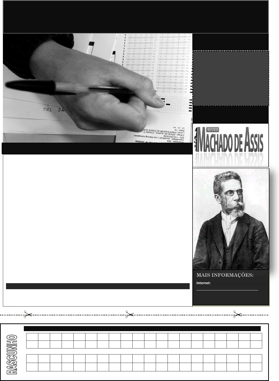 www.pciconcursos.com.br INSTITUTO MACHADO DE ASSIS – IMA CONCURSO PÚBLICO PREFEITURA MUNICIPAL PAULISTANA - PI . 01 02 03 04 05 06 07 08 09 10 11 12 13 14 15 16 17 18 19 20 21 22 23 24 25 26 27 28 29 30 31 32 33 34 35 36 37 38 39 40 MAIS INFORMAÇÕES: Internet: www.institutomachadodeassis.com.br Telefone: (86) 3303-3146 FOLHA DE ANOTAÇÃO DO GABARITO - ATENÇÃO: Esta parte somente deverá ser destacada pelo fiscal da sala, após o término da prova TURNO: TARDE LEIA COM ATENÇÃO AS INSTRUÇÕES ABAIXO: 1. Examine se a prova está completa, se há falhas ou imperfeições gráficas que causem dúvidas. Qualquer reclamação somente será aceita até os 15 minutos iniciais. 2. A prova consistirá de 40 questões com quatro alternativas (A, B, C, D) das quais apenas uma é verdadeira. Leia atentamente cada questão e escolha a alternativa, marcando sua resposta no cartão resposta, cobrindo levemente todo o espaço correspondente à letra a ser assinalada. 3. O candidato somente poderá levar o Caderno de Questões caso saía da sala de aplicação de sua prova nos últimos 30 (trinta) minutos. 4. Não poderão ser utilizados, durante a prova, recursos como: régua, dicionário, boné, calculadora, relógio digital, bem como outro material que possa indicar tentativa de fraude. 5. 5.3.1. A prova objetiva será realizada na cidade de Paulistana (PI), no dia 08.11.2015 e terá a duração de 03 (três) horas para todos os cargos. No horário de 09h00 (nove horas) às 12h00(doze horas) serão aplicadas as provas para os cargos de nível médio, superior e professor e no horário das 14h00min (quatorze horas) as 17h00min (dezessete horas) as provas para os cargos de nível fundamental. 6. Reserve os 30 (trinta) minutos finais para marcar seu Cartão de Respostas. Os rascunhos e as marcações assinaladas no Caderno de Questões não serão levados em conta. NOME DO CANDIDATO: ____________________________________________________________________________________ CADERNO DE PROVA OBJETIVA ESTADO DO PIAUÍ PREFEITURA MUNICIPAL DE PAULISTANA CONCURSO PÚBLICO PARA PROVIMENTO DE CARGOS AUXILIAR DE SERVIÇOS GERAIS/ ZELADOR CARGO: http://www.institutomachadodeassis.com.br/ www.pciconcursos.com.br In st it u to M a c h a d o d e A ss is Cargo: Auxiliar de Serviços Gerais/Zelador(a) PREFEITURA MUNICIPAL DE PAULISTANA - PI LÍNGUA PORTUGUESA QUESTÕES DE 1 A 15 INSTRUÇÃO: Para responder a essas questões, assinale APENAS UMA ÚNICA alternativa correta e marque o número correspondente na Folha de Respostas. Assinale a alternativa exata quanto à grafia e ao uso das palavras: A) A atual conjuntura econômica vai de mal a pior. B) Rebeca e Beatriz deferiam no modo de pensar, mas eram melhores amigas. C) Os recursos serão todos julgados em segunda estância. D) Não deixe que isso passe despercebido. Aponte a palavra que possui a mesma regra de acentuação aplicada em ÁLCOOIS: A) órfã B) máscara C) jóquei D) fórceps Marque a opção em que a palavra em destaque possui o mesmo sentido de IMERGIR: A) O salva-vidas mergulhou e resgatou o menino que estava se afogando. B) Depois da tempestade, o sol surgiu das nuvens. C) Os raios de luz intercalam-se em direção perpendicular à superfície. D) Transpor água de um rio para o outro não resolve o problema da seca. A palavra CAATINGA é: A) monossílaba B) dissílaba C) trissílaba D) polissílaba Assinale a palavra que obedece a mesma regra de flexão de número que CIDADÃO: A) limão B) razão C) cristão D) capitão Ainda em relação à flexão de número do substantivo, assinale a alternativa errada: A) águas-de-colônia B) girassóis C) couves-flor D) navios-escola Marque a opção que justifica o emprego das vírgulas na frase: “Recife, a Veneza Brasileira, é cortada por vários canais.”: A) Separar elementos que exercem a mesma função sintática. B) Separar aposto. C) Separar vocativo. D) Indicar omissão de uma palavra ou grupo de palavras. Aponte a alternativa em que o termo destacado é uma conjunção ou locução subordinativa causal: A) Como choveu muito, as ruas ficaram alagadas. B) Gritou tanto, que ficou quase sem voz. C) Nada pesa tanto como um segredo. D) Por mais que insistam, não agiremos dessa maneira. Quanto ao gênero, os adjetivos AGRÍCOLA, EXCELENTE e CRUEL: A) são todos comparativos. B) são todos uniformes. C) são uniformes os dois primeiros, e biforme o último. D) são todos biformes. Assinale a alternativa em que MEIO é advérbio: A) Este saco de arroz pesa apenas meio quilo. B) O ônibus parou no meio da rua. C) A porta está meio fechada. D) Ingeriu meia garrafa de vinho. QUESTÃO 01 QUESTÃO 02 QUESTÃO 03 QUESTÃO 04 QUESTÃO 05 QUESTÃO 06 QUESTÃO 07 QUESTÃO 08 QUESTÃO 09 QUESTÃO 10 www.pciconcursos.com.br In st it u to M a c h a d o d e A ss is Cargo: Auxiliar de Serviços Gerais/Zelador(a) PREFEITURA MUNICIPAL DE PAULISTANA - PI Marque a opção que possui erro de concordância nominal: A) Ela agiu com coragem e paciência admirável. B) Ela usava vestido e blusa amarela. C) Refiro-me aos notáveis Drummond e Bandeira. D) Estavam desarrumadas a sala e os quartos. Assinale a única alternativa que não possui encontro consonantal: A) opção B) nascer C) abrupto D) étnico __________________________________________________________________________ Leia o texto abaixo e responda as questões 13,14,15. UM HOMEM DE CONSCIÊNCIA 1. Chamava-se João Teodoro, só. O mais pacato e modesto dos homens. Honestíssimo e lealíssimo, com um defeito apenas: não dar o mínimo valor a si próprio. Para João Teodoro, a coisa de menos importância no mundo era João Teodoro. 2. Nunca fora nada na vida, nem admitia a hipótese de vir a ser alguma coisa. E por muito tempo não quis nem sequer o que todos queriam: mudar-se para terra melhor. 3. Mas João Teodoro acompanhava com aperto de coração o desaparecimento visível de sua Itaoca. 4. – Isto já foi muito melhor, dizia consigo. Já teve três médico