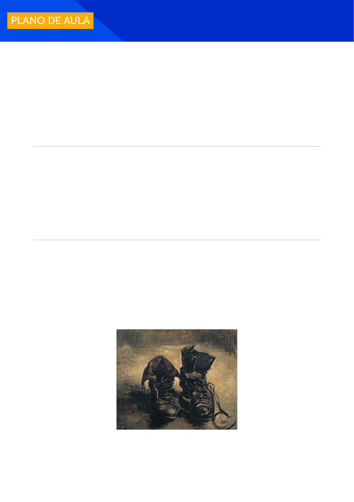 Público PRÁTICAS PEDAGÓGICAS EM PORTUGUÊS:ANOS FINAIS DO ENSINO FUNDAMENTAL Olá, estudante! Neste momento, você realizará uma atividade prática relacionada a uma situação típica da atuação do professor. Objetivos • Promover o conhecimento sobre a importância do trabalho interdisciplinar para a efetivação das práticas educativas; • Estimular a criatividade do estudante; • Valorizar os diferentes gêneros textuais bem como as diferentes formas de análise semiótica/linguística. Situação-problema Caro estudante, neste projeto, propomos a você um exercício prático, no qual você será o professor de Língua Portuguesa de uma turma do 9º ano do Ensino Fundamental. Você irá sugerir uma atividade interdisciplinar, mostrando como é possível fazer a análise semiótica das obras de arte: O par de sapatos e Um par de tamancos de couro, ambas pintadas por Vincent van Gogh, como vemos nas imagens a seguir: Figura 1 | O par de sapatos, 1886, Van Gogh Fonte: Domínio Público. ATIVIDADE PRÁTICA Público Figura 2 | Um par de tamancos de couro, 1889, Van Gogh Fonte: Domínio Público. Diante das imagens, você, como professor do 9º ano, pensará em estratégias possíveis para a proposição de uma aula que aplique a interdisciplinaridade e ainda envolva os alunos em uma atividade em grupo. Para tanto, você, futuro professor de Língua Portuguesa, precisará focar em algumas das habilidades da BNCC, tais como: (EF69LP30) Comparar, com a ajuda do professor, conteúdos, dados e informações de diferentes fontes, levando em conta seus contextos de produção e referências, identificando coincidências, complementaridades e contradições, de forma a poder identificar erros/imprecisões conceituais, compreender e posicionar-se criticamente sobre os conteúdos e informações em questão. (EF69AR05) Experimentar e analisar diferentes formas de expressão artística (desenho, pintura, colagem, quadrinhos, dobradura, escultura, modelagem, instalação, vídeo, fotografia, performance etc.). (EF69AR31) Relacionar as práticas artísticas às diferentes dimensões da vida social, cultural, política, histórica, econômica, estética e ética. (EF69AR32) Analisar e explorar, em projetos temáticos, as relações processuais entre diversas linguagens artísticas. Além disso, você, como professor mediador da turma, deverá auxiliar os alunos na resolução de dúvidas e nas dificuldades por eles enfrentadas. Na sua sala, alguns alunos dizem não compreender essa possível relação entre língua portuguesa e arte; por esse motivo, você deverá mostrar, com exemplos, essas aproximações relacionando as práticas artísticas com a produção das múltiplas linguagens e seus efeitos de sentido. Passo 1 Para realizar a atividade, você precisará: • elaborar um plano de aula destinado a estudantes do 9º ano do Ensino Fundamental, seguindo a proposta apresentada na situação-problema. • seguir as instruções e preencher o quadro a seguir, que consiste em um modelo de plano ATIVIDADE PRÁTICA Público de aula. Nenhum dos itens deve ser excluído ou ficar sem preenchimento. PLANO DE AULA Componente curricular: Insira aqui o nome da disciplina. Unidade temática: Insira aqui a unidade temática conforme a BNCC. Objeto do conhecimento: Insira aqui o objeto do conhecimento conforme a BNCC. Habilidade(s): Insira aqui a(s) habilidade(s) conforme a BNCC, reproduzindo a numeração e a descrição. Tema da aula: Insira aqui o título da aula. Turma: Insira aqui o ano e o nível de ensino. Duração: Insira aqui o número de aulas e o tempo de cada uma delas. Objetivo(s): Insira aqui o(s) objetivo(s) que você deseja que os estudantes alcancem. Competências : Insira aqui as competências conforme a BNCC. Conteúdo programático: Insira aqui os conteúdos a serem abordados. Metodologia: Insira aqui as estratégias que orientam a condução da aula (ex: criação de mapa conceitual, sala de aula invertida, etc.). Recursos didáticos: Insira aqui os materiais a serem utilizados (ex: lousa, games, música, etc.). Resultados de aprendizagem Insira aqui os resultados de aprendizagem esperados para essa aula. Critérios de avaliação: Insira aqui os métodos avaliativos. Referências: Insira aqui a bibliografia básica e a complementar. Passo 2: Elaboração do trabalho para postagem no AVA, contendo: 1) Capa da Instituição, conforme orientação disponível na biblioteca virtual. 2) Introdução: texto dissertativo fundamentando a proposta do plano de aula, os objetivos e resultados de apendizagem esperados.. 3) Plano de aula elaborado, conforme modelo estabelecido no passo 1. NORMAS PARA ENTREGA DA ATIVIDADE PRÁTICA • Você deverá postar seu trabalho final no AVA, na pasta específica relacionada à atividade prática, obedecendo o prazo limite de postagem, conforme disposto no AVA. ATIVIDADE PRÁTICA Público • O trabalho deve ser enviado em formato Word ou PDF, em um ARQUIVO ÚNICO de até 10 MB. • O sistema permite anexar apenas um arquivo. Caso haja mais de uma postagem, será considerada a última versão. IMPORTANTE: • A entrega da atividade, de acordo com a proposta solicitada, é um critério de aprovação na disciplina. • Não há prorrogação para a postagem da atividade. Aproveite essa oportunidade para aprofundar ainda mais seus conhecimentos. Bons estudos! Referências ACERVO da Fundação Vincent Van Gogh. Descubra a vida e obra de Vincent Van Gogh. Museu Van Gogh. Amsterdam. 2023. Disponível em: https://www.vangoghmuseum.nl/nl. Acesso em: 04 jul. 2024. BRASIL. Base Nacional Comum Curricular (BNCC). Ministério da Educação, 2018. Disponível em: http://basenacionalcomum.mec.gov.br/images/BNCC_EI_EF_110518_versaofinal_site.pdf Acesso em: 26 jan. 2023. BRASIL. Base Nacional Comum Curricular. Caderno de práticas do ensino fundamental – Anos finais. Ministério da Educação. Disponível em: http://basenacionalcomum.mec.gov.br/implementacao/praticas/