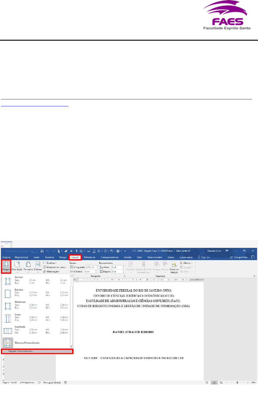 Curso: Administração Disciplina: Informática Aplicada a Administração Professora: Jaquelyne França 10 dicas para formatar TCC no Word de acordo com a ABNT Conheça alguns recursos para normalizar seus trabalhos acadêmicos Por Daniel Ribeiro. Fonte: Tectudo (2018). Recuperado em 08 de junho de 2019 de https://www.techtudo.com.br/noticias/2018/03/10-dicas-para-formatar-monografia-no-word-de- acordo-com-a-abnt.ghtml O TCC ou monografia deve ser formatado de acordo com as normas da ABNT (Associação Brasileira de Normas Técnicas). Ao criar o documendo no Word, o estudante pode editar a fonte, margem, espaçamento, números de página, citações, sumário e referências bibliográficas. Veja a seguir as regras da ABNT e 10 dicas e truques para formatar seu trabalho de conclusão de curso e padronizá-lo de acordo com elas. 1. Margens Segundo a ABNT NBR 14724:2011, que regula as configurações de trabalhos acadêmicos, as margens da folha devem ter 3 cm no anverso esquerdo superior e no verso direito superior, e 2 cm no anverso direito inferior e verso esquerdo inferior. Passo 1. Para formatar a página no Microsoft Word dentro destas especificações, o usuário deve selecionar a barra “Layout”, clicar em “Margens” e escolher a opção “Margens Personalizadas...”. Na aba "Layout", selecione "Margens" e clique em "Margens Personalizadas..." — Foto: Reprodução/Daniel Ribeiro https://www.techtudo.com.br/noticias/2018/03/10-dicas-para-formatar-monografia-no-word-de-acordo-com-a-abnt.ghtml https://www.techtudo.com.br/noticias/2018/03/10-dicas-para-formatar-monografia-no-word-de-acordo-com-a-abnt.ghtml Passo 2. Uma janela será aberta com campos para configurar a distância de cada uma das margens separadamente. Altere conforme a ABNT ou as normas da instituição em que estuda. Na janela de personalização das margens, altere os valores segundo as especificações da ABNT — Foto: Reprodução/Daniel Ribeiro 2. Fonte, espaçamento e parágrafo De acordo com a ABNT NBR 14724:2011, recomenda-se fonte de tamanho 12 para todo trabalho, com espaçamento de 1,5 entre as linhas, salvo exceções para citações de mais de três linhas, notas de rodapé, paginação e legendas. Os critérios para parágrafos e tipo de fonte variam, mas é de costume utilizar Arial ou Times New Roman, com um recuo de 1,25cm no início do parágrafo. Passo 1. Aperte em “Selecionar” e escolha a opção “Selecionar Tudo” para marcar todo o texto do documento e padronizar a fonte, o espaçamento e o parágrafo. Em "Selecionar", aperte na opção "Selecionar Tudo" para marcar todo o texto do documento de uma só vez — Foto: Reprodução/Daniel Ribeiro Passo 2. Clique com o botão direito do mouse no texto selecionado e escolha a opção “Fonte...” para configurar a fonte do documento. Clique com o botão direito do mouse e escolha "Fonte..." — Foto: Reprodução/Daniel Ribeiro Passo 3. Na janela de configuração de fonte, escolha tipo e tamanho e confirme no botão “OK”. Escolha o tipo e o tamanho da fonte e, em seguida, pressione "OK" — Foto: Reprodução/Daniel Ribeiro Passo 4. Ainda com o texto inteiro do documento selecionado, clique com o botão direito do mouse e selecione a opção “Parágrafo...” para abrir a janela com opções de configuração do recuo do início do parágrafo e do espaçamento entre linhas. Repita o processo e escolha "Parágrafo..." para configurar os parágrafos e espaçamentos — Foto: Reprodução/Daniel Ribeiro 3. Estilos de fontes O recurso de Estilos de fontes do Word facilita a organização da monografia ou TCC porque permite personalizar estilo de fonte de cada título de seção, corpo do texto, citações de mais de três linhas, referências bibliográficas etc. Passo 1. Selecione um título de seção e, após configurar sua fonte, parágrafo e espaçamento, clique com o botão esquerdo do mouse em uma das opções da barra de Estilos de Fontes e escolha “Atualizar Titulo 1 para Corresponder à Seleção”. Selecione um título de seção já formatado e clique na opção "Atualizar Titulo 1 para Corresponder à Seleção" na barra de Estilos de Fontes — Foto: Reprodução/Daniel Ribeiro Passo 2. Repita o mesmo processo com o corpo do texto, citações de mais de três linhas, referências bibliográficas etc. Lembre-se de que é possível também renomear cada Estilo de fonte como quiser. Repita o processo com o corpo do texto do trabalho acadêmico e renomeie o Estilo de Fonte — Foto: Reprodução/Daniel Ribeiro Passo 3. Utilizando este recurso,é possível visualizar de forma mais eficiente e fluída as diferentes partes do documento através do “Painel de Navegação”. Ao categorizar os títulos de seções e subseções, é possível utilizar o recurso de "Painel de Navegação" — Foto: Reprodução/Daniel Ribeiro 4. Capa A ABNT NBR 14724:2011 tem a capa dos trabalhos como elemento obrigatório e exige a apresentação da seguinte ordem de informações: nome da instituição, nome do autor, título, subtítulo e local da instituição onde será apresentado. Passo 1. As informações apresentadas na capa devem ter um espaçamento razoável o suficiente para destacá-las. Clique na opção “Mostrar Tudo” para visualizar melhor as fontes, espaçamentos e parágrafos. Clique em "Marcar Tudo" para visualizar melhor os parágrafos e espaçamentos — Foto: Reprodução/Daniel Ribeiro Passo 2. Utilize a “Quebra de Página” próximo às últimas linhas da página para que as configurações futuras não alterem a formatação da capa. Para isso, clique em “Inserir” e selecione “Quebra de Página”. Ao final da página, insira uma "Quebra de Página", conforme as indicações na figura, para dividir melhor o conteúdo da capa — Foto: Reprodução/Daniel Ribeiro 5. Numeração de Páginas Conforme a ABNT NBR 14724:2011, a numeração deve aparecer a partir da primeira folha da parte textual, no canto su