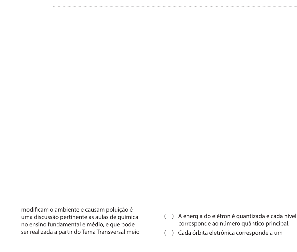 www.pciconcursos.com.br Página 6 Estado de Santa Catarina P25 Professor • Química 15. A obtenção do alumínio a partir dos minérios criolita (Na3AlF6) e bauxita (Al2O3•H2O) é realizada principalmente pela eletrólise, fundidos a 950,0°C, chamado de processo Hall, descoberto pelo cientista Charles Hall em 1886. A reação iônica total é a seguinte: 4Al+3(fund.) + 6O–2(fund.) + 3C(sólido, grafite) 4Al(liq.) + 3CO2(g). Admitindo-se que o rendimento seja 100,0%, calcule a massa de CO2 (g) liberada na atmosfera durante a produção de 1,0 tonelada (103 kg) de alumínio. a. ( ) 0,611×104 kg de CO2 (g). b. ( ) 6,11×105 kg de CO2 (g). c. ( X ) 1,22×103 kg de CO2 (g). d. ( ) 1,22×105 kg de CO2 (g). e. ( ) 2,11×106 kg de CO2 (g). 16. Identifique abaixo as afirmativas verdadeiras ( V ) e as falsas ( F ) em relação ao modelo atômico de Bohr: ( ) A energia do elétron é quantizada e cada nível corresponde ao número quântico principal. ( ) Cada órbita eletrônica corresponde a um estado estacionário de energia. ( ) O elétron emite energia ao passar de uma órbita mais interna para uma mais externa. ( ) O elétron gira em órbitas circulares em torno do núcleo. ( ) O elétron, no átomo, apresenta determinados valores de energia. Assinale a alternativa que indica a sequência correta, de cima para baixo. a. ( ) V • V • V • F • F b. ( X ) V • V • F • V • V c. ( ) V • F • F • F • V d. ( ) F • V • F • V • F e. ( ) F • F • V • V • V 13. A respeito do tratamento de Temas Transversais, é incorreto afirmar: a. ( ) Nos Parâmetros Curriculares Nacionais, não é a realidade social o eixo estruturador das dis- ciplinas, pois esta realidade seria tratada atra- vés do atravessamento da disciplina por meio de uma estratégia curricular denominada Temas Transversais. b. ( ) O conjunto de Temas Transversais inclui ética, pluralidade cultural, meio ambiente, saúde, trabalho e consumo e orientação sexual. Todos esses temas podem ser tratados em aulas de química no Ensino Médio. c. ( X ) Não é possível tratar do Tema Transversal ética em aulas de química, uma vez que este é um conteúdo típico de áreas das ciências huma- nas, como filosofia ou sociologia. d. ( ) Os Parâmetros Curriculares Nacionais tratam de questões urgentes como a violência, a saúde, o uso de recursos naturais e os precon- ceitos através dos Temas Transversais. e. ( ) Compreender como os processos de transfor- mação e a utilização dos materiais produzidos modificam o ambiente e causam poluição é uma discussão pertinente às aulas de química no ensino fundamental e médio, e que pode ser realizada a partir do Tema Transversal meio ambiente. 14. Para o armazenamento de informações genéticas e a sua transferência de uma geração de células para as próximas, existe uma estrutura molecular que é utilizada pela Natureza por milhões de anos até a pre- sente data. Esse processo permite que os seres vivos se reproduza através da organização e guarda dessas informações genéticas. Este tipo de substância recebe o nome de: a. ( ) fenil-alanina. b. ( ) ácido láctico. c. ( ) ácido de Arrhenius. d. ( ) ácido gama-aminobutírico. e. ( X ) ácido desoxirribonucleico. www.pciconcursos.com.br Página 7 Estado de Santa Catarina P25 Professor • Química 19. Identifique abaixo as afirmativas verdadeiras ( V ) e as falsas ( F ). ( ) O físico dinamarquês Niels Bohr sugeriu que o átomo possui energia quantizada e que cada elétron só pode ter determinada quantidade de energia, representado neste modelo pelos níveis de energia, comparável às órbitas dos planetas do Sistema Solar, onde cada elétron possui a sua própria órbita e com quantidades de energia determinadas. ( ) O cientista britânico John Dalton, por volta do ano de 1808, publicou a teoria sobre a maté- ria, conhecida como teoria atômica de Dalton, cujas principais conclusões foram que a maté- ria é formada por partículas extremamente pequenas chamadas átomos e que os átomos são esferas maciças e indivisíveis. ( ) “De acordo com a teoria atômica ou do ato- mismo, tudo o que existe é composto por elementos divisíveis chamados átomos”. Essa afirmação é atribuída a Demócrito de Abdera (400 a.C.), considerado o pai do atomismo grego. ( ) Em 1897, Joseph John Thomson apresentou a teoria segundo a qual a matéria contém par- tículas de massa muito menores que o átomo do hidrogênio. Ele apresentou um modelo de átomo como uma bolha de material gelati- noso com carga positiva e elétrons suspensos nela, como passas de pudim. Este modelo ficou conhecido como pudim de passas. Assinale a alternativa que indica a sequência correta, de cima para baixo. a. ( ) V • V • V • F b. ( X ) V • V • F • V c. ( ) F • V • F • V d. ( ) F • V • F • F e. ( ) F • F • V • V 17. Observe o gráfico e responda aos itens abaixo: A partir da observação do gráfico e admitindo-se que, para uma certa reação, tem-se no segmento AB o nível energético dos reagentes e no segmento EF o nível energético dos produtos, é correto afirmar: 1. A reação direta é exotérmica. 2. A variação de entalpia (energia) de reação direta é de ΔH = –400,00 kJ. 3. A energia de ativação desse processo é repre- sentada pelo segmento EF. 4. O perfil do gráfico permite afirmar que a reação direta representa uma reação de combustão. 5. A reação inversa é exotérmica. Assinale a alternativa que indica todas as afirmativas corretas. a. ( X ) São corretas apenas as afirmativas 1, 2 e 4. b. ( ) São corretas apenas as afirmativas 1, 2 e 5. c. ( ) São corretas apenas as afirmativas 2, 3 e 4. d. ( ) São corretas apenas as afirmativas 2, 4 e 5. e. ( ) São corretas apenas as afirmativas 3, 4 e 5. 18. Um suco de limão tem pH = 2,0 e um suco de laranja tem pH = 5,0. Calcule quantas vezes a concentração de H3O+ do suco de limão é maior do que o suco de laranja