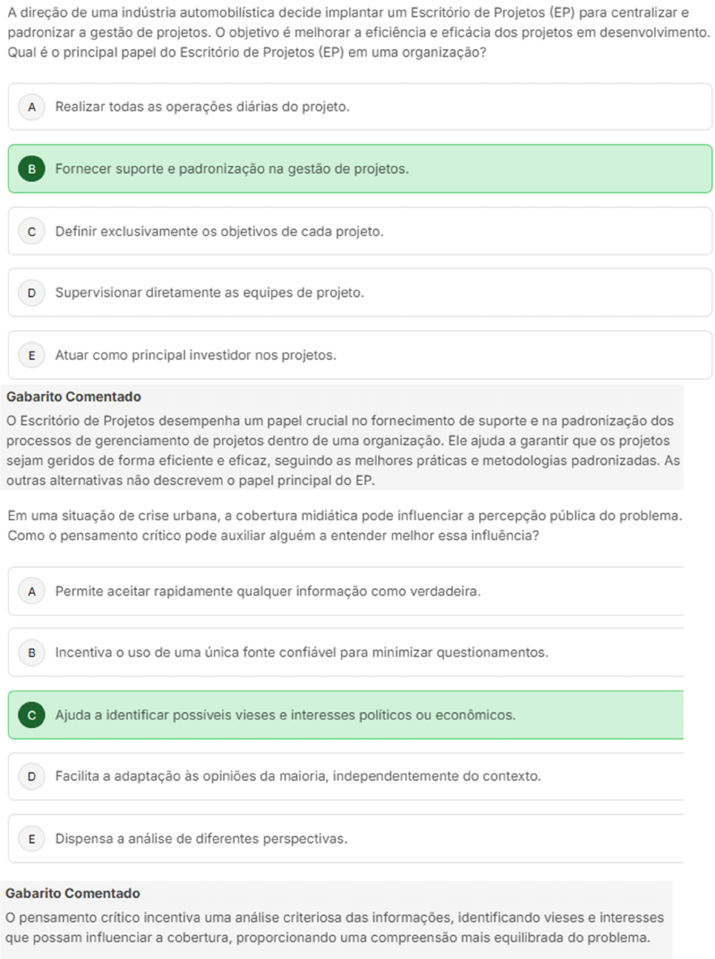 A direção de uma indústria decide implantar um Escritório de Projetos (EP) para centralizar e padronizar a gestão de projetos. objetivo é melhorar a eficiência e eficácia dos projetos em desenvolvimento. Qual é principal papel do Escritório de Projetos (EP) em uma organização? A Realizar todas as operações diárias do projeto. B Fornecer suporte e padronização na gestão de projetos. C Definir exclusivamente os objetivos de cada projeto. D Supervisionar diretamente as equipes de projeto. E Atuar como principal investidor nos projetos. Gabarito Comentado o Escritório de Projetos desempenha um papel crucial no fornecimento de suporte e na padronização dos processos de gerenciamento de projetos dentro de uma organização. Ele ajuda a garantir que os projetos sejam geridos de forma eficiente e eficaz, seguindo as melhores práticas e metodologias padronizadas. As outras alternativas não descrevem papel principal do EP. Em uma situação de crise urbana, a cobertura midiática pode influenciar a percepção pública do problema. Como pensamento crítico pode auxiliar alguém a entender melhor essa influência? A Permite aceitar rapidamente qualquer informação como verdadeira. B Incentiva uso de uma única fonte confiável para minimizar questionamentos. C Ajuda a identificar possíveis vieses e interesses políticos ou econômicos. D Facilita a adaptação às opiniões da maioria, independentemente do contexto. E Dispensa a análise de diferentes perspectivas. Gabarito Comentado o pensamento crítico incentiva uma análise criteriosa das informações, identificando vieses e interesses que possam influenciar a cobertura, proporcionando uma compreensão mais equilibrada do problema.Uma ONG ambiental está integrando gerenciamento de portfólios em sua estratégia de projetos. foco é alinhar os projetos às metas estratégicas da organização, garantindo que eles contribuam para os objetivos gerais. Qual é a importância do gerenciamento de portfólios em uma organização? A Executar individualmente cada projeto. B Garantir a qualidade técnica de cada projeto. C Alinhar projetos às metas estratégicas da organização. D Reduzir os custos de todos os projetos. E Aumentar a velocidade de entrega dos projetos. Gabarito Comentado o gerenciamento de portfólios é essencial para alinhar os projetos às metas estratégicas de uma organização. Ele permite que a organização priorize e gerencie seus projetos de forma que eles contribuam para os objetivos gerais, garantindo que os recursos sejam utilizados de maneira eficiente e eficaz. As outras alternativas não capturam a essência do gerenciamento de portfólios, que é alinhamento estratégico e não apenas a execução operacional ou a gestão de custos. Durante uma negociação em um ambiente de competição esportiva universitária, você enfrenta uma atmosfera Qual é uma estratégia lógica e colaborativa para promover um ambiente de respeito? A Ignorar as demandas do outro time e focar apenas nos interesses do seu grupo. B Incentivar atitudes competitivas e evitar qualquer tipo de consenso. C Promover um acordo que valorize tanto os objetivos do seu time quanto ambiente geral do evento. D Focar exclusivamente na vitória, independentemente do clima do evento. E Aplicar regras para forçar comportamento de todos os envolvidos. Gabarito Comentado Uma estratégia lógica e colaborativa busca equilibrar os interesses do próprio time com respeito ao ambiente do evento, promovendo uma competição saudável e construtiva para todos os envolvidos.Escritório de Gerenciamento de Projetos é uma unidade organizacional especializada em melhorar a prática de gerenciamento de projetos dentro de uma empresa ou organização. Quais são os três tipos de EGP baseados no grau de controle e influência dos projetos na organização? A Consultivo, Estratégico e Operacional B Básico, Avançado e Expert C Suporte, Controle e Diretivo D Funcional, Matricial e Projetizado E Pleno, Senior e Junior Gabarito Comentado Os tipos de EGP variam de acordo com o grau de controle e influência dos projetos na organização, e esses tipos são: Suporte, Controle e Diretivo. Uma empresa de tecnologia está implementando PMBOK para melhorar a gestão de seus projetos. Eles estão particularmente interessados em aprimorar a estrutura organizacional para apoiar melhor os projetos. A liderança busca compreender melhor impacto das estruturas organizacionais nos projetos. Qual é a principal influência da estrutura organizacional em projetos segundo PMBOK? A Determina os recursos tecnológicos disponíveis. B Estabelece cronograma do projeto. C Influencia a alocação de recursos. D Define os objetivos estratégicos do projeto. E Limita a comunicação entre as equipes. Gabarito Comentado A estrutura organizacional tem um papel crucial na alocação de recursos em projetos. Dependendo de como a organização é estruturada, pode haver mais ou menos flexibilidade e eficiência na distribuição de recursos (humanos, financeiros, materiais) para os projetos. As outras opções, embora relacionadas à gestão de projetos, não são influenciadas diretamente pela estrutura organizacional.Em uma consultoria de marketing, a gestão de projetos tem se mostrado desafiadora devido à natureza única de cada campanha. A equipe busca entender como a singularidade dos projetos impacta gerenciamento. De acordo com PMBOK, como a singularidade dos projetos influencia gerenciamento dos mesmos? A Exige uma abordagem de gestão mais flexível. B Necessita de um orçamento maior do que projetos rotineiros. C Requer menor supervisão da liderança. D Implica em uma duração mais longa do projeto. E Reduz a necessidade de comunicação com os stakeholders. Gabarito Comentado A singularidade dos projetos, especialmente em ambientes como consultorias de marketing, exige uma abordagem de gestão mais flexível. Cada projeto é diferente e pode demandar estratégia