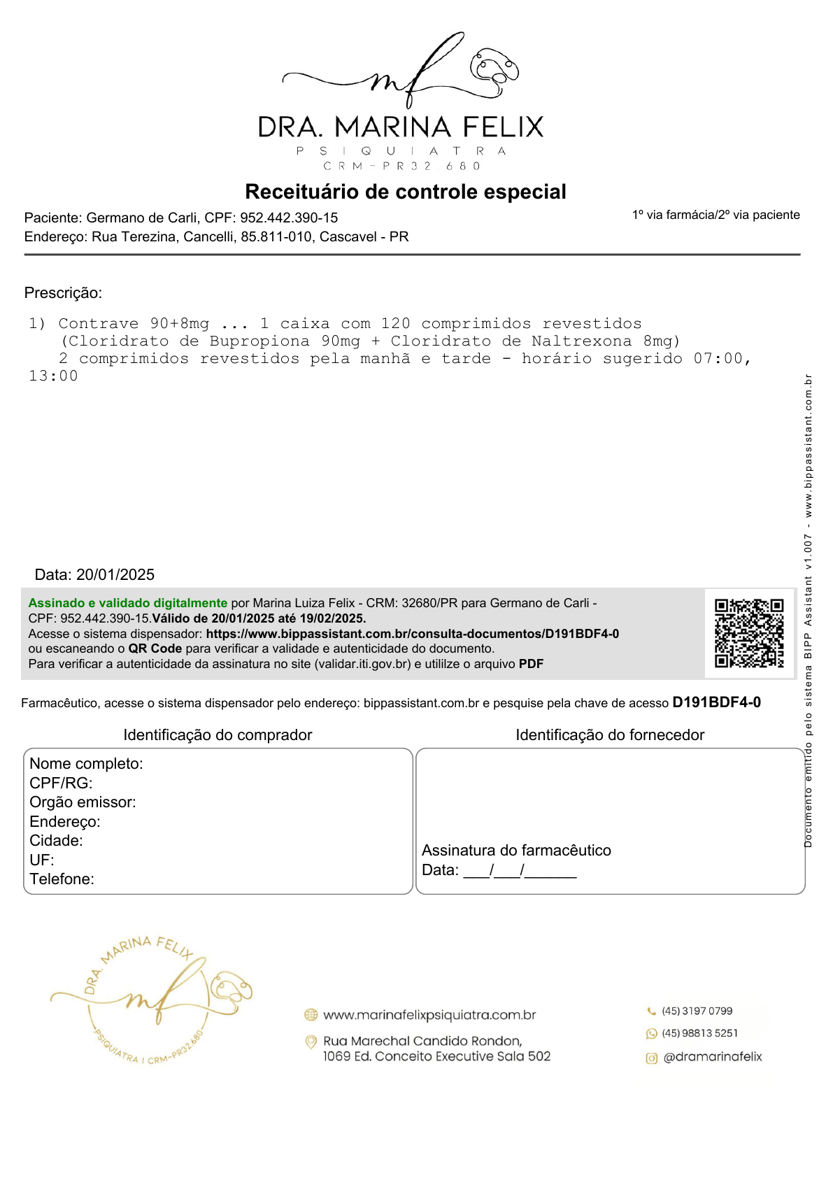 Receituário de controle especial Paciente: Germano de Carli, CPF: 952.442.390-15 Endereço: Rua Terezina, Cancelli, 85.811-010, Cascavel - PR Prescrição: 1) Contrave 90+8mg ... 1 caixa com 120 comprimidos revestidos (Cloridrato de Bupropiona 90mg + Cloridrato de Naltrexona 8mg) 2 comprimidos revestidos pela manhã e tarde - horário sugerido 07:00, 13:00 Data: 20/01/2025 1º via farmácia/2º via paciente Assinado e validado digitalmente por Marina Luiza Felix - CRM: 32680/PR para Germano de Carli - CPF: 952.442.390-15.Válido de 20/01/2025 até 19/02/2025. Acesse o sistema dispensador: https://www.bippassistant.com.br/consulta-documentos/D191BDF4-0 ou escaneando o QR Code para verificar a validade e autenticidade do documento. Para verificar a autenticidade da assinatura no site (validar.iti.gov.br) e utililze o arquivo PDF Farmacêutico, acesse o sistema dispensador pelo endereço: bippassistant.com.br e pesquise pela chave de acesso D191BDF4-0 Identificação do comprador Identificação do fornecedor Nome completo: CPF/RG: Orgão emissor: Endereço: Cidade: UF: Telefone: Assinatura do farmacêutico Data: ___/___/______ D o c u m e n to e m it id o p e lo s is te m a B IP P A s s is ta n t v 1 .0 0 7 - w w w .b ip p a s s is ta n t. c o m .b r Receituário de controle especial Paciente: Germano de Carli, CPF: 952.442.390-15 Endereço: Rua Terezina, Cancelli, 85.811-010, Cascavel - PR Prescrição: 1) Vurtuoso 15mg ... 1 caixa com 60 comprimidos revestidos 1 comprimido revestido à noite - horário sugerido 21:00 Data: 20/01/2025 1º via farmácia/2º via paciente Assinado e validado digitalmente por Marina Luiza Felix - CRM: 32680/PR para Germano de Carli - CPF: 952.442.390-15.Válido de 20/01/2025 até 19/02/2025. Acesse o sistema dispensador: https://www.bippassistant.com.br/consulta-documentos/D191BDF4-0 ou escaneando o QR Code para verificar a validade e autenticidade do documento. Para verificar a autenticidade da assinatura no site (validar.iti.gov.br) e utililze o arquivo PDF Farmacêutico, acesse o sistema dispensador pelo endereço: bippassistant.com.br e pesquise pela chave de acesso D191BDF4-0 Identificação do comprador Identificação do fornecedor Nome completo: CPF/RG: Orgão emissor: Endereço: Cidade: UF: Telefone: Assinatura do farmacêutico Data: ___/___/______ D o c u m e n to e m it id o p e lo s is te m a B IP P A s s is ta n t v 1 .0 0 7 - w w w .b ip p a s s is ta n t. c o m .b r Receituário de controle especial Paciente: Germano de Carli, CPF: 952.442.390-15 Endereço: Rua Terezina, Cancelli, 85.811-010, Cascavel - PR Prescrição: 1) Contrave 90+8mg ... 1 caixa com 120 comprimidos revestidos (Cloridrato de Bupropiona 90mg + Cloridrato de Naltrexona 8mg) 2 comprimidos revestidos pela manhã e tarde - horário sugerido 07:00, 13:00 Data: 19/02/2025 1º via farmácia/2º via paciente Assinado e validado digitalmente por Marina Luiza Felix - CRM: 32680/PR para Germano de Carli - CPF: 952.442.390-15.Válido de 19/02/2025 até 21/03/2025. Acesse o sistema dispensador: https://www.bippassistant.com.br/consulta-documentos/D191BDF4-1 ou escaneando o QR Code para verificar a validade e autenticidade do documento. Para verificar a autenticidade da assinatura no site (validar.iti.gov.br) e utililze o arquivo PDF Farmacêutico, acesse o sistema dispensador pelo endereço: bippassistant.com.br e pesquise pela chave de acesso D191BDF4-1 Identificação do comprador Identificação do fornecedor Nome completo: CPF/RG: Orgão emissor: Endereço: Cidade: UF: Telefone: Assinatura do farmacêutico Data: ___/___/______ D o c u m e n to e m it id o p e lo s is te m a B IP P A s s is ta n t v 1 .0 0 7 - w w w .b ip p a s s is ta n t. c o m .b r Receituário de controle especial Paciente: Germano de Carli, CPF: 952.442.390-15 Endereço: Rua Terezina, Cancelli, 85.811-010, Cascavel - PR Prescrição: 1) Vurtuoso 15mg ... 1 caixa com 60 comprimidos revestidos 1 comprimido revestido à noite - horário sugerido 21:00 Data: 19/02/2025 1º via farmácia/2º via paciente Assinado e validado digitalmente por Marina Luiza Felix - CRM: 32680/PR para Germano de Carli - CPF: 952.442.390-15.Válido de 19/02/2025 até 21/03/2025. Acesse o sistema dispensador: https://www.bippassistant.com.br/consulta-documentos/D191BDF4-1 ou escaneando o QR Code para verificar a validade e autenticidade do documento. Para verificar a autenticidade da assinatura no site (validar.iti.gov.br) e utililze o arquivo PDF Farmacêutico, acesse o sistema dispensador pelo endereço: bippassistant.com.br e pesquise pela chave de acesso D191BDF4-1 Identificação do comprador Identificação do fornecedor Nome completo: CPF/RG: Orgão emissor: Endereço: Cidade: UF: Telefone: Assinatura do farmacêutico Data: ___/___/______ D o c u m e n to e m it id o p e lo s is te m a B IP P A s s is ta n t v 1 .0 0 7 - w w w .b ip p a s s is ta n t. c o m .b r Powered by TCPDF (www.tcpdf.org) http://www.tcpdf.org 2_16_76_1_12_1_1: 03_Nome Completo Emitente: Marina Luiza Felix 2_16_76_1_4_2_2_1: 32680 2_16_76_1_4_2_2_2: PR 2_16_76_1_4_2_2_3: 23698 2025-01-20T12:17:46-0300