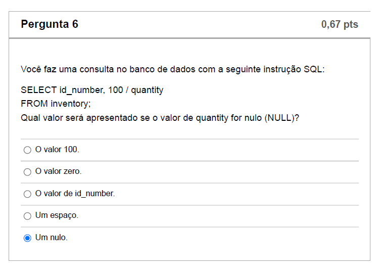 Pergunta 6 0,67 pts Você faz uma consulta no banco de dados com a seguinte instrução SQL: SELECT id_number, 100 / quantity FROM inventory; Qual valor será apresentado se O valor de quantity for nulo (NULL)? valor 100. o valor zero. o valor de id_number. Um espaço. Um nulo.