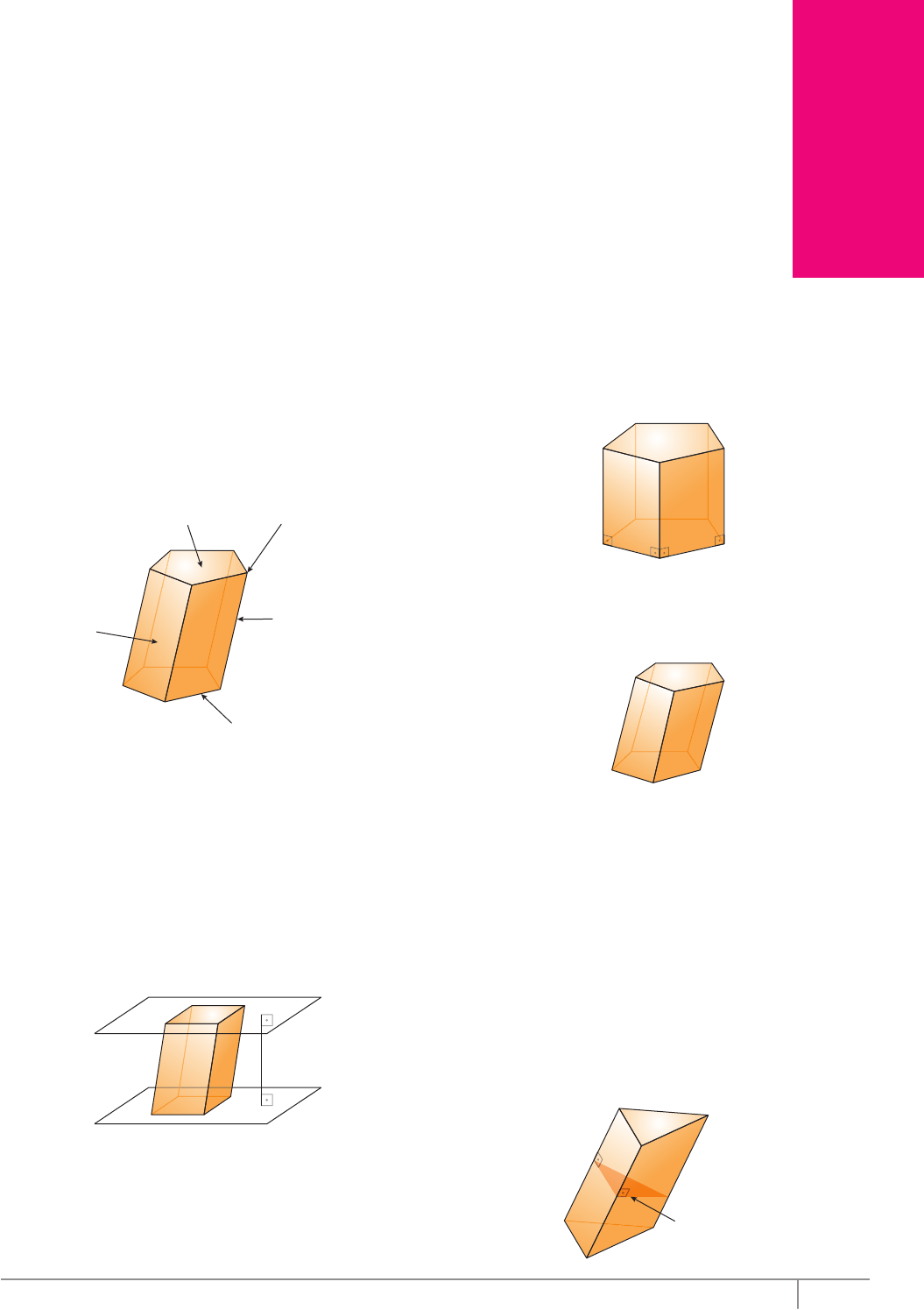 FRENTE 13Editora Bernoulli MÓDULOMATEMÁTICA DEFINIÇÃO Prisma é todo poliedro convexo construído tomando-se dois polígonos congruentes situados em planos paralelos e unindo-se os pontos desses polígonos através de segmentos paralelos. Na figura a seguir, temos um prisma cujas bases são os pentágonos congruentes ABCDE e FGHIJ. Os paralelogramos que unem as duas bases do prisma são denominados faces laterais. Base A B C DE F G H IJ Aresta lateral Aresta da base Face lateral Vértice Podemos, então, identificar no prisma mostrado os seguintes elementos: i) Bases: faces ABCDE e FGHIJ ii) Arestas da base: (AB, BC, CD, DE, EA) e (FG, GH, HI, IJ, JF) iii) Faces laterais: paralelogramos BCHG, CDIH, DEJI, EAFJ, ABGF iv) Arestas laterais: CH, DI, EJ, AF, BG A altura de um prisma é a distância h entre os planos das bases. h α NOMENCLATURA Um prisma será chamado triangular, quadrangular, pentagonal, etc., conforme sua base seja um triângulo, um quadrilátero, um pentágono, etc. CLASSIFICAÇÃO Prisma reto é aquele cujas arestas laterais são perpendiculares aos planos das bases. Num prisma reto, as faces laterais são retângulos. Prisma pentagonal reto Prisma oblíquo é aquele cujas arestas são oblíquas aos planos das bases. Prisma pentagonal oblíquo Prisma regular é um prisma reto cujas bases são polígonos regulares. SECÇÕES Secção de um prisma é a interseção do prisma com um plano que intercepta todas as arestas laterais. Notemos que a secção de um prisma é um polígono com vértice em cada aresta lateral. Secção reta ou secção normal é uma secção cujo plano é perpendicular às arestas laterais. Secção reta Prismas 07 B 14 Coleção Estudo Secção transversal é uma secção cujo plano é paralelo às bases. Secção transversal ÁREAS Área lateral (A l ) é a soma das áreas das faces laterais. Área total é a soma da área lateral com as áreas das bases. AT = A l + 2.AB VOLUME O volume de um prisma é o produto da área da base pela medida da altura. V = AB.h Pode-se demonstrar também que o volume de um prisma é o produto da área da secção reta pela medida da aresta. V = S.a S a h PARALELEPÍPEDOS Paralelepípedo é um prisma cujas bases são paralelogramos. A superfície total de um paralelepípedo é a reunião de seis paralelogramos. Paralelepípedo (oblíquo) Paralelepípedo reto é um prisma reto cujas bases são paralelogramos. A superfície total de um paralelepípedo reto é a reunião de quatro retângulos (faces laterais) e de dois paralelogramos (bases). Paralelogramo Paralelepípedo (reto) Retângulo Paralelepípedo reto retângulo ou paralelepípedo retângulo, ou ortoedro, é um prisma reto cujas bases são retângulos. A superfície total de um paralelepípedo retângulo é a reunião de seis retângulos. A’ D’ C’ BA A base (face) D B C f d ca b B D D’ f a b B’ C D f ad c c A) Cálculo da diagonal d No triângulo BCD, temos f2 = a2 + b2. No triângulo BDD’, temos d2 = f 2 + c2 ⇒ d2 = a2 + b2 + c2 ⇒ d = ¹a2 + b2 + c2 B) Cálculo da área total S A área total do paralelepípedo é a soma das áreas de seis retângulos: dois deles (ABCD, A’B’C’D’) com dimensões a e b, outros dois (ABB’A’, DCC’D’) com dimensões a e c e os últimos dois (ADD’A’, BCC’B’) com dimensões b e c. Logo: S = 2ab + 2ac + 2bc ⇒ S = 2(ab + ac + bc) C) Cálculo do volume V O volume de um prisma, como sabemos, é o produto da área da base pela altura, ou seja, V = AB.h. Assim, para o paralelepípedo retângulo, temos: AB = a.b e h = c Então: V = a.b.c Frente B Módulo 07 M A TE M Á TI C A 15Editora Bernoulli CUBO Cubo é um paralelepípedo retângulo cujas arestas são congruentes. A’ B’ D’ D’ C’ C BA D D base (face) C A B D f d aa a B f f a a a a d a Dado um cubo de aresta a, calculemos sua diagonal d, sua área total S e seu volume V. A) Cálculo da diagonal d Inicialmente, calculemos a medida f de uma diagonal de face. No triângulo BAD, temos f2 = a2 + a2 ⇒ f2 = 2a2 ⇒ f = a¹2. No triângulo BDD’, temos d2 = a2 + f2 ⇒ d2 = a2 + 2a2 ⇒ d2 = 3a2 ⇒ d = a¹3 B) Cálculo da área total S A superfície total de um cubo é a reunião de seis quadrados congruentes de lado a. A área de cada um é a2. Então, a área total do cubo é: a a a S = 6a2 C) Cálculo do volume V No cubo de aresta a, temos: AB = a.a e h = a Então: V = a3 EXERCÍCIOS DE FIXAÇÃO 01. (UFRGS–2006) Na figura a seguir, está representada a planificação de um prisma hexagonal regular de altura igual à aresta da base. Se a altura do prisma é 2, seu volume é A) 4¹3 D) 10¹3 B) 6¹3 E) 12¹3 C) 8¹3 02. (UFOP-MG–2009) Maíra adora brincar na piscina da casa de Jean. A piscina tem 3 m de largura por 4 m de comprimento. A parte rasa tem 0,5 m de profundidade, e a parte funda, 1 m de profundidade. O piso da piscina é o usual: uma rampa plana. A quantidade de litros de água necessária para enchê-la é A) 6 000 C) 9 000 B) 8 000 D) 10 000 03. (FUVEST-SP–2007) O cubo de vértices ABCDEFGH, indicado na figura, tem arestas de comprimento a. H G C E F D M A B Sabendo-se que M é o ponto médio da aresta AE, então a distância do ponto M ao centro do quadrado ABCD é igual a A) a 3 5 D) a¹3 B) a 3 3 E) 2a¹3 C) a 3 2 04. (UFMG) Um reservatório cúbico de 50 cm de profundidade está com água até a metade e precisa ser totalmente esvaziado. O volume de água a ser retirado desse reservatório é de A) 62,5 litros. C) 250 litros. B) 125 litros. D) 25 litros. Prismas