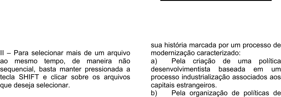 4 Selecionar a linha a ser travada, clicar no menu Janela e em seguida "Congelar". III. Não é possível usar essa função no BrOffice por ele ser inferior ao Microsoft Excel. a) Apenas a assertiva I está correta. b) Apenas a assertiva II está correta. c) Apenas a assertiva III está correta. d) As assertivas I e II estão corretas. e) As assertivas I e III estão corretas. 19. No sistema operacional Windows, considerando as afirmações abaixo: I - Para excluir um arquivo definitivamente, ou seja, sem que ele seja enviado para a lixeira, basta clicar sobre o mesmo, manter pressionada a tela SHIFT e pressionar a tecla DELETE, em seguida, na caixa de diálogo que surge, clicar no botão SIM. II – Para selecionar mais de um arquivo ao mesmo tempo, de maneira não sequencial, basta manter pressionada a tecla SHIFT e clicar sobre os arquivos que deseja selecionar. III – No Windows Explorer, para ver informações sobre os arquivos e pastas como data de modificação e tamanho do arquivo, basta clicar na opção Exibir -> Lista na barra de menu. Assinale a alternativa correta: a) I, II e III estão corretas. b) I, II e III estão incorretas. c) I e II estão corretas. d) I somente está correta. e) II e III estão corretas. 20. No sistema operacional Windows, considerando as afirmações abaixo sobre teclas de atalho: I – CTRL+C e CTRL+V permite mover um arquivo de uma pasta para outra. II – A tecla de atalho Windows + D permite minimizar todas as janelas abertas. III – A tecla de atalho Windows + E permite abrir o aplicativo Windows Explorer. Assinale a alternativa correta: a) I, II e III estão corretas. b) I, II e III estão incorretas. c) I e II estão corretas. d) I somente está correta. e) II e III estão corretas. CONHECIMENTOS ESPECÍFICOS 21. “A partir da 2ª Guerra Mundial e até 1960, o Brasil, a exemplo de outros países do denominado ‘Cone Sul” teve sua história marcada por um processo de modernização caracterizado: a) Pela criação de uma política desenvolvimentista baseada em um processo industrialização associados aos capitais estrangeiros. b) Pela organização de políticas de moldes socialistas que ocasionaram a fuga de capitais estrangeiros. c) Pela elaboração de uma política populista, caracterizada por intensa reforma agrária. d) Pelo surgimento de governos militares de regime ditatorial instalado para frear a expansão de movimento socialista. e) Pela preservação de uma política oligárquica e de caráter nacionalista. 22. Entre as diversas medidas adotadas pelos reis europeus para promover o fortalecimento do Estado Moderno, encontramos um conjunto de diferentes práticas econômicas conhecidas como Mercantilismo: Assinale a alternativa que contem os elementos básicos da Economia Colonial Brasileira: www.pciconcursos.com.br 5 a) Possibilitou a comercialização dos produtos coloniais brasileiros do mercantilismo. b) Foi base para o balanço e o desenvolvimento das índias com sede em Amsterdã. c) Intervencionismo livre concorrência e lei da oferta e da procura. d) Enquadra-se nos interesses comerciais europeus que geraram a colonização. e) Estimulou o livre protecionismo da produção de cana na Europa. 23. Tancredo Neves foi eleito Presidente da Republica em janeiro de 1985. a respeito desta Transição Democrática, é correto afirmar: a) O governo de Tancredo Neves foi marcado por uma grande instabilidade política que levou a renúncia do presidente e à posse do seu vice, José Sarney. b) Em torno de Tancredo Neves formou- se a aliança democrática, que reunia José Sarney e Paulo Maluf. c) Apensar de vitorioso nas eleições indiretas, Tancredo Neves foi impedido de assumir o governo pelas Forças Armadas. d) Tancredo Neves foi eleito presidente da Republica de forma indireta pelo Colégio Eleitoral. e) A candidatura de Tancredo Neves foi tranqüila sem a participação de nenhum movimento. 24. No decorrer da Republica Velha a política de valorização do café, atendia aos interesses dos cafeicultores. Para tanto utilizava os seguintes instrumentos: a) O controle dos estoques excedentes e manipulação da taxa cambial. b) Investimento na produção e desvalorização cambial. c) Compra e queima do excedente produzido e desvalorização cambial. d) Compra e queima do excedente produzido e investimentos na produção. e) Financiamentos para modernização tecnológica e investimento na produção. 25. Assinalar qual conflito internacional que ocorreu na segunda metade do século XIX na Região do Prata. a) Guerra dos Farrapos que representou um movimento separatista no sul do Brasil b) Guerra do Paraguai provocada pelas disputas do controle da Bacia Platina c) Revolução Farroupilha, movimento inspirado no projeto federalista de Solano Lopes d) Guerra do Paraguai, provocada com a pretensão de controlar as atividades agropecuárias na região e) Guerra dos farrapos, que lutavam pelo fluxo de matéria prima que entrava no Brasil 26. A respeito da abolição da escravidão no Brasil é CORRETO afirmar que: a) Ocorreu fundamentalmente devido às pressões inglesas que obrigaram as autoridades brasileiras a extinguir a escravidão b) Ocorreu de maneira gradual, vinculada à política de promoção da cidadania dos abolicionistas na segunda metade do século XIX c) Ocorreu fundamentalmente devido à crise demográfica do continente africano d) Ocorreu com a chegada da imigração européia onde os cafeicultores encontraram uma forma de substituição da mão-de-obra escrava e) Ocorreu devido à força com que as idéias ilustradas foram incorporadas pelas elites brasileiras à época da independência 27. “Os escravos são as mãos e os pés do senhor de engenho, porque sem eles não é possível fazer, conservar e aumentar fazenda, nem ter engenho corrente” ANTONIL, Cultura e opulência do Brasil - Belo Horizonte: Itatiaia. 1982.p.89. www.pciconcursos.com.br