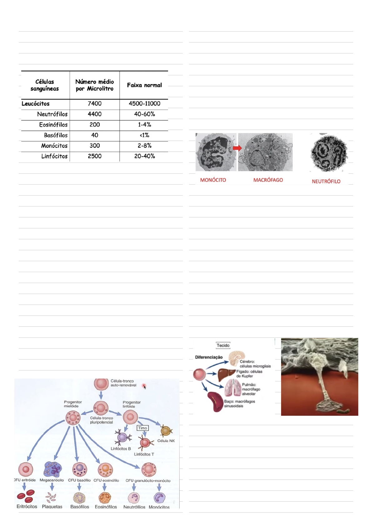 Celulas do sistema imune As células do sistema imune são encontradas no sangue ou na linfa como células circulantes. São encontradas como aglomerados anatomicamente nos órgãos linfoides ou espalhadas nos tecidos. Essa organização capacita essa células para atuarem no sistema imune. Os leucócitos são chamados de células brancas. São classificados de acordo com a morfologia do núcleo ou pela presença de grânulos. Neutrófilos, eosinófilos e basófilos possuem grânulos citoplasmáticos e por isso são chamados de granulócitos. Os monócitos e linfócitos são chamadas de células mononucleares, pois possuem pouca variabilidade na morfologia do núcleo e não possuem muitos grânulos no citoplasma. Neutrófilos são células disponíveis para responder células que invadem tecidos. As células de menor proporção são os basófilos. Essas células possuem uma origem embriológica comum de uma célula tronco auto-renovável e ela pela ação de citocinas interage com o progenitor mielóide ou com o progenitor linfóide. Como descendentes do progenitor mielóide encontram-se as células granulócitas, como basófilo, eusinófilo e neutrófilo e as células mononucleares, como os monócitos. O progenitor linfoide se diferencia no linfócito B, T e na célula NK. Os linfócitos B e T são as únicas células que possuem receptores específicos para antígenos. E a expressão para esse receptor nos linfócitos T dependem da migração deles pelo Timo, que é o local onde eles expressam esse receptor. As células NK tem uma forma de reconhecimento que não envolve reçeptores específicos e elas possuem receptores de inibição e ativação. Fagocitos Essas células são efetoras da imunidade inata, elas são divididas em neutrófilos e macrófagos. Os macrófagos são derivados dos monócito sanguíneo e são células teciduais. Os neutrófilos apresentam a maior concentração na corrente sanguínea, são 55% dos leucócitos circulantes. Essas células apresentam os NETs, que são armadilhas extracelulares do neutrófilo, que fazem a extrusão do conteúdo nuclear, como DNA e histonas, que se ligam à lisozima, elastase e defensinas para aprisionar os micro-organismos e fazer a eliminação deles. Neste processo o neutrófilo morre para proteger o organismo. Macrofagos Eles fazem a fagocitose e a eliminação de micro-organismos. Removem tecidos danificados, incluindo células apoptóticas. Produzem citocinas que promovem e regulam as respostas imunes. Reparo do tecido lesionado. • angiogênese: formação de novos vasos sanguíneos. • Fibrose: síntese de matriz extracelular rica em colágeno. É uma célula apresentadora de antígeno, principalmente na fase efetora das respostas imunes mediadas por células T. Eles adquirem nomes específicos de acordo com o tecido de atuação, exemplos: • cérebro: células microgliais. • Fígado: células de Kupfer. • Pulmão: macrófago alveolar. • Baço: macrófagos sinusoidais. Neutrofilos Realizam fagocitose. Possuem grânulos que são constituídos por lisozimas, colagenose e elastase. Produzem defensinas e catelicidinas que são importantes na morte de micro-organismos. São fundamentais em infecções sistêmicas. Causam injúria tissular em tecidos sadios quando existe uma inflamação crônica e muitas vezes são visíveis em patógenos de difícil eliminação ou doenças autoimunes. Mecanismos da imunidade inata A imunidade inata utiliza alguns mecanismos para enfrentar uma infecção, dentre eles estão: • Inflamação. • Defesa antiviral. • Estimulação da imunidade adaptativa. Inflamacao É um evento de vasos sanguíneos que causa vermelhão, edema, calor e dor. Esses fatores são consequências do fluxo sanguíneo alterado, causado pela vasodilatação (vermelhidão), por causa da permeabilidade vascular aumentada de capilares e vênulas (edema- pois há extravasamento do plasma para o tecido) e pela compressão das terminações nervosas que levam a dor. No processo inflamatório ocorre a microcirulação, a qual é formada por capilares, vênulas, arteríolas e vasos linfáticos. Nas arteríolas, o plasma é filtrado na altura do capilar que faz um gotejamento constante do plasma nos tecidos. O excesso de líquido é absorvido pela vênula e parte é coletado para os vasos linfáticos. Os capilares linfáticos absorvem água e solutos filtrados do plasma a partir de espaços entre as células. Objetivos da inflamacao • Recrutar células: neutrófilos chegam primeiro ao local e depois os macrófagos se acumulam (são derivados dos monócitos sanguíneos). • Acumular proteínas plasmáticas e fluídos do sangue no sítio de infecção (neste fluido há proteínas de complemento, de fase aguda, colectinas e proteína C reativa) e anticorpos. Beneficios da inflamacao • Limitação da propagação do patógeno. • Sobrevivência, recuperação e reparo do tecido. Células sentinelas presentes no tecido, com a invasão dos microorganismos, ativam as células dendríticas e os macrófagos por possuírem os receptores de reconhecimento de padrão. Essas células ativam NFK-beta, que passa a produzir citocinas. As citocinas inflamatórias IL-1, TNF e IL-6 irão produzir vasodilatação e o aumento da permeabilidade muscular na altura da microcirculação (promoção da passagem de células sanguíneas para o tecido). • IL-8 recruta, principalmente, os neutrófilos. • IL-6 promove a vasodilatação e atua no fígado para produzir as proteínas de fase aguda, pois estão envolvidas com ativação do complemento e com a opsonização, favorecendo a eliminação pelos fagócitos. • IL-12 auxilia ativa do a célula NK que irá produzir o interferon- gama, o qual irá ativar o macrófago-> aumento da fagocitose e eliminação destas células. No processo de vasodilatação e aumento da permeabilidade vascular, as proteínas do sistema de complemento extravasam do plasma para o tecido. No tecido, são ess