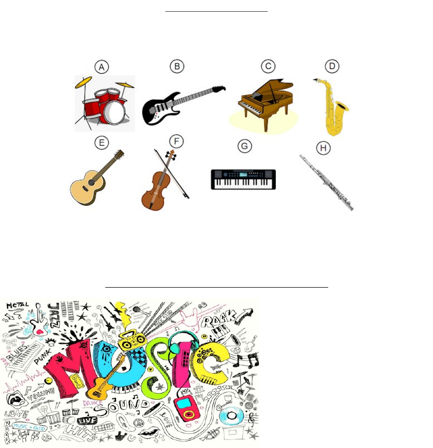 Atividade de inglês Os musical instruments abaixo estão presentes nos estilos musicais mencionados no texto acima. Relacione as figuras com o nome de cada Instrumento em inglês. Keyboard: __________ Piano: _____________ Guitar: _____________ Drums: ____________ Flute: _________________ Electric guitar: __________ Violin: _________________ Saxophone: ____________ "MUSIC MAKES THE PEOPLE COME TOGETHER..." Nesta atividade vamos abordar um tema muito especial e que, com certeza, todo mundo gosta: MUSIC. Vamos conhecer alguns estilos musicais em inglês? So... What kind of music do you like? Rock, Blues, Jazz, Samba, Funk, Reggae Country, Rap, Heavy Metal, Electronic, Pop, Latin Folk, Classical, Opera, Hard Rock, funk, forró dance. 1) Você consegue identificar quais tipos de música são bastante comuns no nosso país? Cite alguns deles: __________________________________________________________________________ 2) Escolha no mínimo sete tipos de músicas e indique uma banda, um grupo, um(a) cantor(a) ou uma dupla, apresentando suas preferências musicais: Exemplo: Rap - JAY Z __________________________________________________________________________ 3) Pesquise dez instrumentos e traduza para o inglês: image1.png image2.png
