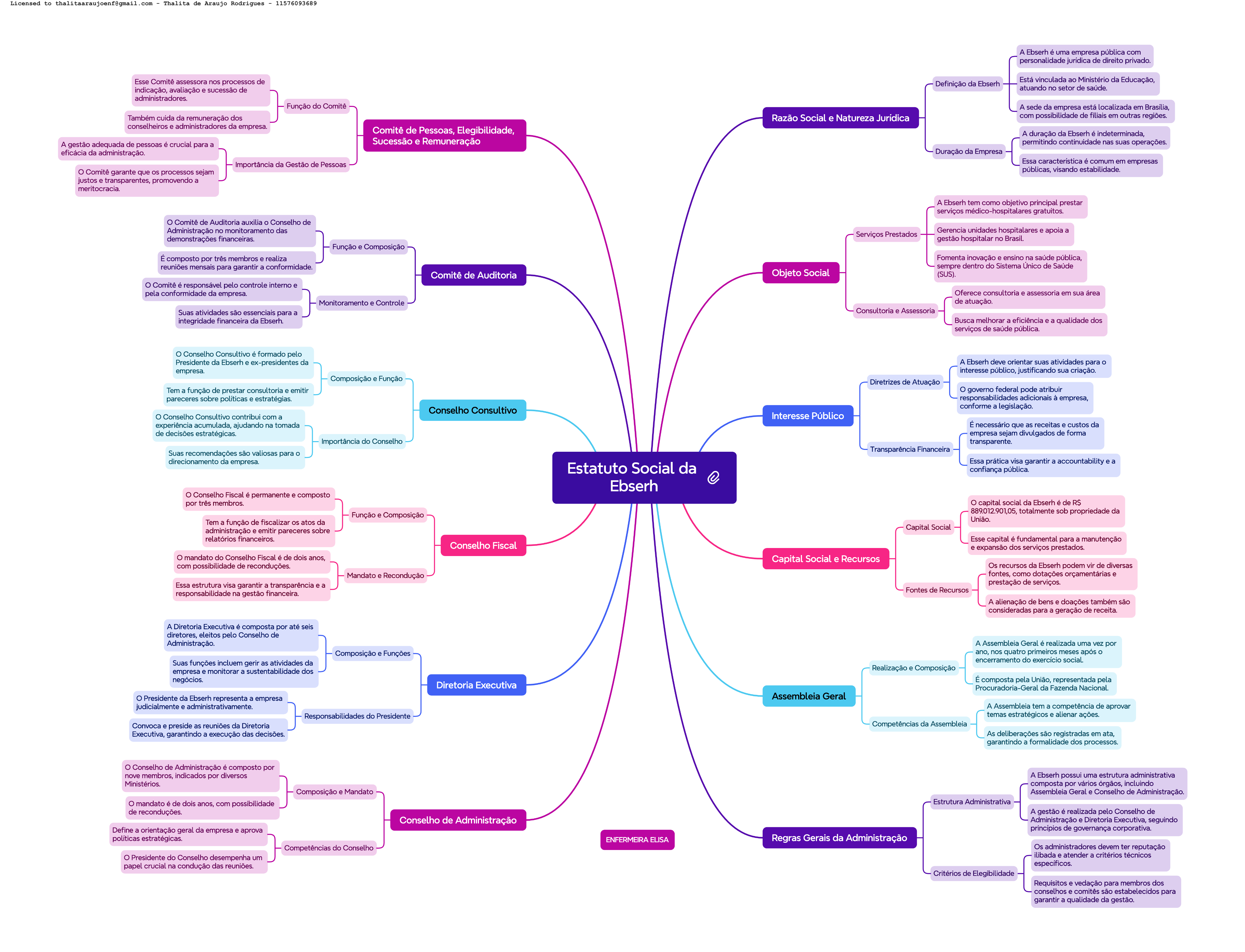 Estatuto Social da Ebserh � Razão Social e Natureza Jurídica Definição da Ebserh A Ebserh é uma empresa pública com personalidade jurídica de direito priva- do. Está vinculada ao Ministério da Educação, atuando no setor de saúde. A sede da empresa está localizada em Brasília, com possibilidade de filiais em outras regiões. Duração da Empresa A duração da Ebserh é indeterminada, permitindo continuidade nas suas oper- ações. Essa característica é comum em empresas públicas, visando estabilidade. Objeto Social Serviços Prestados A Ebserh tem como objetivo principal prestar serviços médico-hospitalares gratuitos. Gerencia unidades hospitalares e apoia a gestão hospitalar no Brasil. Fomenta inovação e ensino na saúde pública, sempre dentro do Sistema Único de Saúde (SUS). Consultoria e Assessoria Oferece consultoria e assessoria em sua área de atuação. Busca melhorar a eficiência e a qualidade dos serviços de saúde pública. Interesse Público Diretrizes de Atuação A Ebserh deve orientar suas atividades para o interesse público, justificando sua criação. O governo federal pode atribuir responsabilidades adicionais à em- presa, conforme a legislação. Transparência Financeira É necessário que as receitas e custos da empresa sejam divulgados de forma transparente. Essa prática visa garantir a accountability e a confiança pública. Capital Social e Recursos Capital Social O capital social da Ebserh é de R$ 889.012.901,05, totalmente sob propriedade da União. Esse capital é fundamental para a manutenção e expansão dos serviços prestados. Fontes de Recursos Os recursos da Ebserh podem vir de diversas fontes, como dotações orçamentárias e prestação de serviços. A alienação de bens e doações também são consideradas para a geração de receita. Assembleia Geral Realização e Composição A Assembleia Geral é realizada uma vez por ano, nos quatro primeiros meses após o encerramento do exercício social. É composta pela União, representada pela Procuradoria-Geral da Fazenda Nacional. Competências da Assembleia A Assembleia tem a competência de aprovar temas estratégicos e alienar ações. As deliberações são registradas em ata, garantindo a formalidade dos proces- sos. Regras Gerais da Administração Estrutura Administrati… A Ebserh possui uma estrutura administrativa composta por vários órgãos, incluindo Assembleia Geral e Conselho de Adminis- tração. A gestão é realizada pelo Conselho de Administração e Diretoria Executiva, seguin- do princípios de governança corporativa. Critérios de Elegibilidade Os administradores devem ter rep- utação ilibada e atender a critérios técnicos específicos. Requisitos e vedação para membros dos conselhos e comitês são estabelecidos para garantir a qualidade da gestão. Conselho de Administração Composição e Mandato O Conselho de Administração é composto por nove membros, indicados por diversos Ministérios. O mandato é de dois anos, com possibilidade de reconduções. Competências do Conselho Define a orientação geral da empresa e aprova políticas estratégicas. O Presidente do Conselho desempenha um papel crucial na condução das reuniões. Diretoria Executiva Composição e Funções A Diretoria Executiva é composta por até seis diretores, eleitos pelo Conselho de Administração. Suas funções incluem gerir as atividades da empresa e monitorar a sustentabilidade dos negócios. Responsabilidades do Presi… O Presidente da Ebserh representa a em- presa judicialmente e administrativamente. Convoca e preside as reuniões da Diretoria Executiva, garantindo a execução das decisões. Conselho Fiscal Função e Composição O Conselho Fiscal é permanente e composto por três membros. Tem a função de fiscalizar os atos da administração e emitir pareceres so- bre relatórios financeiros. Mandato e Recondução O mandato do Conselho Fiscal é de dois anos, com possibilidade de reconduções. Essa estrutura visa garantir a transparência e a responsabilidade na gestão financeira. Conselho Consultivo Composição e Função O Conselho Consultivo é formado pelo Presidente da Ebserh e ex-presidentes da empresa. Tem a função de prestar consultoria e emitir pareceres sobre políticas e estratégias. Importância do Conselho O Conselho Consultivo contribui com a experiência acumulada, ajudando na toma- da de decisões estratégicas. Suas recomendações são valiosas para o direcionamento da empresa. Comitê de Auditoria Função e Composição O Comitê de Auditoria auxilia o Conselho de Administração no monitoramento das demonstrações financeiras. É composto por três membros e realiza reuniões mensais para garantir a conformi- dade. Monitoramento e Controle O Comitê é responsável pelo controle interno e pela conformidade da empresa. Suas atividades são essenciais para a integridade financeira da Ebserh. Comitê de Pessoas, Elegibilidade, Sucessão e Remuneração Função do Comitê Esse Comitê assessora nos processos de indicação, avaliação e sucessão de administradores. Também cuida da remuneração dos conselheiros e administradores da em- presa. Importância da Gestão de Pessoas A gestão adequada de pessoas é crucial para a eficácia da administração. O Comitê garante que os processos sejam justos e transparentes, promovendo a meritocracia. ENFERMEIRA ELISA Licensed to thalitaaraujoenf@gmail.com - Thalita de Araujo Rodrigues - 11576093689
