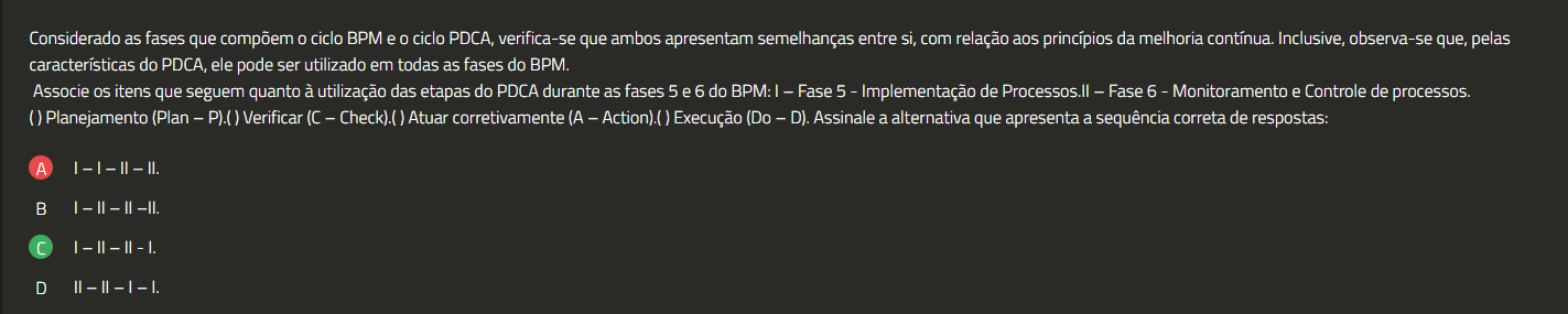 Considerado as fases que compõem ciclo BPM e ciclo PDCA, verifica-se que ambos apresentam semelhanças entre si, com relação aos princípios da melhoria contínua. Inclusive, observa-se que, pelas características do PDCA, ele pode ser utilizado em todas as fases do BPM. Associe os itens que seguem quanto à utilização das etapas do PDCA durante as fases 5 e 6 do BPM: I - Fase 5 - Implementação de - Fase 6 - Monitoramento e Controle de processos. () Planejamento (Plan - Verificar (C - Check).() Atuar corretivamente (A - Action).() Execução (Do - D). Assinale a alternativa que apresenta a correta de respostas: A I - I - II - II. B I - II - II -II. II - II - I. D II -