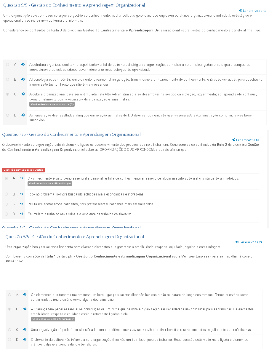 Questão 5/5 Gestão do Conhecimento e Aprendizagem Organizacional Ler em voz alta Uma organização em seus esforços de gestão do conhecimento, adotar políticas gerenciais que englobem planos organizacional e estratégico e operacional e que inclua normas formais e Considerando os conteúdos da Rota 3 da disciplina Gestão do Conhecimento e Aprendizagem Organizacional sobre gestão do conhecimento é correto afirmar que: A A estrutura organizacional tem 0 papel fundamental de definir a estratégia da organização, as metas a serem alcançadas e para quais campos do conhecimento os colaboradores devem direcionar seus esforços de aprendizado. A tecnologia é, sem dúvida, um elemento fundamental na transmissão e armazenamento de conhecimento, e já pode ser usada para substituir a transmissão tácito tácito que não é mais A cultura organizacional deve ser estimulada pela Alta Administração a se desenvolver no sentido da inovação, aprendizado comprometimento com a estratégia da organização e suas Você assinalou essa D A mensuração dos resultados atingidos em relação às metas de DO deve ser comunicada apenas para a Alta Administração como iniciativas bem- Questão 4/5 Gestão do Conhecimento e Aprendizagem Organizacional Ler em voz alta desenvolvimento da organização está diretamente ligado ao desenvolvimento das pessoas que nela Considerando os conteúdos da Rota 2 da disciplina Gestão do Conhecimento e Aprendizagem Organizacional sobre as ORGANIZAÇÕES QUE é correto afirmar que: Você não essa questão A conhecimento é visto como essencial e demonstrar falta de conhecimento a respeito de algum assunto pode afetar 0 status de um Você assinalou essa alternativa (A) Foco no sempre buscando soluções mais econômicas e Reluta em adotar novos conceitos, pois prefere manter conceitos mais estabelecidos Estimulam trabalho em equipe e ambiente de trabalho Questão 3/5 Gestão do Conhecimento e Aprendizagem Organizacional Ler em voz alta Uma organização boa para se trabalhar conta com diversos elementos que garantem a respeito, orgulho e Com base no da Rota 1 da disciplina Gestão do Conhecimento e Aprendizagem Organizacional sobre Melhores Empresas para se Trabalhar, é correto afirmar que: A Os elementos que tornam uma empresa um bom lugar para se trabalhar são básicos e não mudaram ao longo dos tempos. Temos questões como clima e salário como alguns dos B A liderança tem papel essencial na construção de um clima que permita à organização ser considerada um bom lugar para se Os elementos respeito e equidade estão diretamente ligados a ela. Você assinalou essa alternativa Uma organização poderá ser classificada como um ótimo lugar para se trabalhar se tiver benefícios surpreendentes, regalias e festas D elemento da cultura não influencia se a organização é ou não um bom local para se Essa questão está muito mais ligada a elementos práticos como salário ePouco flexível com regras, cargos e funções bem definidos. As pessoas tendem a ser mais acomodadas e pouco orientadas ao resultado. foco é na solução de A estrutura é mais flexível e tende a ser menos hierarquizada. As pessoas se organizam e trabalham orientadas a entregas e ( ) Poder centralizado no topo da A organização opera baseada na decisão da liderança, sempre focada no resultado. Organização menos focada na hierarquia. A estrutura é uma troca entre pessoas e visando 0 crescimento Agora selecione a alternativa que representa a sequência correta: A 1-4-2-3 B 3-2-4-1 C 4-1-3-2 D 2-3-1-4 Você assinalou essa alternativa (D) e as que e marque as paid as gangues são um exemplo atual de Organizações VERMELHAS, classificação dada aos bandos familiares do período anterior a 50000 a.C. São organizações lideradas através da força, que se perpetuam em ambientes II. () A Revolução Industrial inaugurou 0 modelo de estrutura PIRAMIDAL de organização. Com foco em processos e resultados, a estrutura organizacional permitia uma ascensão através da III. As organizações VERDES são uma resposta cultural às grandes perdas populacionais e culturais desencadeadas pelas grandes Existem processos e lideranças formais, mas 0 foco está direcionado às pessoas e suas IV. Atualmente as organizações estão mais focadas na evolução constante. Isso ocorre pois cenário atual é mais conhecido como VICA Incerto, Complexo e exigindo aprendizagem e inovação sistematica das empresas, que, para isso, se tornam cada vez menos hierarquizadas e mais adaptativas. Agora, assinale a alternativa que apresenta a sequência correta: Você não pontuou essa questão A B V-F-V-V C V-F-F-Vdo não de infringe do UNINTER disciplinates passibilidade de ligamento do de do no Questão 1/5 Gestão do Conhecimento e Aprendizagem Organizacional Ler em voz alta As organizações são sistemas formados de pessoas e relações que podem aprender através do entendimento de modelos Considerando os da Rota 1 da disciplina Gestão do Conhecimento e Aprendizagem Organizacional sobre a organização como sistema analise as alternativas a seguir: Neurônios e pessoas em uma organização podem ser comparados quando falamos de aprendizado organizacional Avelocidade e reforço de um conhecimento está diretamente ligado à quantidade e força das conexões entre esses elementos, tanto no como na organização II. conceito de rejuvenescimento celular mostra a necessidade de atualizar renovar sem perder a essência e identidade do É preciso que a identidade organizacional seja compartilhada e forte bastante para que não seja afetada pelas mudanças e renovações para a sustentabilidade da organização Através da Memoria e especialização das células de defesa, podemos entender que aprendizado pode ajudar as empresas a enfrentar novas ameaças e que esse conhecimento deve ser restrito e especializado para que essa resposta seja mais efetiva. comunicação nas empresas pode ser feita de diversas m