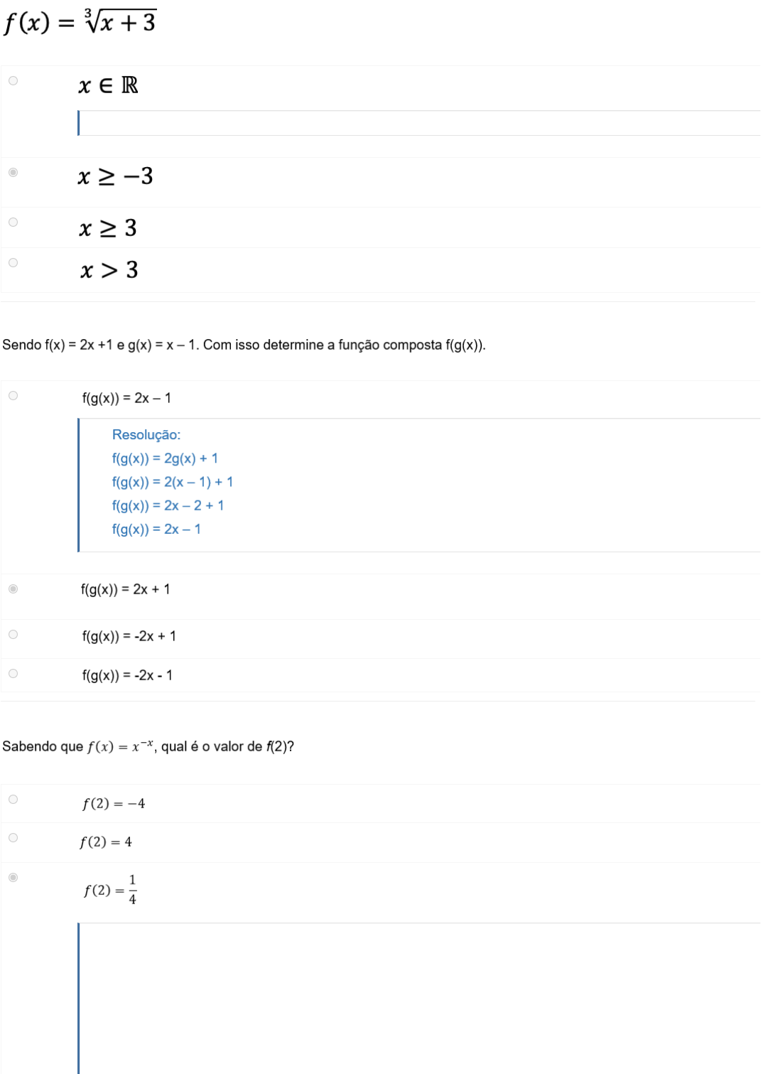 Ler em voz alta Ler em voz alta Ler em voz alta Questão 1/10 - Pré-Cálculo Qual o domínio dessa função: Nota: 0.0 Você não pontuou essa questão A . B . Você assinalou essa alternativa (B) C . D . Questão 2/10 - Pré-Cálculo Nota: 0.0 Você não pontuou essa questão A B Você assinalou essa alternativa (B) C D Questão 3/10 - Pré-Cálculo Nota: 10.0 A B C Você assinalou essa alternativa (C) Por ser um índice de raiz ímpar, vale qualquer valor Real. Você acertou! 31/01/2025, 23:44 AVA UNIVIRTUS https://univirtus.uninter.com/ava/web/?gad_source=1&gclid=Cj0KCQiAhvK8BhDfARIsABsPy4iTN8KAnFZ0BREMhaPfQiA2tnrlQk3JWGWYQn260… 1/4 javascript:void(0) javascript:void(0) javascript:void(0) Ler em voz alta Ler em voz alta D Questão 4/10 - Pré-Cálculo Selecione a alternativa que corresponde ao domínio da seguinte expressão fracionária: Nota: 0.0 Você não pontuou essa questão A B Você assinalou essa alternativa (B) C D Questão 5/10 - Pré-Cálculo Qual é o domínio da função: Nota: 0.0 Você não pontuou essa questão A B C Você assinalou essa alternativa (C) D . 31/01/2025, 23:44 AVA UNIVIRTUS https://univirtus.uninter.com/ava/web/?gad_source=1&gclid=Cj0KCQiAhvK8BhDfARIsABsPy4iTN8KAnFZ0BREMhaPfQiA2tnrlQk3JWGWYQn260… 2/4 javascript:void(0) javascript:void(0) Ler em voz alta Ler em voz alta Ler em voz alta Questão 6/10 - Pré-Cálculo Qual o domínio dessa função: . Nota: 0.0 Você não pontuou essa questão A . B . Você assinalou essa alternativa (B) C . D . Questão 7/10 - Pré-Cálculo Nota: 10.0 A B Você assinalou essa alternativa (B) C D Questão 8/10 - Pré-Cálculo Sendo f(x) = 3x + 1. Calcule f(2). Nota: 0.0 Você não pontuou essa questão A f(2) = 4 B f(2) = 6 Resolução: Por se tratar de uma raiz quadrada no denominador, temos que o domínio da função: x+1>0 x>-1, para valores Reais. Você acertou! 31/01/2025, 23:44 AVA UNIVIRTUS https://univirtus.uninter.com/ava/web/?gad_source=1&gclid=Cj0KCQiAhvK8BhDfARIsABsPy4iTN8KAnFZ0BREMhaPfQiA2tnrlQk3JWGWYQn260… 3/4 javascript:void(0) javascript:void(0) javascript:void(0) Ler em voz alta Ler em voz alta C f(2) = 3 Você assinalou essa alternativa (C) D f(2) = 7 Questão 9/10 - Pré-Cálculo Sendo f(x) = x + 1. Calcule f(1). Nota: 0.0 Você não pontuou essa questão A f(1) = 0 B f(1) = 2 C f(1) = 0 Você assinalou essa alternativa (C) D f(1) = -2 Questão 10/10 - Pré-Cálculo Nota: 0.0 Você não pontuou essa questão A B Você assinalou essa alternativa (B) C D Resolução: f(x) = 3x + 1 f(2) = 3.2 + 1 f(2) = 6 + 1 f(2) = 7 Resolução: f(x) = x + 1 f(1) = 1 + 1 f(1) = 2 31/01/2025, 23:44 AVA UNIVIRTUS https://univirtus.uninter.com/ava/web/?gad_source=1&gclid=Cj0KCQiAhvK8BhDfARIsABsPy4iTN8KAnFZ0BREMhaPfQiA2tnrlQk3JWGWYQn260… 4/4 javascript:void(0) javascript:void(0)