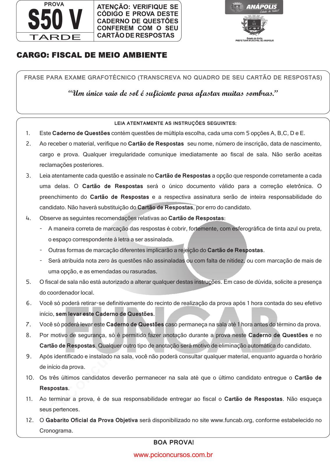 pcimarkpci MDAwMDowMDAwOjAwMDA6MDAwMDowMDAwOmZmZmY6YjExZTo4ODQz:RnJpLCAzMSBKYW4gMjAyNSAxODozODoxNyAtMDMwMA== www.pciconcursos.com.br CARGO: FISCAL DE MEIO AMBIENTE FRASE PARA EXAME GRAFOTÉCNICO (TRANSCREVA NO QUADRO DE SEU CARTÃO DE RESPOSTAS) “Um único raio de sol é suficiente para afastar muitas sombras.” S50 V ATENÇÃO: VERIFIQUE SE CÓDIGO E PROVA DESTE CADERNO DE QUESTÕES CONFEREM COM O SEU CARTÃO DE RESPOSTAS PROVA TARDE 1. Este contém questões de múltipla escolha, cada uma com 5 opções A, B,C, D e E. 2. Ao receber o material, verifique no seu nome, número de inscrição, data de nascimento, cargo e prova. Qualquer irregularidade comunique imediatamente ao fiscal de sala. Não serão aceitas reclamações posteriores. 3. Leia atentamente cada questão e assinale no a opção que responde corretamente a cada uma delas. O será o único documento válido para a correção eletrônica. O preenchimento do e a respectiva assinatura serão de inteira responsabilidade do candidato. Não haverá substituição do , por erro do candidato. 4. Observe as seguintes recomendações relativas ao : - A maneira correta de marcação das respostas é cobrir, fortemente, com esferográfica de tinta azul ou preta, o espaço correspondente à letra a ser assinalada. - Outras formas de marcação diferentes implicarão a rejeição do . - Será atribuída nota zero às questões não assinaladas ou com falta de nitidez, ou com marcação de mais de uma opção, e as emendadas ou rasuradas. 5. O fiscal de sala não está autorizado a alterar qualquer destas instruções. Em caso de dúvida, solicite a presença do coordenador local. 6. Você só poderá retirar-se definitivamente do recinto de realização da prova após 1 hora contada do seu efetivo início, . 7. Você só poderá levar este caso permaneça na sala até 1 hora antes do término da prova. 8. Por motivo de segurança, só é permitido fazer anotação durante a prova neste e no . Qualquer outro tipo de anotação será motivo de eliminação automática do candidato. 9. Após identificado e instalado na sala, você não poderá consultar qualquer material, enquanto aguarda o horário de início da prova. 10. Os três últimos candidatos deverão permanecer na sala até que o último candidato entregue o . 11. Ao terminar a prova, é de sua responsabilidade entregar ao fiscal o . Não esqueça seus pertences. 12. O será disponibilizado no site www.funcab.org, conforme estabelecido no Cronograma. Caderno de Questões Cartão de Respostas Cartão de Respostas Cartão de Respostas Cartão de Respostas Cartão de Respostas Cartão de Respostas Cartão de Respostas sem levar este Caderno de Questões Caderno de Questões Caderno de Questões Cartão de Respostas Cartão de Respostas Cartão de Respostas Gabarito Oficial da Prova Objetiva LEIA ATENTAMENTE AS INSTRUÇÕES SEGUINTES: BOA PROVA! www.pciconcursos.com.br pcimarkpci MDAwMDowMDAwOjAwMDA6MDAwMDowMDAwOmZmZmY6YjExZTo4ODQz:RnJpLCAzMSBKYW4gMjAyNSAxODozODoxNyAtMDMwMA== www.pciconcursos.com.br 02 Leia o texto abaixo e responda às questões propostas. TEXTO 1 Você já ouviu falar em uma mulher chamada Gro Harlem Brundtland? Ela foi primeira-ministra da Noruega há uns 20 anos e presidiu à comissão da ONU que criou o conceito de “sustentabilidade”. O que ela diz é bastante simples — que nós devemos “satisfazer as necessidades do presente sem comprometer a capacidade de garantir as necessidades do futuro”. Simples, mas não fácil. Por isso, atenção, pois, ainda que o Relatório Brundtland se refira à sustentabilidade planetária, quem lidera empresas, equipes ou simplesmente a si mesmo não pode ignorá-lo. Pensar no futuro não é só tarefa dos futurólogos ou preocupação dos ecologistas. É atributo de quem pensa estrategicamente. Todos temos necessidades e procuramos atendê-las rapidamente, pois provocam desconforto. Antigamente, precisávamos de comida, roupas, abrigo. Hoje, acrescentamos outras prioridades — educação, lazer, relações, tecnologia, comunicação, transporte. Além disso, mudou a frequência das necessidades. Consumimos hoje coisas de que precisaremos de novo amanhã e depois de amanhã. E assim por diante. Essa lógica nos obriga a pensar sobre a linha do tempo, pois temos de atender às necessidades pessoais de hoje lembrando das outras no futuro, próximo ou remoto. Vem daí a ideia da sustentabilidade pessoal. Nosso progresso não pode comprometer nossa fonte de riqueza. Medir se uma prestação cabe no orçamento e enfiar-se em uma dívida para comprar algo de que precisamos no momento pode prejudicar o orçamento por um bom tempo. E, como consequência, sacrificar as necessidades do amanhã. O conselho de Gro é para ser levado a sério na vida pessoal também, pois, no fundo, ele quer dizer que você até pode gastar hoje o que vai ganhar amanhã, desde que não perca de vista que amanhã você vai ter outras coisas para gastar. Desejos e recursos são passageiros do mesmo barco. Isso vale para o planeta, para uma empresa, para uma família e para cada um de nós. Além disso, sempre é bom lembrar que liderança começa por autoliderança. E que pensar estrategicamente é um ótimo começo. A sustentabilidade pessoal Atender às necessidades pessoais exige pensamento estratégico (MUSSAK, Eugênio. A sustentabilidade pessoal. S/A, mar.2008.Adaptado.) Revista Você LÍNGUA PORTUGUESA FUNCAB - Fundação Professor Carlos Augusto Bittencourt Arespeito do texto, analise as afirmativas a seguir: I. O texto se vale de fatos concretos (pesquisas, dados estatísticos, episódios históricos, etc.) para fundamentar os motivos que justificam a dif iculdade de se explicar a ideia de sustentabilidade. II. O autor trata o conceito de sustentabilidade no mesmo contexto proposto por Brundtland, fato comprovado pela criação do conceito de sustentabilidade. III. O autor trabalha com ideias disseminadas na sociedade e aceitas por ela e 