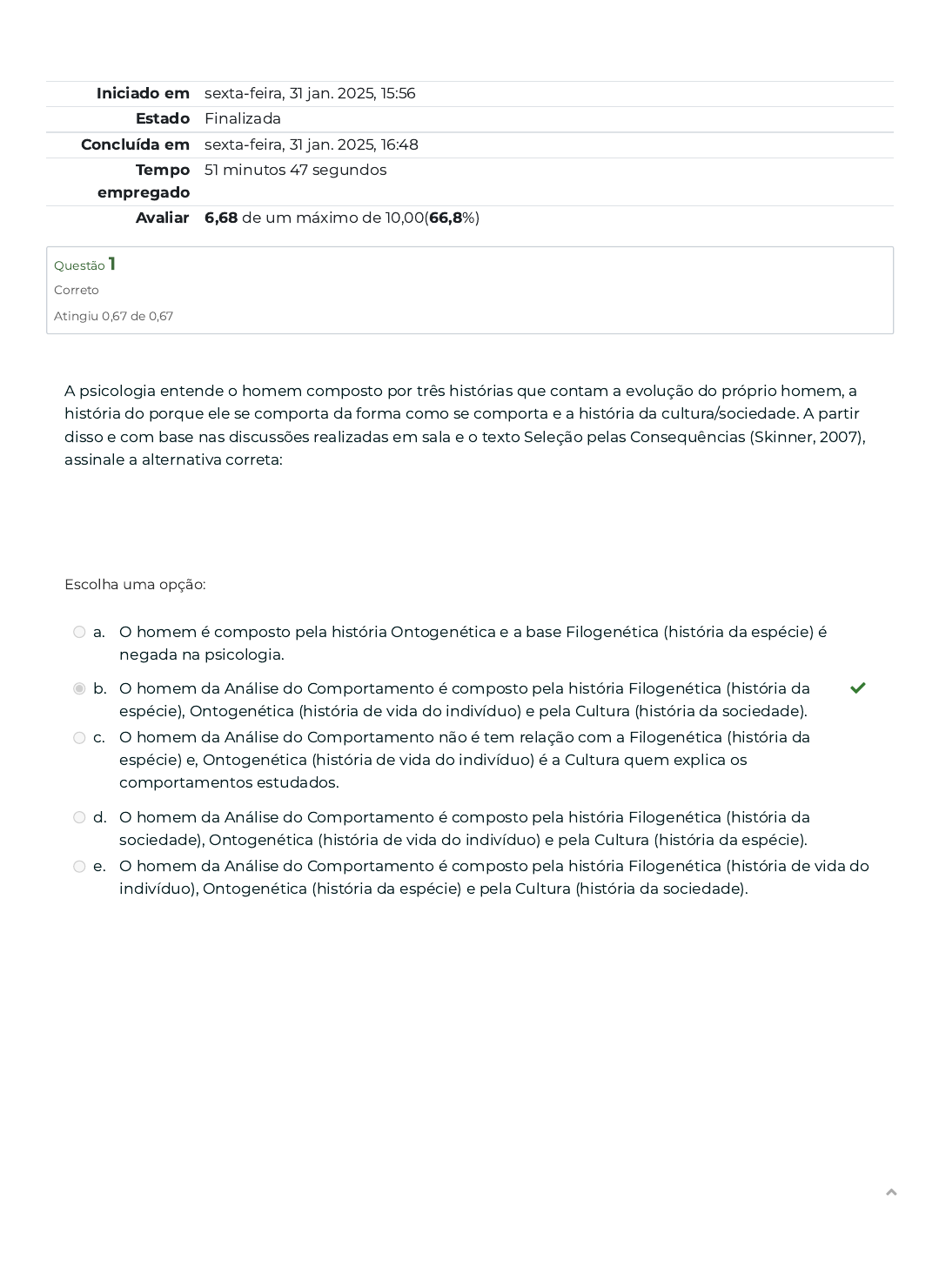 Iniciado em sexta-feira, 31 jan. 2025, 15:56 Estado Finalizada Concluída em sexta-feira, 31 jan. 2025, 16:48 Tempo empregado 51 minutos 47 segundos Avaliar 6,68 de um máximo de 10,00(66,8%) Questão 1 Correto Atingiu 0,67 de 0,67 Escolha uma opção: A psicologia entende o homem composto por três histórias que contam a evolução do próprio homem, a história do porque ele se comporta da forma como se comporta e a história da cultura/sociedade. A partir disso e com base nas discussões realizadas em sala e o texto Seleção pelas Consequências (Skinner, 2007), assinale a alternativa correta: a. O homem é composto pela história Ontogenética e a base Filogenética (história da espécie) é negada na psicologia. b. O homem da Análise do Comportamento é composto pela história Filogenética (história da espécie), Ontogenética (história de vida do indivíduo) e pela Cultura (história da sociedade). c. O homem da Análise do Comportamento não é tem relação com a Filogenética (história da espécie) e, Ontogenética (história de vida do indivíduo) é a Cultura quem explica os comportamentos estudados. d. O homem da Análise do Comportamento é composto pela história Filogenética (história da sociedade), Ontogenética (história de vida do indivíduo) e pela Cultura (história da espécie). e. O homem da Análise do Comportamento é composto pela história Filogenética (história de vida do indivíduo), Ontogenética (história da espécie) e pela Cultura (história da sociedade). Questão 2 Correto Atingiu 0,67 de 0,67 Escolha uma opção: A contingência de três termos ou tríplice contingência é a forma de representação do comportamento, S: R -> C, em que indica o ambiente (S) em que o comportamento ocorre, a resposta/ação (R) do organismo em determinada situação, e a consequência (C) que controla e mantém o comportamento ocorrendo. Sobre a contingência assinale a alternativa correta: I. A contingência de três termos é considerada a unidade básica de análise do comportamento, uma vez que para o fenômeno ser estudado é importante identificar seus componentes mais simples e básicos. II. A contingência de três termos é definida como a relação de dependência entre os termos: o estímulo, a resposta e a consequência, isto é, o comportamento para ser denominado como tal depende de que essa relação seja estabelecida. II. Os behaviorismos anteriores ao behaviorismo radical utilizam-se da tríplice contingência para a explicação do comportamento. IV. Os analistas do comportamento utilizam a tríplice contingência a fim de descrever o comportamento e identificar sua relação funcional. V. Os analistas do comportamento têm como tarefa principal observar a tríplice contingência e manipular as variáveis que controlam o comportamento. a. As asserções II, IV e V estão corretas. b. As asserções I, IV e V estão corretas. c. As asserções I, II, IV e V estão corretas. d. As asserções I, II, III, e IV estão corretas. e. As asserções I, II, e III estão corretas. Questão 3 Correto Atingiu 0,67 de 0,67 Escolha uma opção: Sabe-se que o conhecimento científico é construído de maneira continuada, isto é, conforme a produção de estudos, experimentos e discussões novos paradigmas são construídos e os anteriores caem em desuso. Sobre as bases filosóficas e históricas da ciência do comportamento assinale a alternativa correta: a. O Behaviorismo Metodológico criticava a falta de replicabilidade dos estudos da introspecção, desse modo, passou a considerar tanto os comportamentos observáveis e privados para a compreensão do comportamento. b. O Behaviorismo Radical em contraposição ao Behaviorismo Metodológico rompe com a noção de comportamento, utilizando-se da cognição e do comportamento observável como objeto de estudo. c. O Behaviorismo Radical rompe com o Behaviorismo Metodológico na medida em o selecionismo se torna o modelo explicativo dessa proposta de compreensão da ciência comportamental. d. O Behaviorismo Metodológico criticava a falta de replicabilidade dos estudos da introspecção, desse modo, passou a considerar tanto os comportamentos observáveis e privados para a compreensão do comportamento. e. O Behaviorismo Radical tem como modelo explicativo o método experimental que dá condições de compreensão do comportamento sob seu aspecto empírico e laboratorial. Questão 4 Correto Atingiu 0,67 de 0,67 Escolha uma opção: A Análise do Comportamento, assim como outras teorias da psicologia, utiliza modelos de pesquisa experimentais, uma vez que se propõe a ser uma ciência. De acordo com Sampaio et al (2008, p. 151) “A experimentação é um modo fundamental de produzir conhecimento no mundo contemporâneo.”. Sobre os modelos de experimentação produzidos no campo dessa ciência, julgue as alternativas com V para Verdadeiro e F para falso: ( ) Os delineamentos do tipo ABAB são restritos quanto ao modo de testagem, uma vez que apenas quatro condições, duas experimentais e duas controle, são possíveis nesse modelo. ( ) Os delineamentos de sujeito único têm como característica principal tratar os sujeitos individualmente, tanto no que se refere às decisões relativas ao próprio delineamento, quanto ao processamento dos dados. ( ) Os experimentos com delineamento de mudança de critério começam com uma condição experimental e posteriormente é realizada a condição controle. A característica principal desse delineamento é que a condição experimental é constituída de subfases. ( ) O delineamento ABAB propõe condições experimentais e controle de forma a construir sucessivas comparações entre condições controle e experimentais em um mesmo experimento. ( ) A condição de Linha de Base ou Nível Operante (NO) tem como objetivo verificar quais comportamentos estão presentes no repertório do sujeito antes da introdução de uma variável no procedimento a. A sequência 
