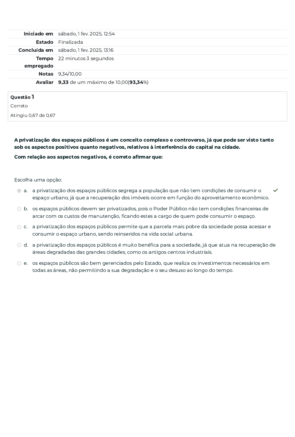 Iniciado em sábado, 1 fev. 2025, 12:54 Estado Finalizada Concluída em sábado, 1 fev. 2025, 13:16 Tempo empregado 22 minutos 3 segundos Notas 9,34/10,00 Avaliar 9,33 de um máximo de 10,00(93,34%) Questão 1 Correto Atingiu 0,67 de 0,67 A privatização dos espaços públicos é um conceito complexo e controverso, já que pode ser visto tanto sob os aspectos positivos quanto negativos, relativos à interferência do capital na cidade. Com relação aos aspectos negativos, é correto afirmar que: Escolha uma opção: a. a privatização dos espaços públicos segrega a população que não tem condições de consumir o espaço urbano, já que a recuperação dos imóveis ocorre em função do aproveitamento econômico. ✓ b. os espaços públicos devem ser privatizados, pois o Poder Público não tem condições financeiras de arcar com os custos de manutenção, ficando estes a cargo de quem pode consumir o espaço. c. a privatização dos espaços públicos permite que a parcela mais pobre da sociedade possa acessar e consumir o espaço urbano, sendo reinseridos na vida social urbana. d. a privatização dos espaços públicos é muito benéfica para a sociedade, já que atua na recuperação de áreas degradadas das grandes cidades, como os antigos centros industriais. e. os espaços públicos são bem gerenciados pelo Estado, que realiza os investimentos necessários em todas as áreas, não permitindo a sua degradação e o seu desuso ao longo do tempo. Questão 2 Correto Atingiu 0,67 de 0,67 Questão 3 Correto Atingiu 0,67 de 0,67 Os assentamentos urbanos foram surgindo e se desenvolvendo ao longo dos anos, conforme suas condições e peculiaridades de cada núcleo familiar. Sobre a linha do tempo e o desenvolvimento desses assentamentos, marque a alternativa correta: Escolha uma opção: a. As praças, poços, oratórios e vias públicas começaram a aparecer nos assentamentos urbanos no período de 11.000 anos antes de Cristo. b. Os assentamentos urbanos começaram a se desenvolver mais precisamente há 10.000 anos a.C., por meio do cultivo da agricultura. ✓ c. O aumento expressivo da população e o desenvolvimento de diversas atividades, como a Metalurgia, por exemplo, apareceram nos assentamentos no ano de 10.000 a.C. d. No ano 9.000 antes de Cristo, as unidades habitacionais de cada assentamento urbano se igualavam por serem sobrados de barro. e. Há registros de que os primeiros assentamentos urbanos surgiram em torno de 12.000 anos antes de Cristo, na região do Mediterrâneo. O período feudal, entre os séculos V e XV, teve caráter específico de organização social, político e cultural. Esse caráter teve como consequência uma mudança profunda no papel das cidades, que passaram a: Escolha uma opção: a. ganhar importância pelas mudanças espaciais nos feudos, o que possibilitou um comércio em âmbito global por meio do desenvolvimento de redes de comunicação no período. b. perder sua influência local com a consolidação das redes urbanas e a formação de metrópoles controladas por governos laicos. c. perder sua importância, pois a maioria da população começou a viver nos feudos, cuja principal característica eram as atividades agrícolas. ✓ d. ganhar importância, e começa nesse momento a diferenciação entre rural e urbano, e o agronegócio une esses dois espaços pelo uso de tecnologias e comércio. e. ter maior relevância, pois os feudos estavam voltados para o comércio e o desenvolvimento da ciência e da tecnologia produtiva. Questão 4 Incorreto Atingiu 0,00 de 0,67 Questão 5 Correto Atingiu 0,67 de 0,67 Questão 6 Correto Atingiu 0,67 de 0,67 Uma das classificações dos atos administrativos diz respeito à sua precariedade, isto é, à possibilidade de poderem ser revogados ou não pela administração. Dentre as alternativas a seguir, qual é um exemplo de ato perene? Escolha uma opção: a. Fiscalização de obra. b. Plano Diretor. × c. Projeto arquitetônico. d. Autorização. e. Licença para construir. Uma leitura da trajetória do crescimento populacional em escala mundial mostra que ele não é contínuo. Apresenta, de acordo com o contexto histórico e geográfico, contradições e variações que os estudos populacionais interpretam como fases do crescimento demográfico. Nesse sentido, é possível dizer que a primeira fase do crescimento populacional é identificada por: Escolha uma opção: a. estabilização e posterior declínio do crescimento demográfico. b. aumento do crescimento demográfico. ✓ c. declínio do crescimento geográfico. d. aumento e posterior estabilização do crescimento demográfico. e. estabilização do crescimento demográfico. Dentro do contexto de desenvolvimento global de uma região, os projetos de drenagem urbana devem ser orientados, de maneira geral, por objetivos principais. Portanto, assinale a alternativa INCORRETA abaixo entre os objetivos listados. Escolha uma opção: a. Preservar somente as várzeas que são urbanizadas numa condição que minimize as interferências com o escoamento das vazões de cheias. ✓ b. Reduzir a exposição da população e das propriedades ao risco de inundações. c. Minimizar os problemas de erosão e sedimentação. d. Reduzir sistematicamente o nível de danos causados pelas inundações. e. Assegurar que as medidas corretivas sejam compatíveis com as metas e objetivos globais da região. Questão 7 Correto Atingiu 0,67 de 0,67 Questão 8 Correto Atingiu 0,67 de 0,67 A forma das cidades é definida tanto pelas ações das pessoas que a ocupam quanto pela legislação que estabelece os parâmetros, os critérios e as diretrizes de uso do espaço urbano. A lei que atribui aos municípios o papel de elaborar o instrumento básico da política de desenvolvimento e de expansão urbana é a seguinte: Escolha uma opção: a. Plano Diretor. b. Código Civil. c. Constituição Federal. ✓ d. Norma da ABNT. e. Estatuto da Cidade. Pode-se afirmar que o s